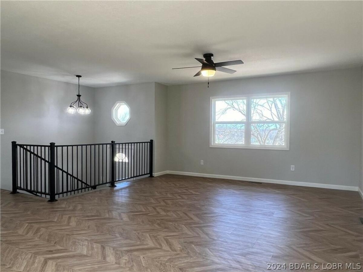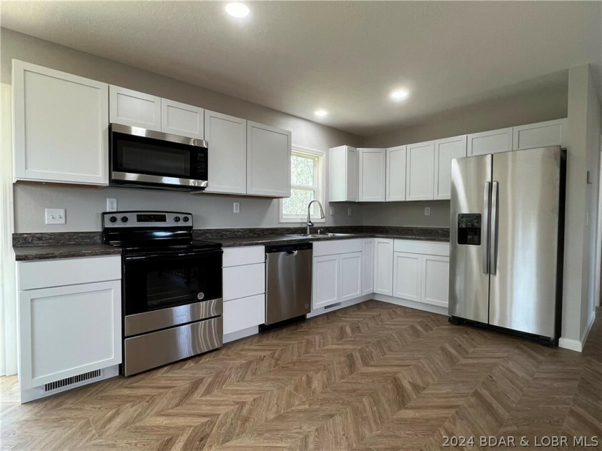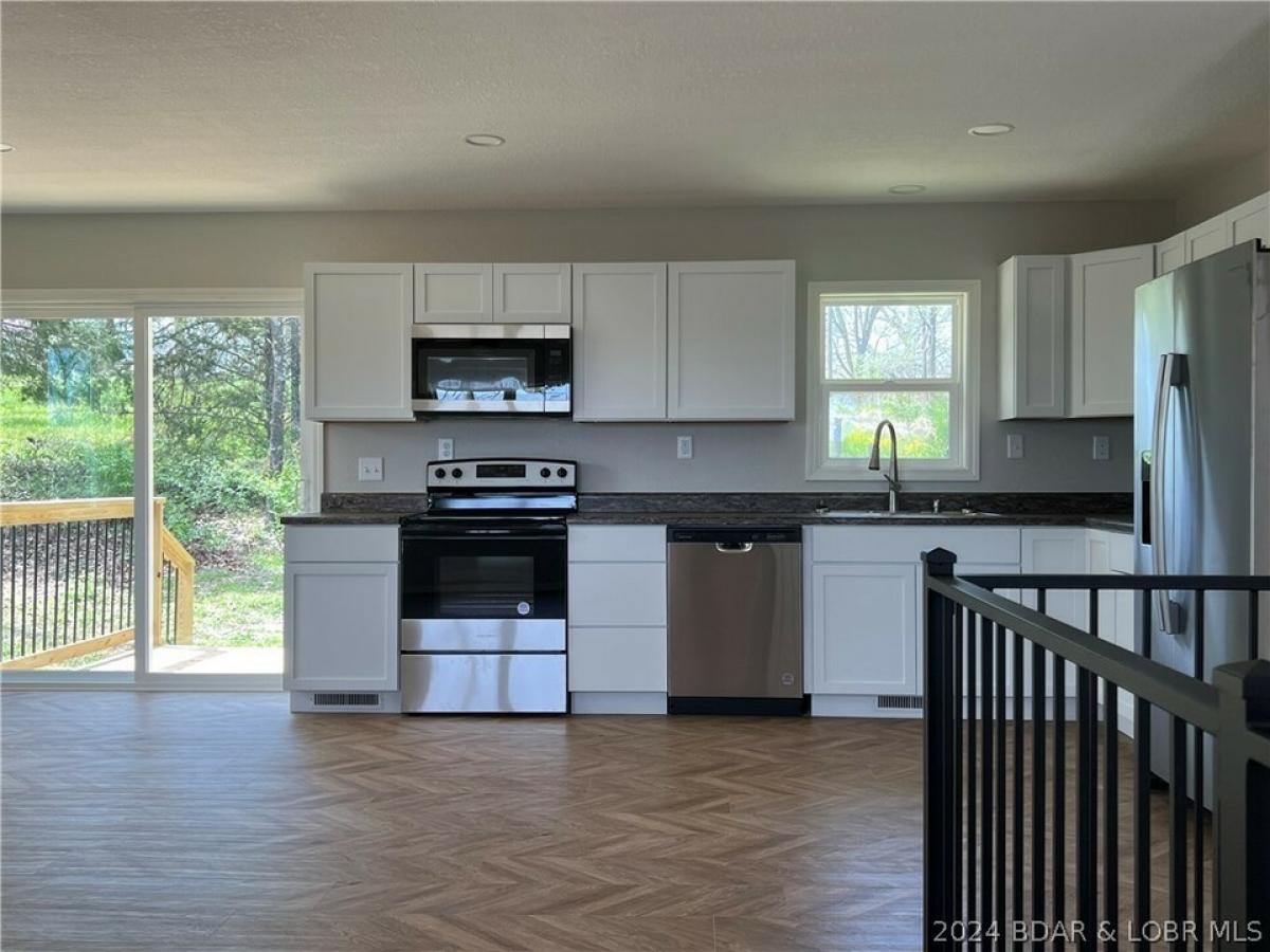BRAND SPANKING NEW! Home has a warm cozy vibe as you cross the threshold! READY for you to add your personal touches and make this JEWEL your own! Open concept living room/cuisine area! Kitchen boosts of bright white cabinets w/recessed panel doors, complemented by darker countertops/backsplash, recessed lighting, stainless appliances and all elevated by the vinyl laminate plank flooring. Upper level bedroom has it's own private deck ready for you to enjoy your morning brew. Lower level bedroom is perfectly suited for the master, family room, office and or game/craft room..........Oversized single car garage complete with storage. Located in a pleasant quaint neighborhood that is close to the school and library. This humble abode is ONLY 13 miles from Camdenton city square and on city water. PERFECT for that first home buyer or if you're wanting to downsize.