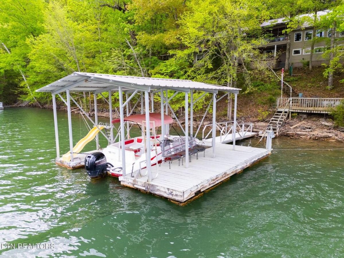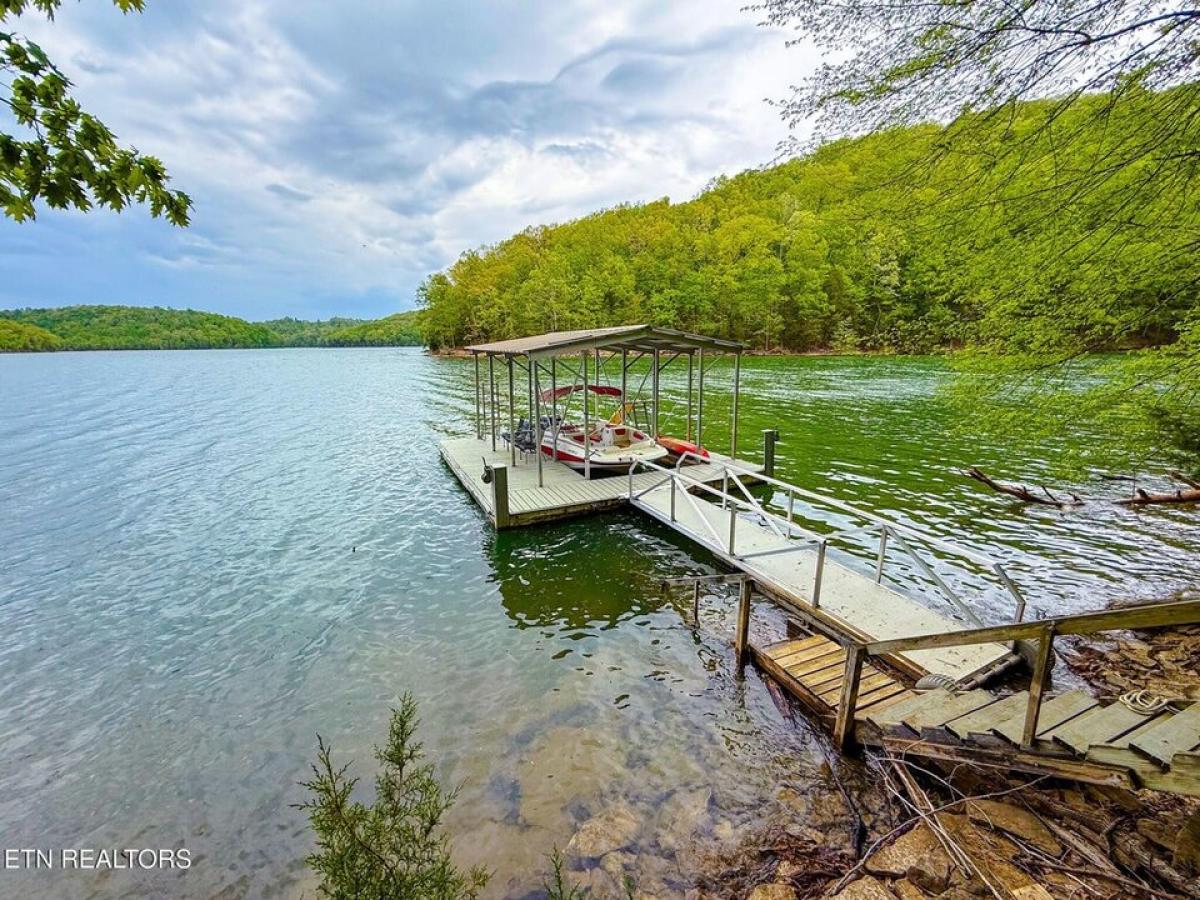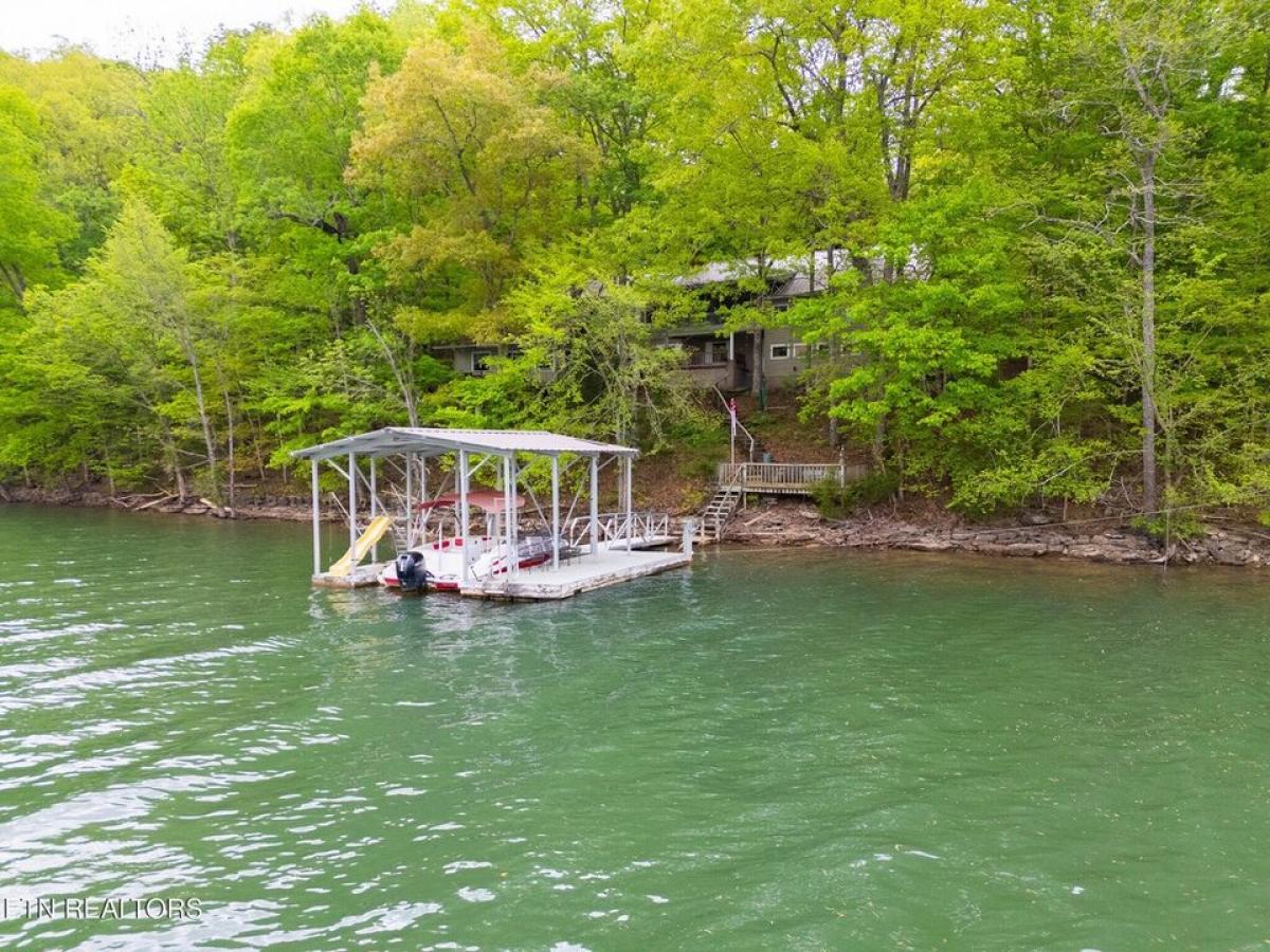 Lakefront Paradise: Waterfront Estate with Private Cove, 220 feet of Norris Lake shoreline. Unrestricted property, TVA permitted Floating Dock, 10 miles off I-75 Norris Exit. Welcome to this extraordinary lakefront property featuring approximately 3,500 square feet of living space situated on a private one-acre lot with 220 feet of pristine shoreline. This 1960s gem combines vintage charm with modern updates to create the perfect waterfront retreat. This exceptional property boasts a private cove with 220 feet of shoreline and no TVA restrictions, giving you the freedom to trim trees and landscape as desired. The TVA-approved dock, grandfathered in and built in 2005, offers year-round 15-foot water depth and prime location on the main channel. TVA Permit in Docs. Step inside to discover a soaring 13-foot ceiling with a gabled living room enhanced with skylights and new recessed lighting. The home showcases original beautifully refinished cherry wood floors with thin planking and preserved 1960 woodwork throughout. Premium interior finishes include maple walls, knotty pine, and oak floors. The stunning wood-burning fireplace insert with custom marble hearth serves as the centerpiece of the living room, while the primary bedroom features its own fireplace. The kitchen impresses with quartz countertops and premium appliances including KitchenAid dishwasher, LG refrigerator, and gas stove. Cedar closets provide natural protection for seasonal items. A custom built-in office desk and shelving with lake views offers an inspiring workspace. With 3 bedrooms, 2 full bathrooms including a shower with cultured marble walls and floor, and charming pocket doors in select rooms, this home combines functionality with character. The multi-level design creates interesting transitions throughout the various spaces. Pella windows showcase the lakeview and the home has been updated with a tin roof installed in 2020, completely updated wiring and plumbing in 2002, and a heat pump from 2008 complemented by an extra LG air conditioner from 2009. The water heater was replaced in 2017. The property is served by public water, though the original well remains on site but is not operational. The home uses a septic sewer system and currently operates on propane, with natural gas available at the road. Enjoy a workshop space also in the basement, and an upstairs craft room perfect for creative pursuits.This rare lakefront estate offers the perfect blend of historic character, modern amenities, and unbeatable waterfront living. Schedule your showing today!