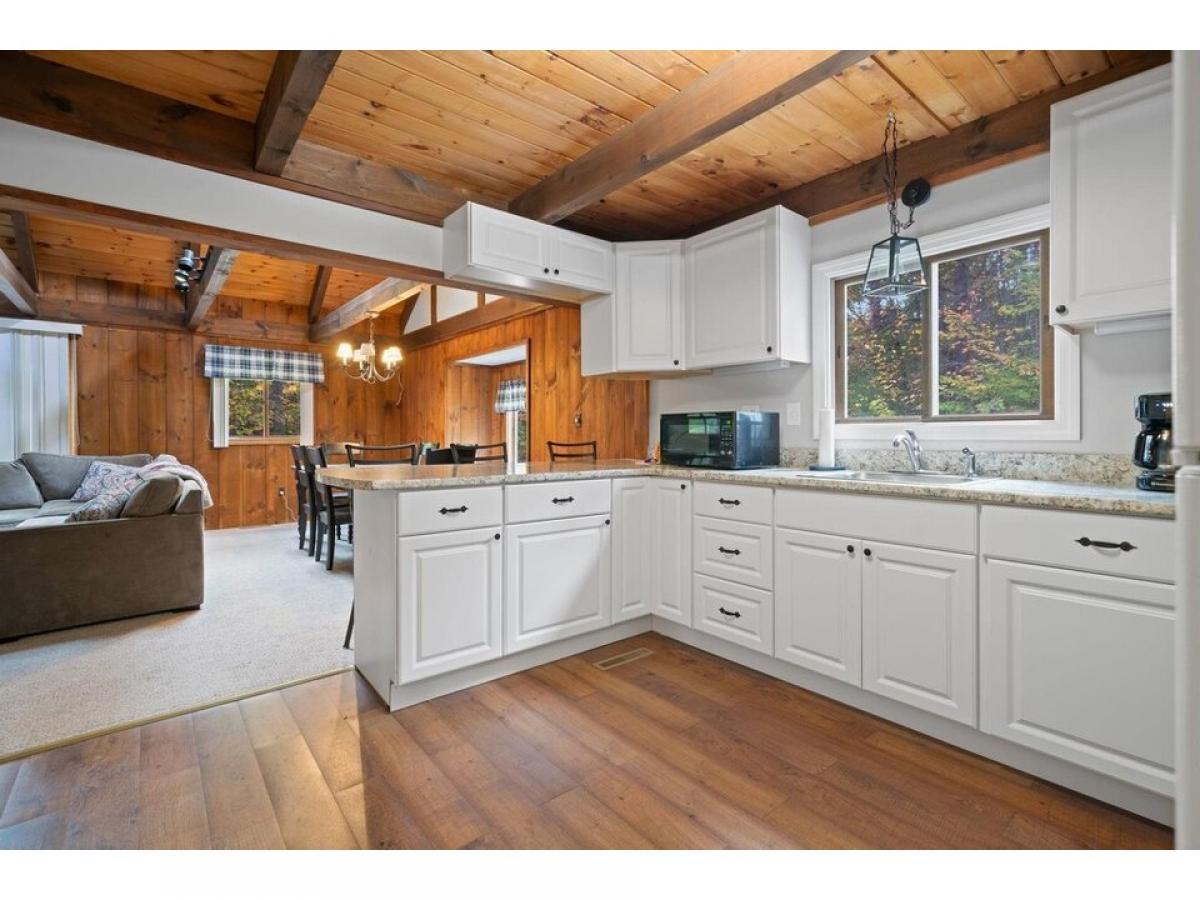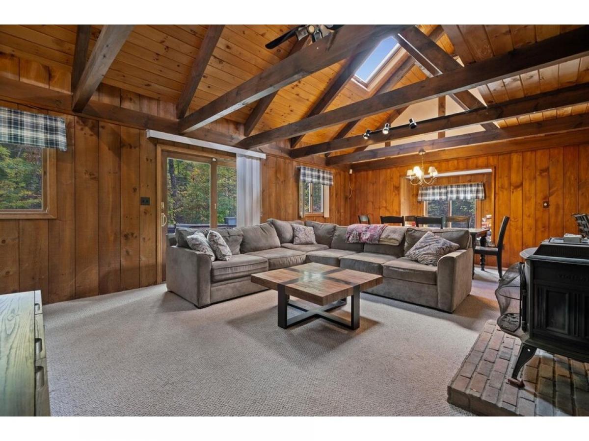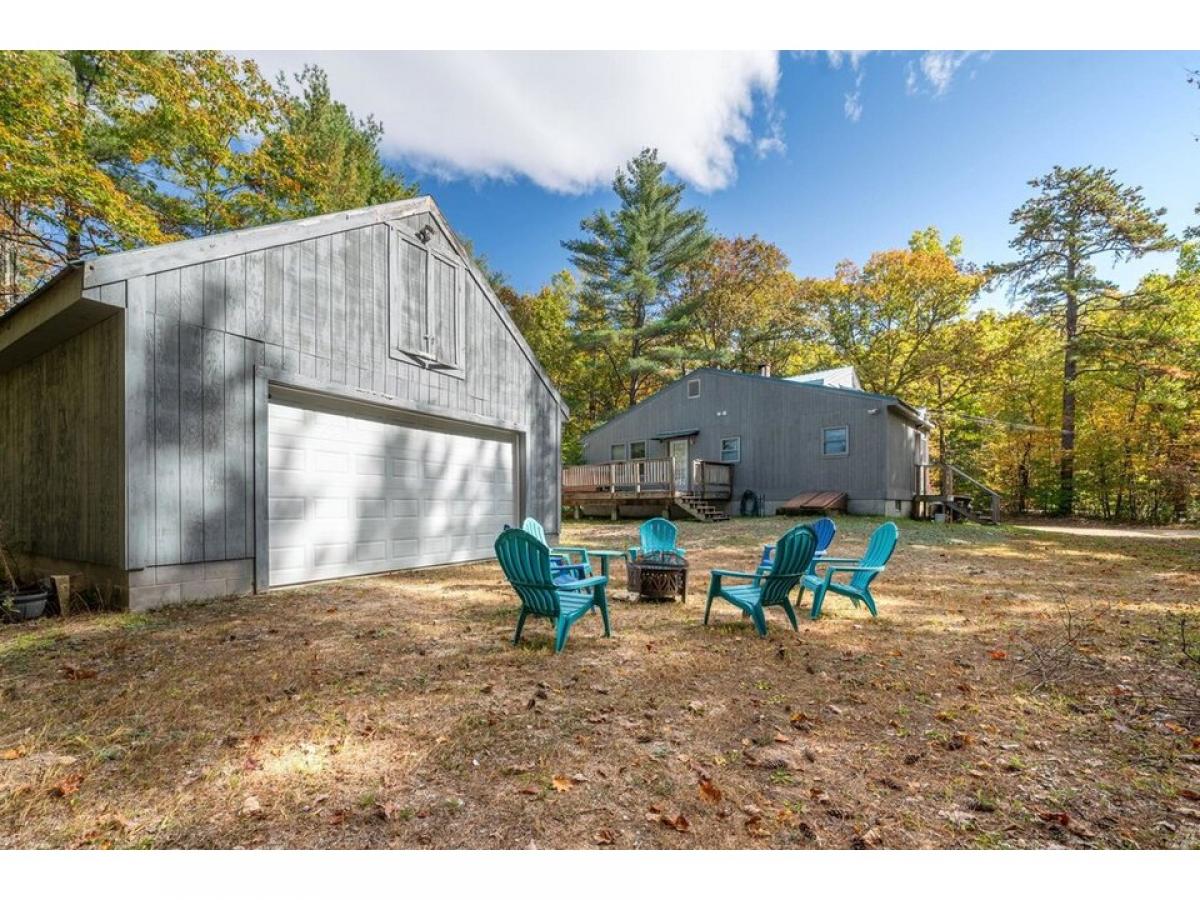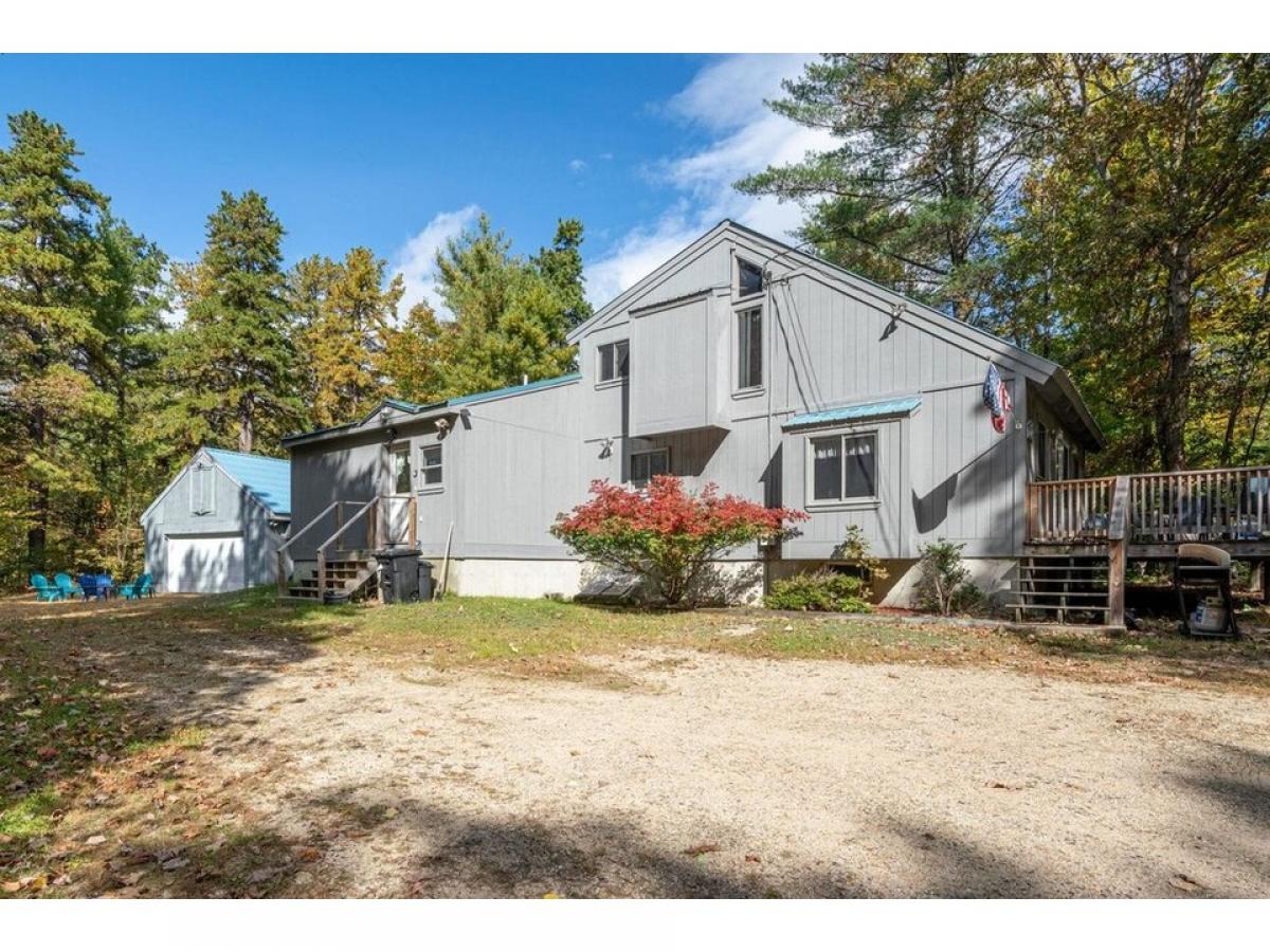 Lake Ossipee Village. Discover your dream retreat in this contemporary home, featuring 4 bedrooms, 3 full baths, 2 living rooms, mudroom, office, laundry and a newer detached two-car garage. Enjoy access to a beautiful sandy beach on Broad Bay, Ossipee Lake! Expanded in 2002, this home boasts a luxurious primary suite with a private bath, jet tub, separate shower, double sink vanity, and walk-in closet. Relax on your private back deck, complete with a six-person hot tub. The first floor features an open layout, highlighted by a spacious living/dining area with a brick hearth and wood stove, cathedral beamed ceilings, and sliding glass doors leading to a private front deck. The new kitchen is a great place for gathering with a breakfast bar peninsula .A versatile second bedroom or office and a full bath complete the main level. Upstairs, find two additional bedrooms and a third full bath, all overlooking the airy living space below. The recently refinished lower level includes a finished family room, bonus room/office and a generous unfinished area for storage or a workshop. Recent updates include a newer metal roof, new water heater, new carpet and an updated septic system. This well-maintained home is move-in ready and perfect for creating lasting memories! Don#039;t miss out on this exceptional opportunity.