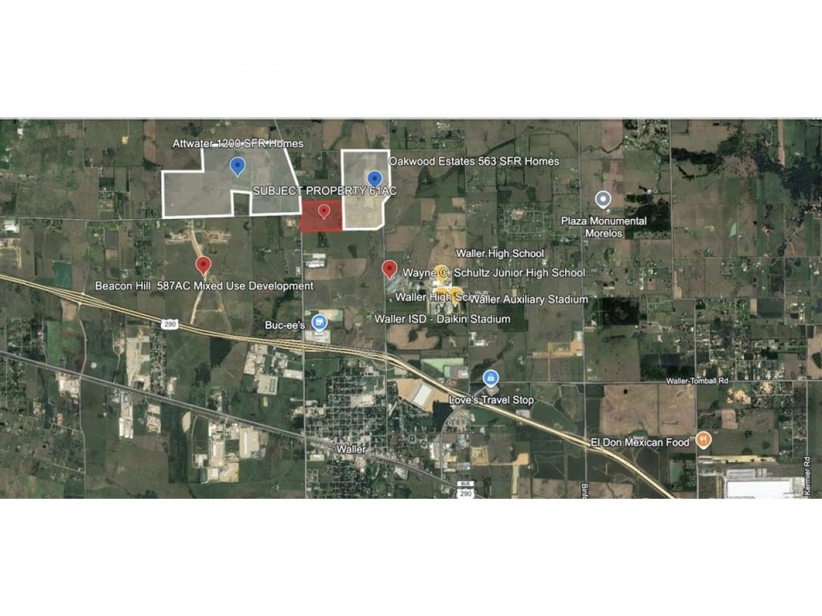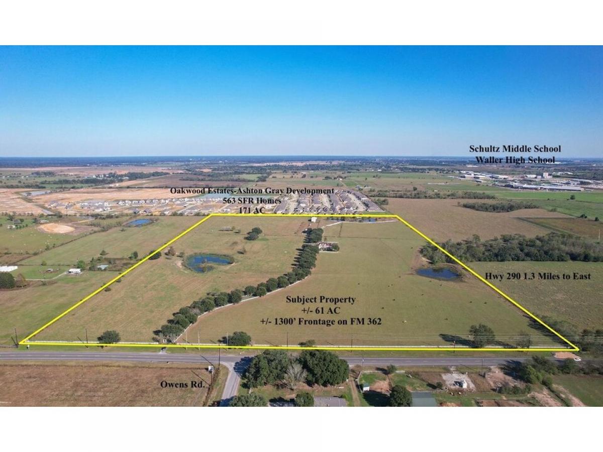 This prime 61 AC tract is located just 1.3 miles from Hwy 290 and is in the path of significant growth, presenting a development opportunity.Over 1,300 feet of frontage on FM 362 the tract backs up to the 573 lot Oakwood Estates neighborhood,Across 362 Attwater is under construction w/ 1200 lots.Subject is surrounded by numerous developments.Four schools within 3 miles.Unrestricted and with an ag exemption, the property is well-suited for development or as a private homestead. It includes a beautiful 4-bedroom, 3.5-bath home with 4,492 square feet of living space, complete with a pool, making it ideal for comfortable living. Additional features include two outbuildings, two wells, close proximity to MUD districts, and is fully fenced and cross fenced. Two on-site ponds add to the appeal of this versatile property. Its strategic location and unrestricted status make it highly attractive for development of multiple commercial uses in an area poised for rapid expansion.