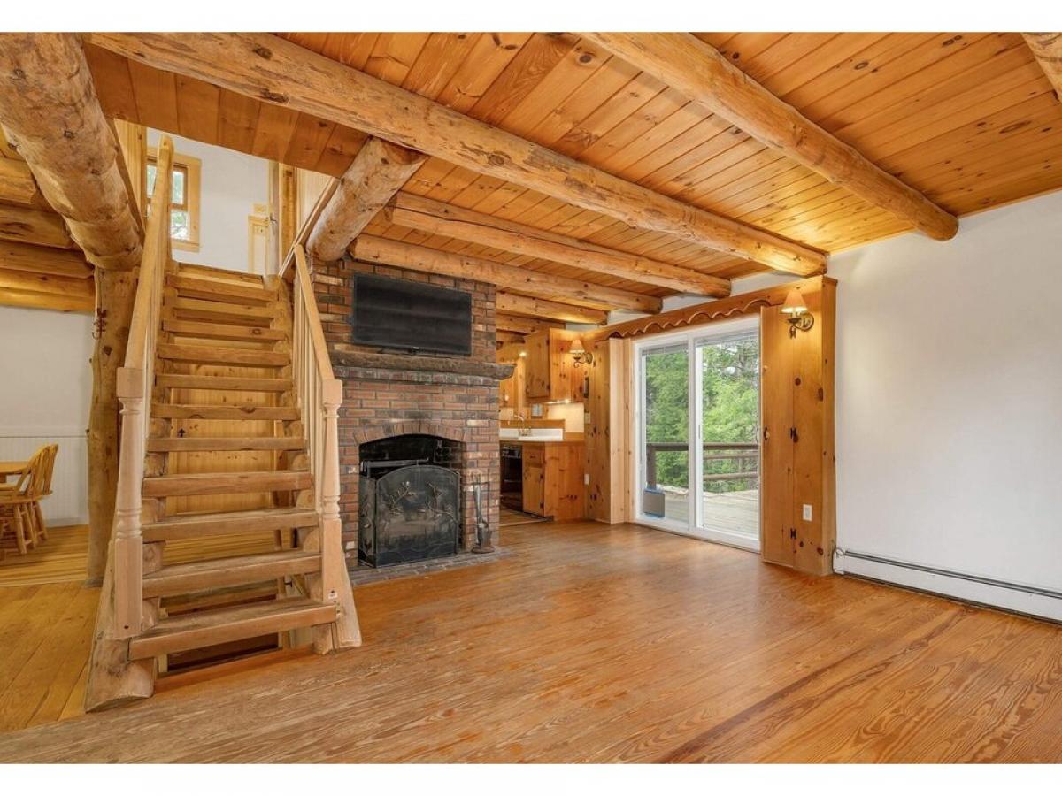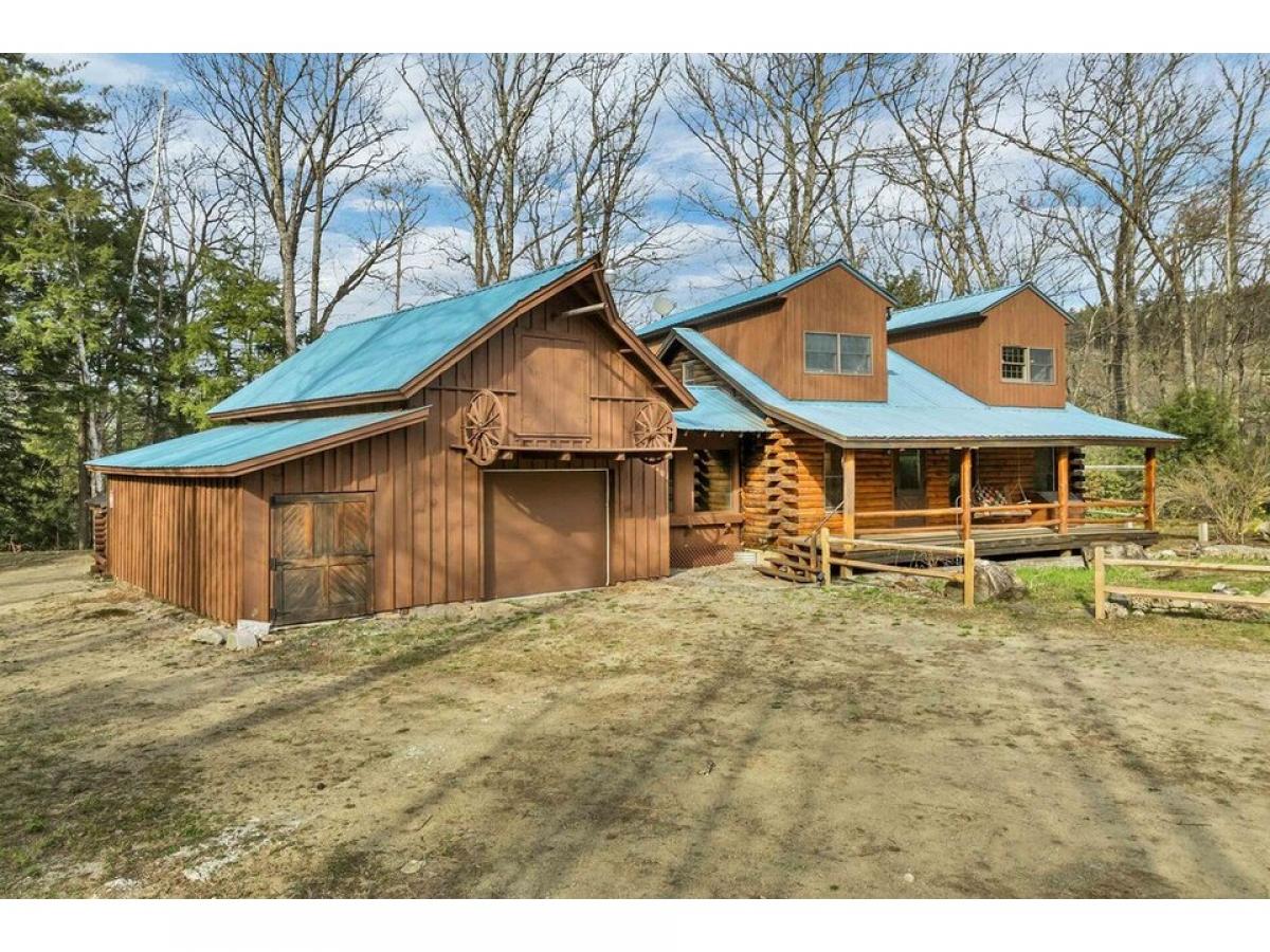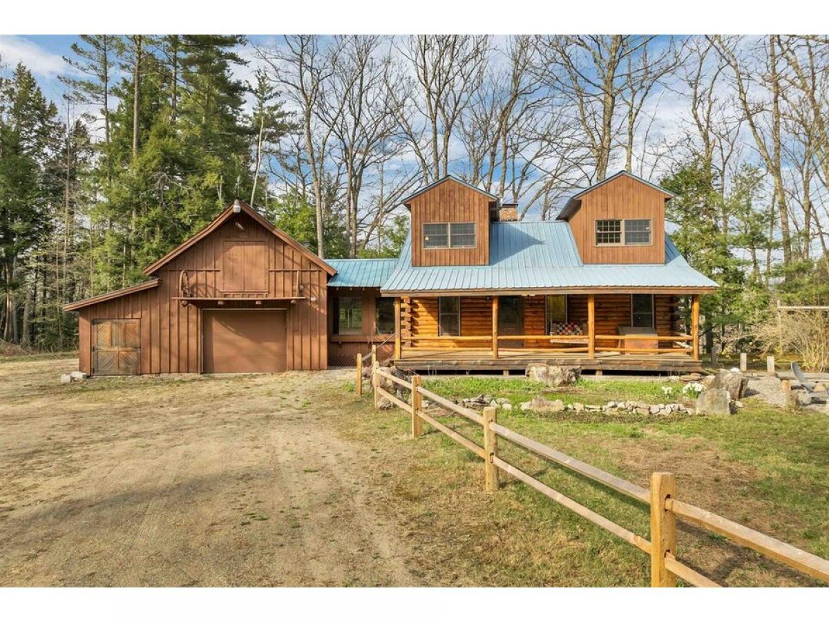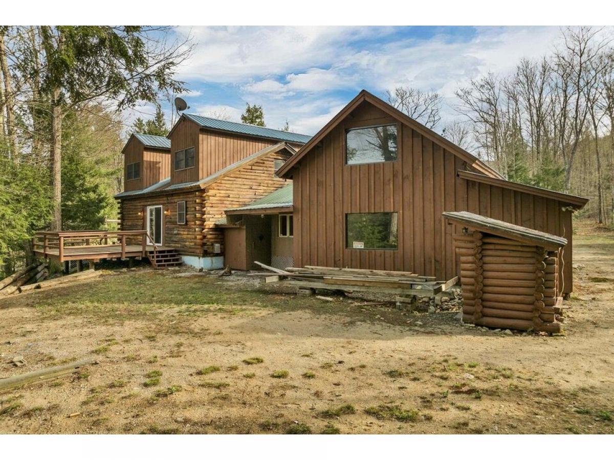 Log cabin retreat next to snowmobile trail with views of Stinson Mountain. Spacious southerly facing covered front porch with fire pit to enjoy evenings year round. Enjoy the sound of water burbling from a creek nearby across the road. Open floor plan around a central wood burning fireplace opening out on to a spacious deck with filtered views of the mountains. Log cabin interior features a bedroom and 5 piece bath on the first floor, along with a rustic kitchen with farmerrsquo;s sink, and living room with fireplace. 1st floor bonus room and oversized garage with unfinished storage above. 3 recently renovated bedrooms and a full bath on the second floor (3 BR septic). Full basement wired and studded for potential additional living area with a wood stove and walkout bulkhead. Brand new forced hot water heating system. Minutes from Rumney Rocks, Polar Caves, snowmobiling, Ragged Ski Area, and Plymouth.