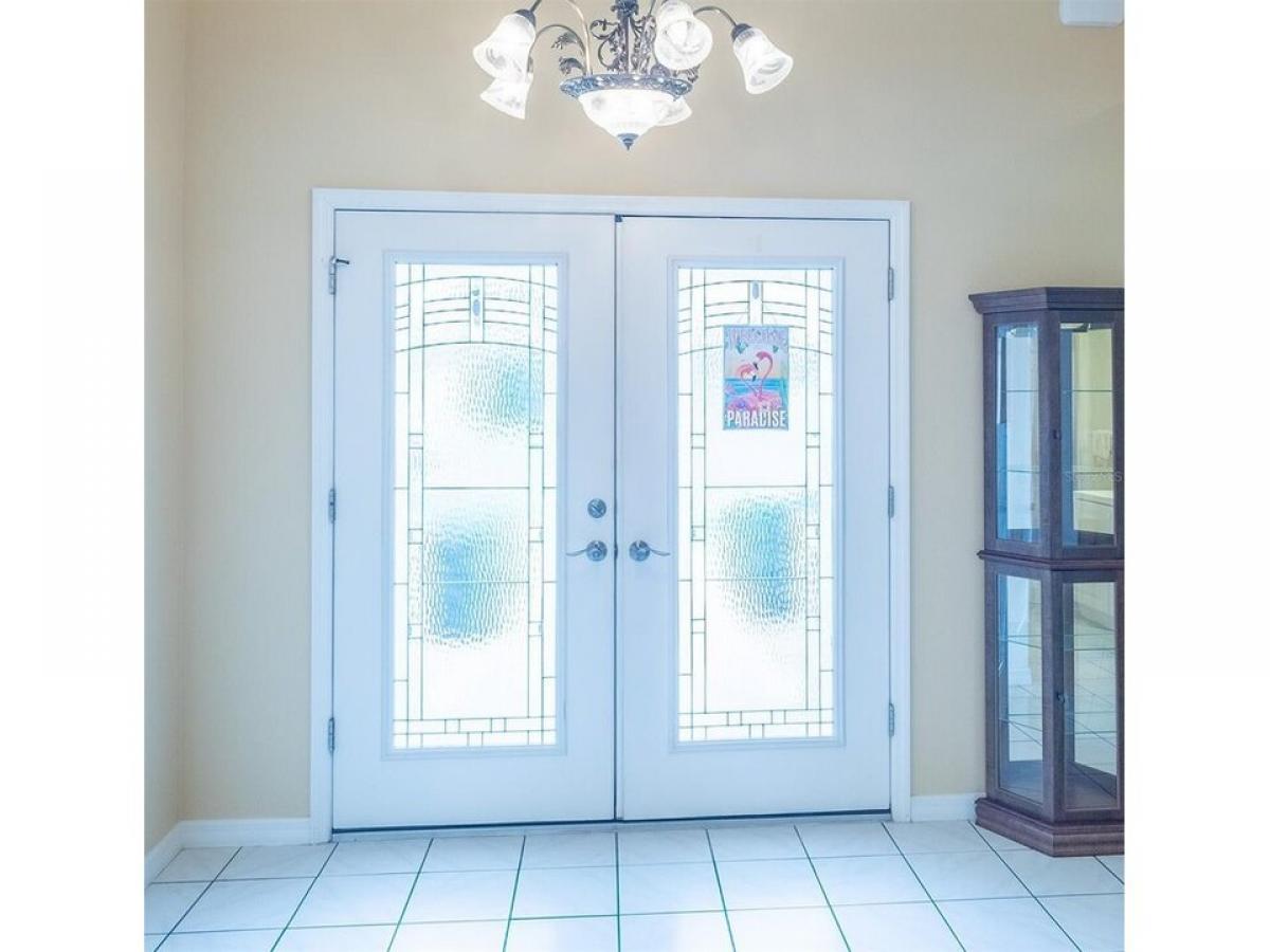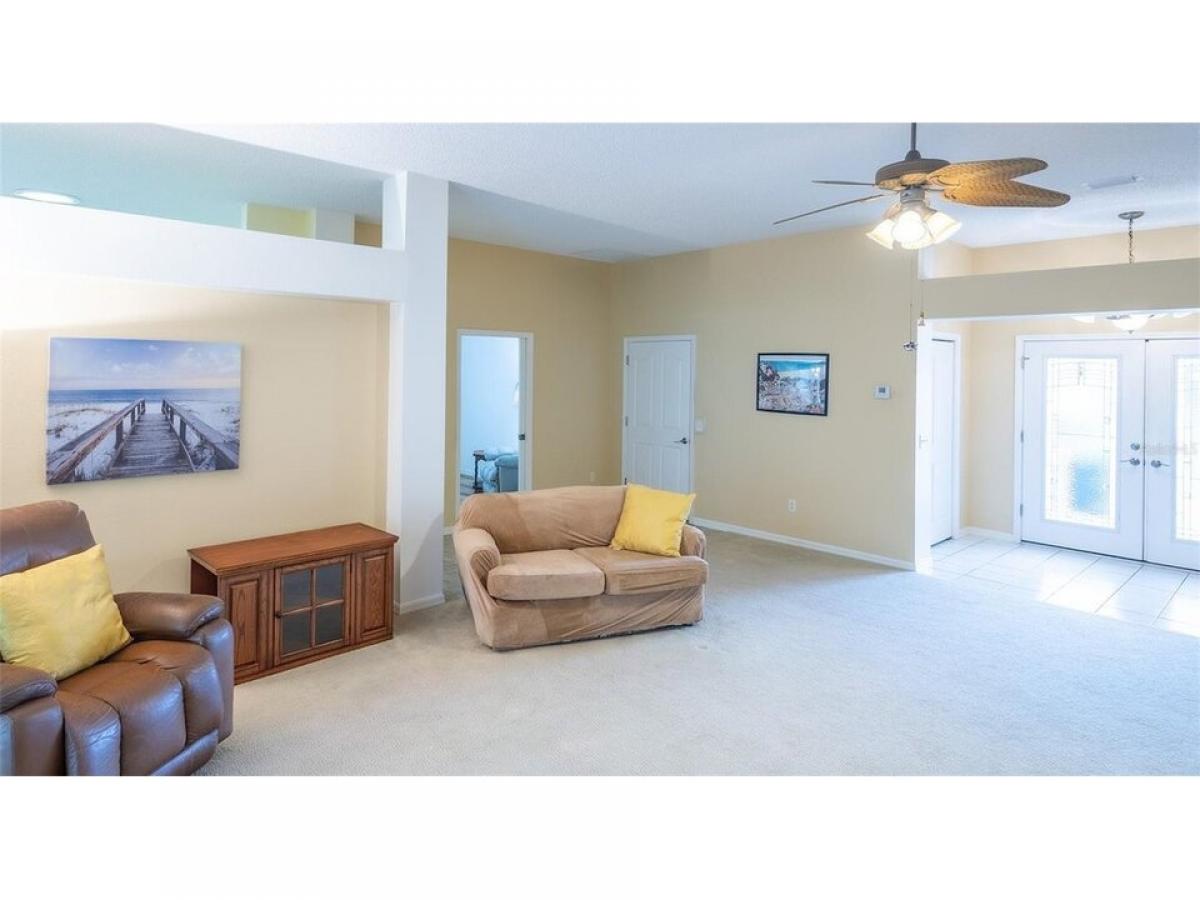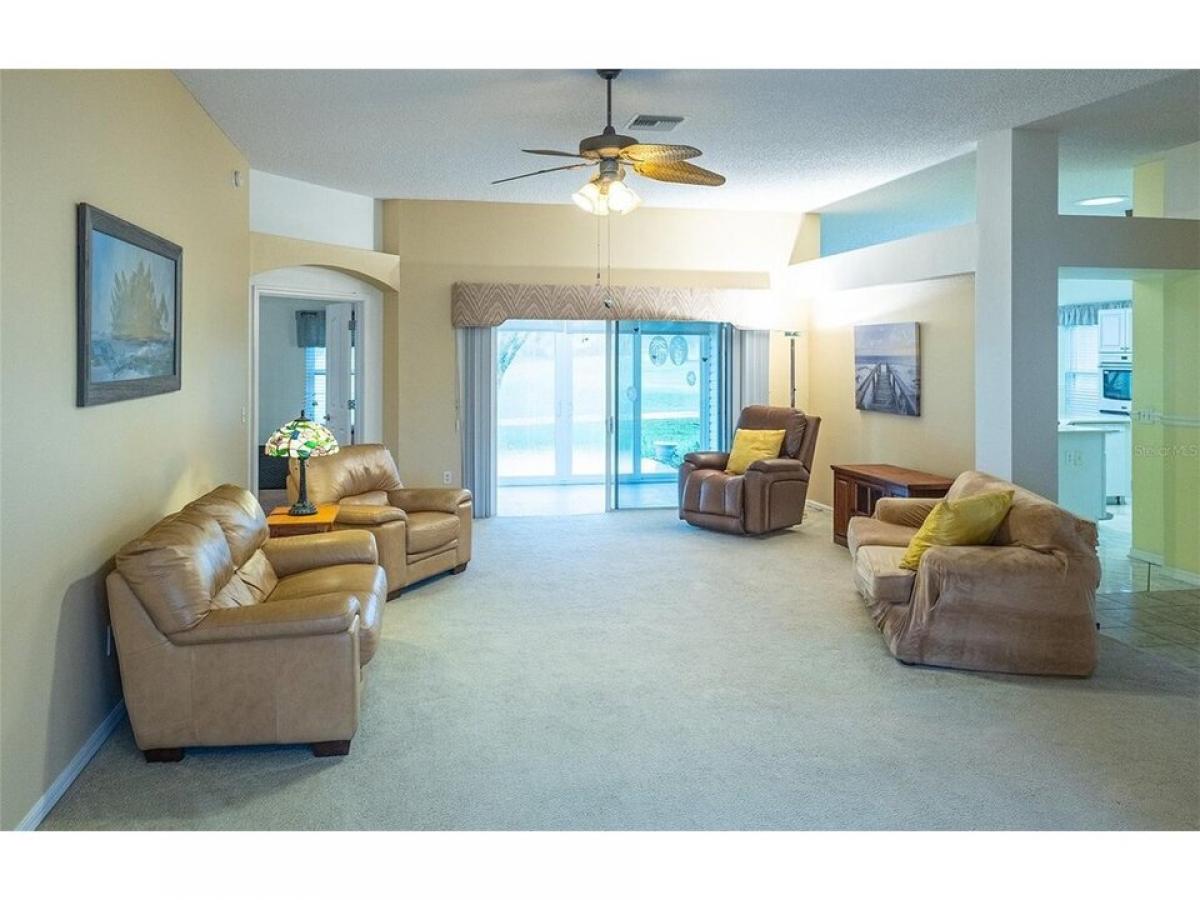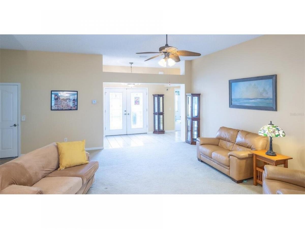 PRICED TO SELL !! Welcome home to your spacious retreat in the heart of The Villages! Nestled in the sought-after Village of Santo Domingo, this charming 3 bed, 2 bath (3rd bed - no closet) home offers over 1800 square feet of comfortable living space. Enjoy the convenience of being just minutes away from both Spanish Springs and Lake-Sumter Landing Town Centers and all the recreation, dining, and shopping nearby. As you approach, you#039;ll be greeted by the inviting curb appeal featuring stacked stone beds and low-maintenance landscaping. Step inside through the double door, leaded glass front entry and admire the open front porch, perfect for relaxing evenings. This home boasts a prime location overlooking the 5th tee box of the El Diablo golf course, offering serene views including a peek at the tranquil pond from the rear lanai. The enclosed rear lanai provides a peaceful retreat year-round. The spacious kitchen is a chef#039;s delight with plenty of white cabinets, pantry storage, Quartz countertops, and newer appliances. Updates include new insulated windows (2014) and a ROOF replacement in 2019, ensuring both comfort and efficiency. Additional features include a driveway with an epoxy painted finish, newer HVAC and HWH systems, and a 2-space garage with a screened front for enjoying fresh air. For added convenience and leisure, this home INCLUDES a 2011 Yamaha GAS GOLF CART and comes partially furnished, making it move-in ready. Don#039;t miss out on this exceptional opportunity to own a meticulously maintained home with NO BOND in a prime location within The Villages. Schedule your showing today and envision the lifestyle that awaits you!