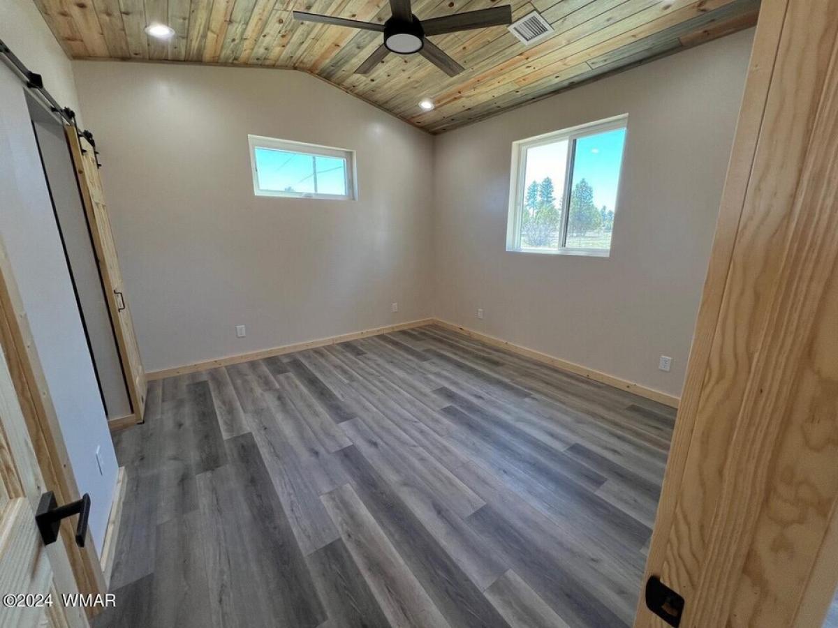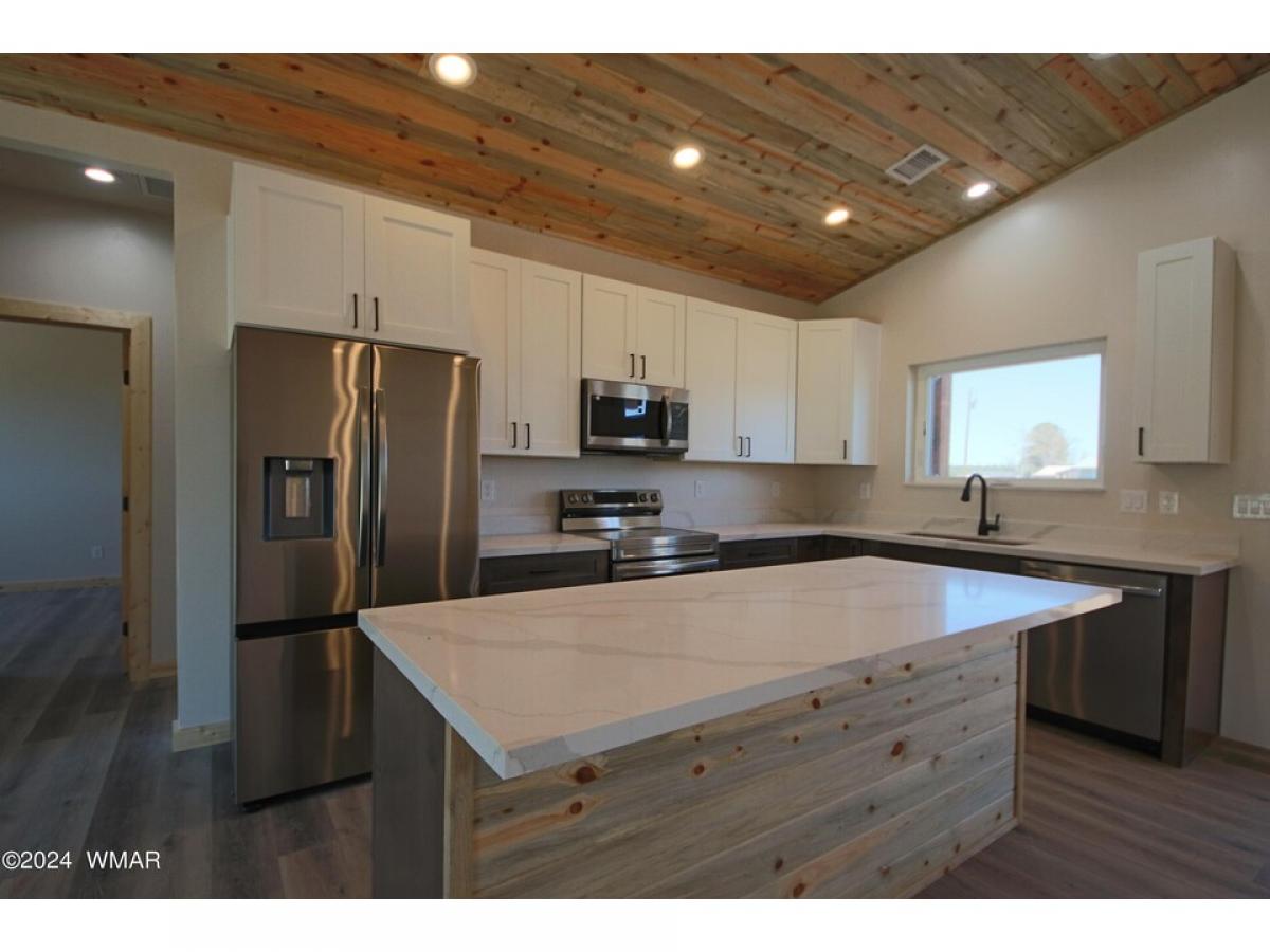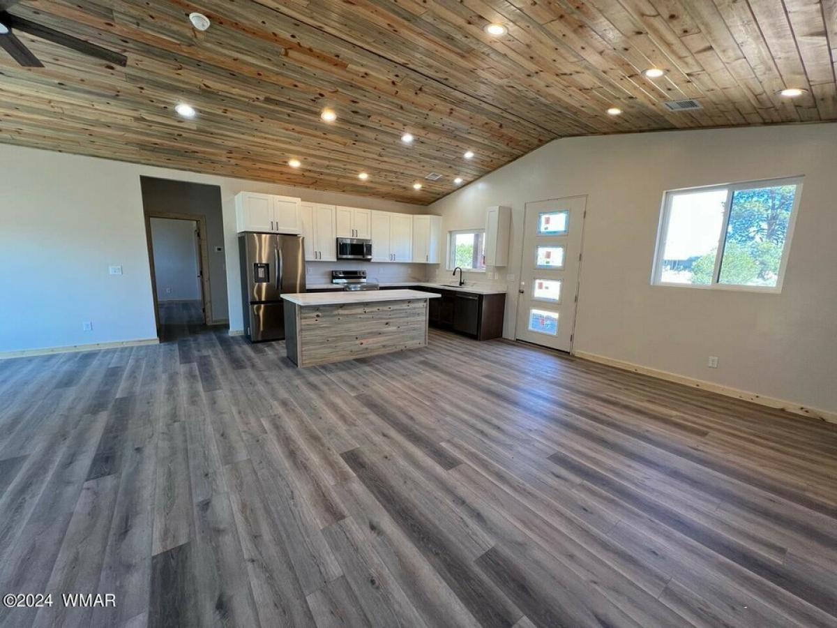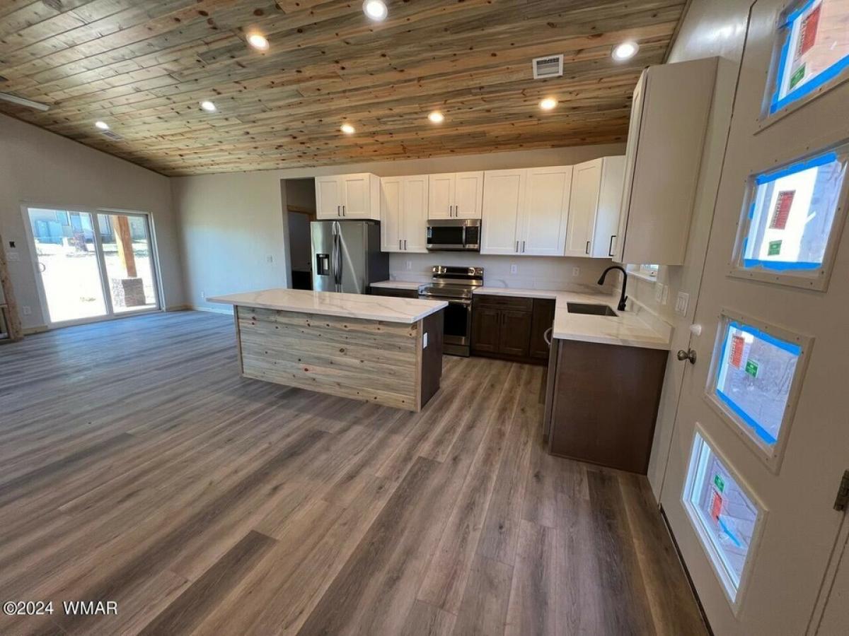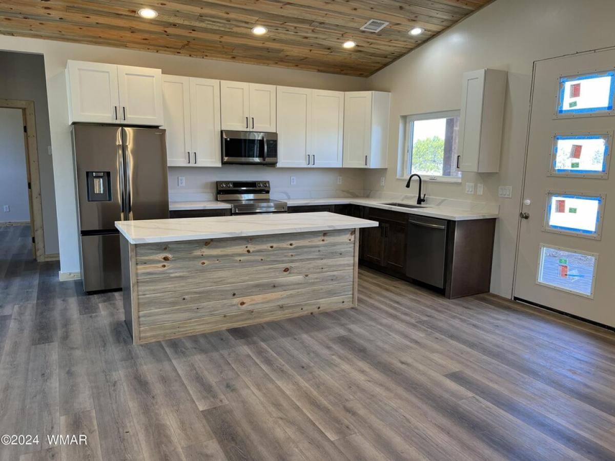 This home combines the charm of a cabin with the convenience of modern living. With an open and spacious floor plan and vaulted ceiling it offers a beautiful kitchen with a large island and solid surface counters. Split bedrooms for added privacy and 2 bathrooms. The fireplace offers you the ambiance and warmth you want and expect in either your weekend get away or full time home. The vinyl plank flooring and maintenance free siding as well as metal roof means less work for you and all in a single level for easy living.