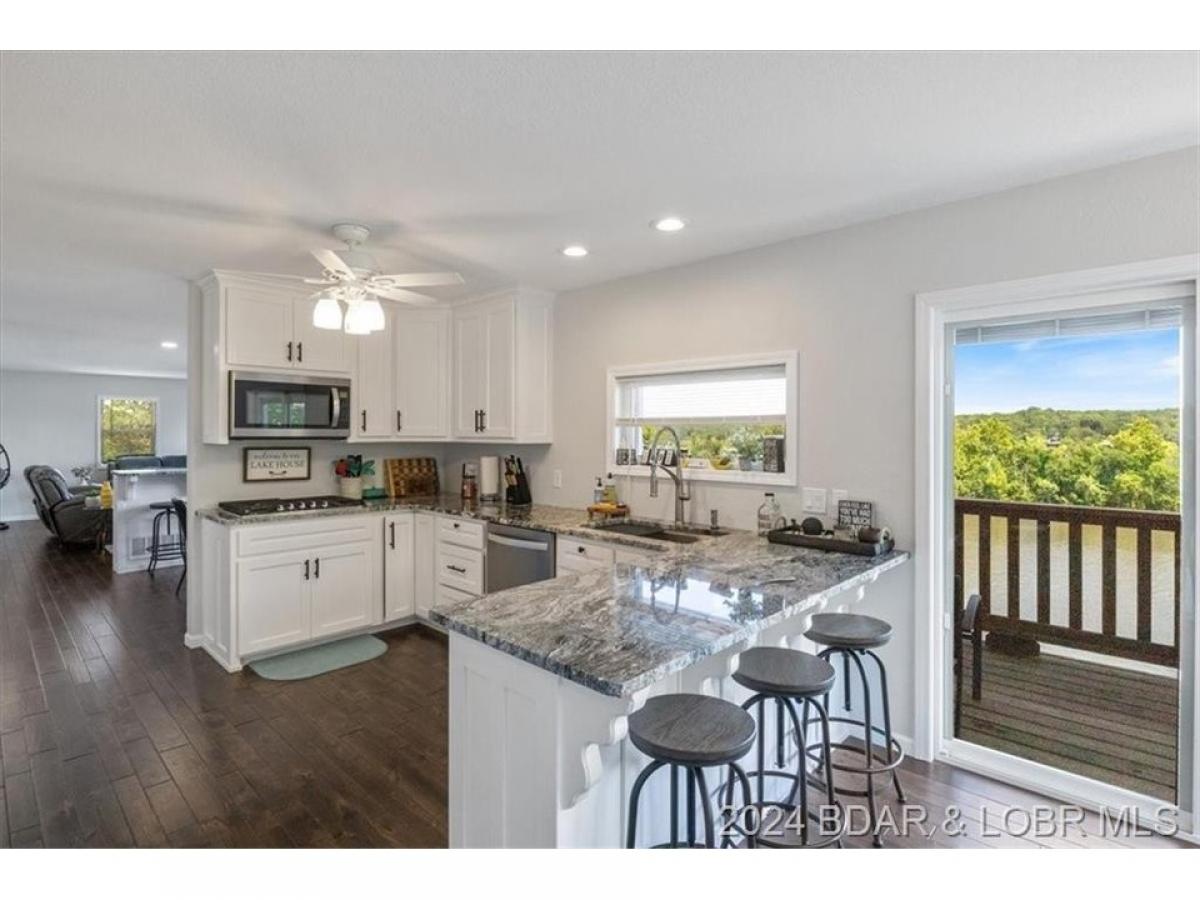 Fully Remodeled and what an incredible view!!! Just 15 minutes from downtown Warsaw, this lakefront home has been transformed and updated over the last couple of years. New siding, sliding doors, kitchen cabinets and countertops, flooring, bathrooms, built in dog kennels and dog washing station, finished living space in the lower level plus added glass garage doors and epoxy floors, and just concreted the driveway! Enjoy the outdoors in numerous ways--covered decks, concrete fire pit area, huge yard, or the dock of course! Featuring two boat slips (12x28 and 12x22 lifts available for $), a roll on waverunner lift (included), swim platform to hangout on, and super deep water! 30+ feet deep and great area for fishing, swimming, water sports, paddle board, etc. Just a short boat ride from Shooters 81 and Oar House or dock at the Harbour and enjoy the restaurants on Main Street. This is the perfect combination of privacy with the huge lot, relaxation on the 84 Mile Marker of Lake of the Ozarks, and convenience with high speed fiber optic internet and less than 2 hours from the heart of KC. Rock the path to the dock steps with a $2,000 credit or upgrade it to a concrete cart path!