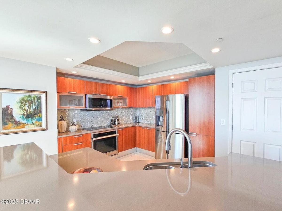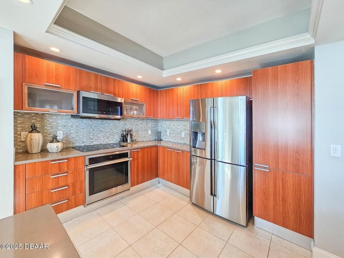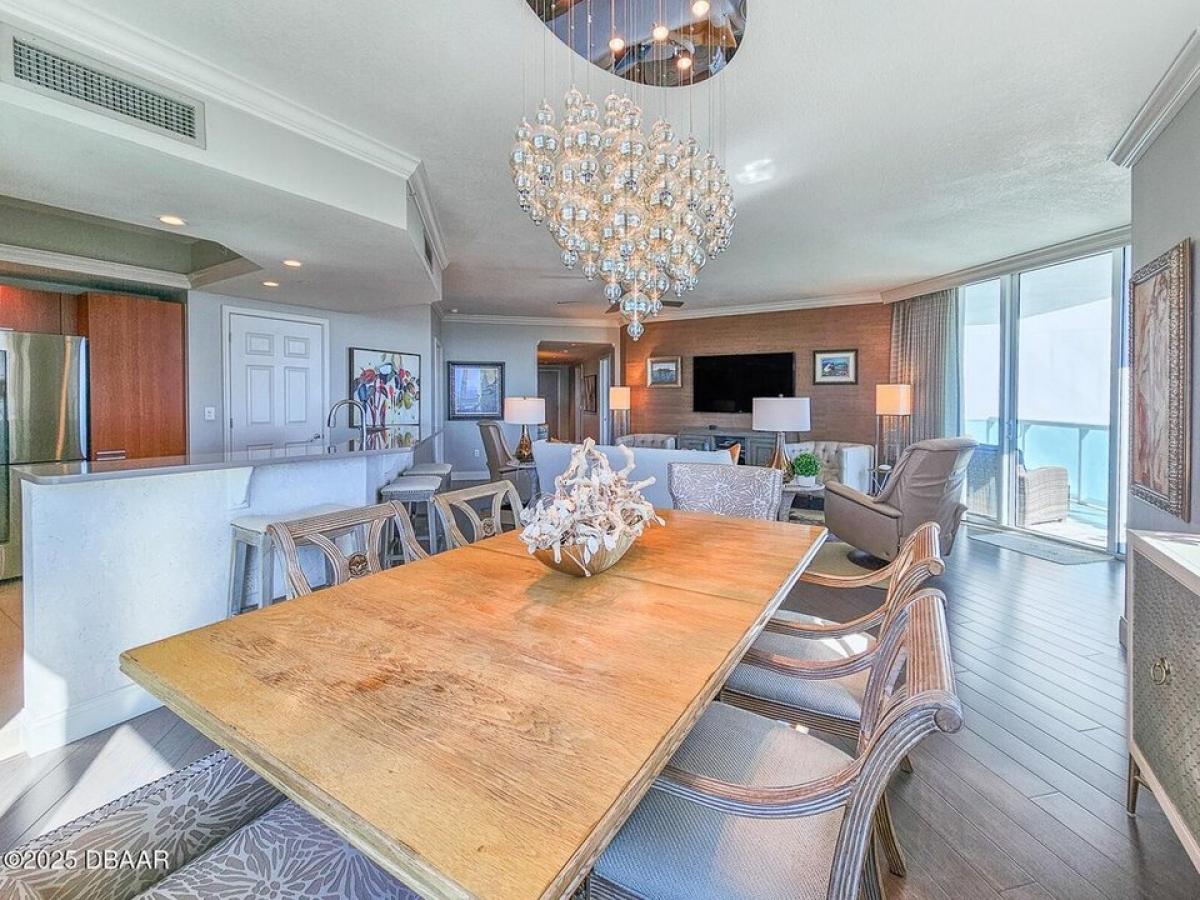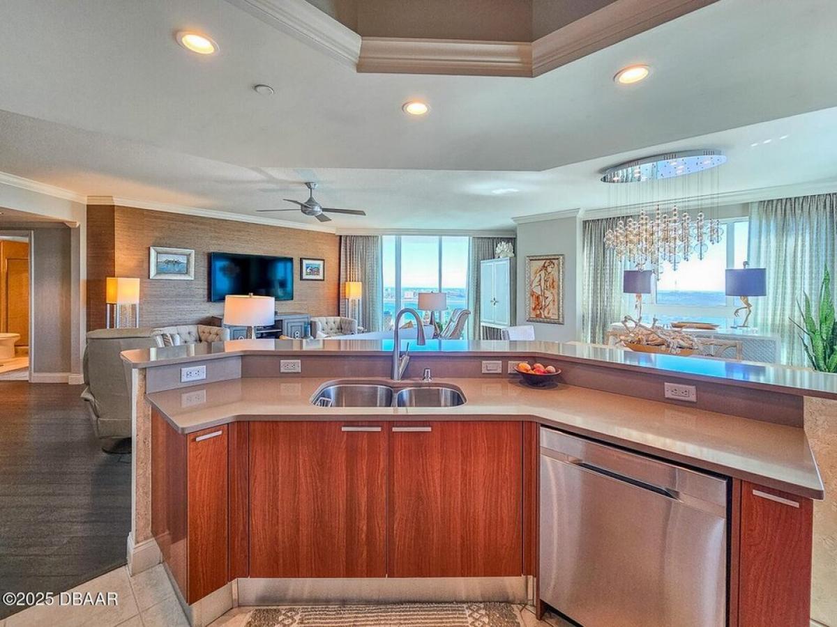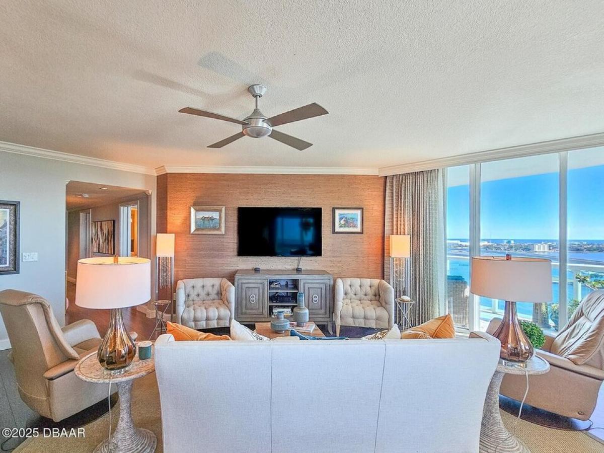 Experience luxury living in this exceptional three-bedroom, three-bathroom condo located at the Prestigious Marina Grande on the Halifax River. This corner unit offers stunning, unobstructed panoramic waterfront views of the river and city, showcasing beautiful sunrises and sunsets. The condo features high-end finishes, including custom window treatments, crown molding through out, Chandelier#039;s in dinning room and master bath. recessed lighting, and top-notch fixtures in every room, complemented by stylish wallpapers that create a sophisticated ambiance. The main balcony features tile. Bamboo wood flooring enhances the living area, while the bedroom suites feature cozy carpeting. The well-designed bedroom layout ensures privacy, with each suite boasting an in-suite full bathroom. Each closet is equipped with organizers for maximum functionality. The chef-inspired kitchen is fitted with high-end Samsung appliances and upgraded with rollout storage for maximum efficiency
