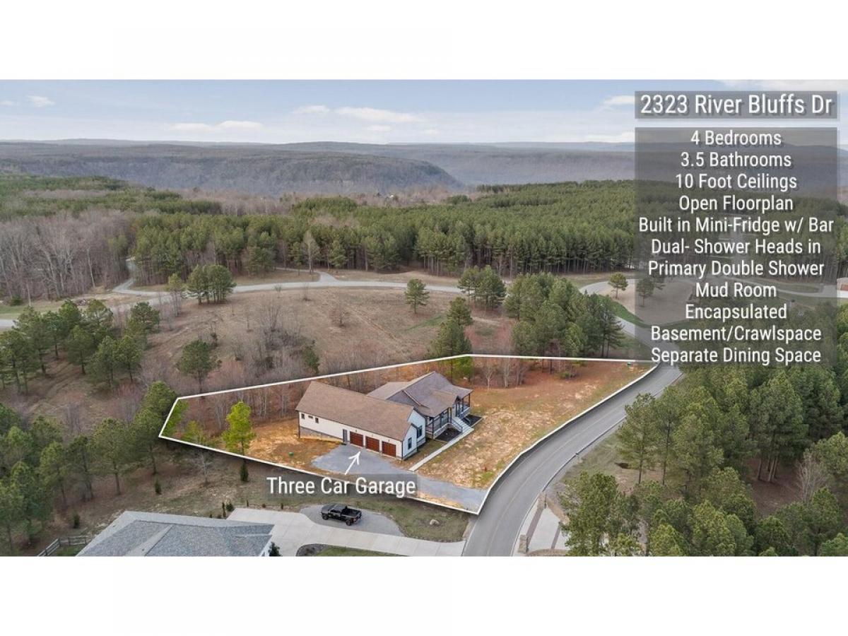 Welcome to 2323 River Bluffs Dr., a stunning blend of luxury, functionality, and income potential in the prestigious Jasper Highlands. Behind the gates of this sought-after mountaintop community, this four-bedroom, 3.5-bath retreat offers an open-concept layout, soaring 10-foot ceilings, and a seamless mix of hardwood and ceramic tile flooring. The main level is designed for both everyday comfort and elevated entertaining, featuring a spacious great room, chef#039;s kitchen with a walk-in pantry, and a separate dining room. A dedicated home office near the entry provides the perfect workspace, while three main-floor bedrooms include a lavish primary suite with a soaking tub, an oversized two-person shower with dual shower heads, and a massive walk-in closet. Upstairs, a private-entry guest suite awaitsmdash;complete with a bedroom, full bath, sitting area, and fireplace. Ideal for extended family, guests, or potential rental income, this space offers both warmth and independence. Outdoor living is effortless with dual access to the expansive covered back porch, perfect for relaxing or entertaining, along with a welcoming covered front porch. A three-car garage provides ample storage for vehicles and gear. Adding to the tranquility and privacy, the land beside the home is protected and cannot be built on, ensuring unobstructed views and a lasting sense of serenity. Set within the amenity-rich Jasper Highlands, this home grants access to community pools, scenic walking trails, tennis and pickleball courts, shuffleboard, a fitness center, and two on-site restaurants. Whether you#039;re seeking a private escape or a property with earning potential, this exceptional home delivers.