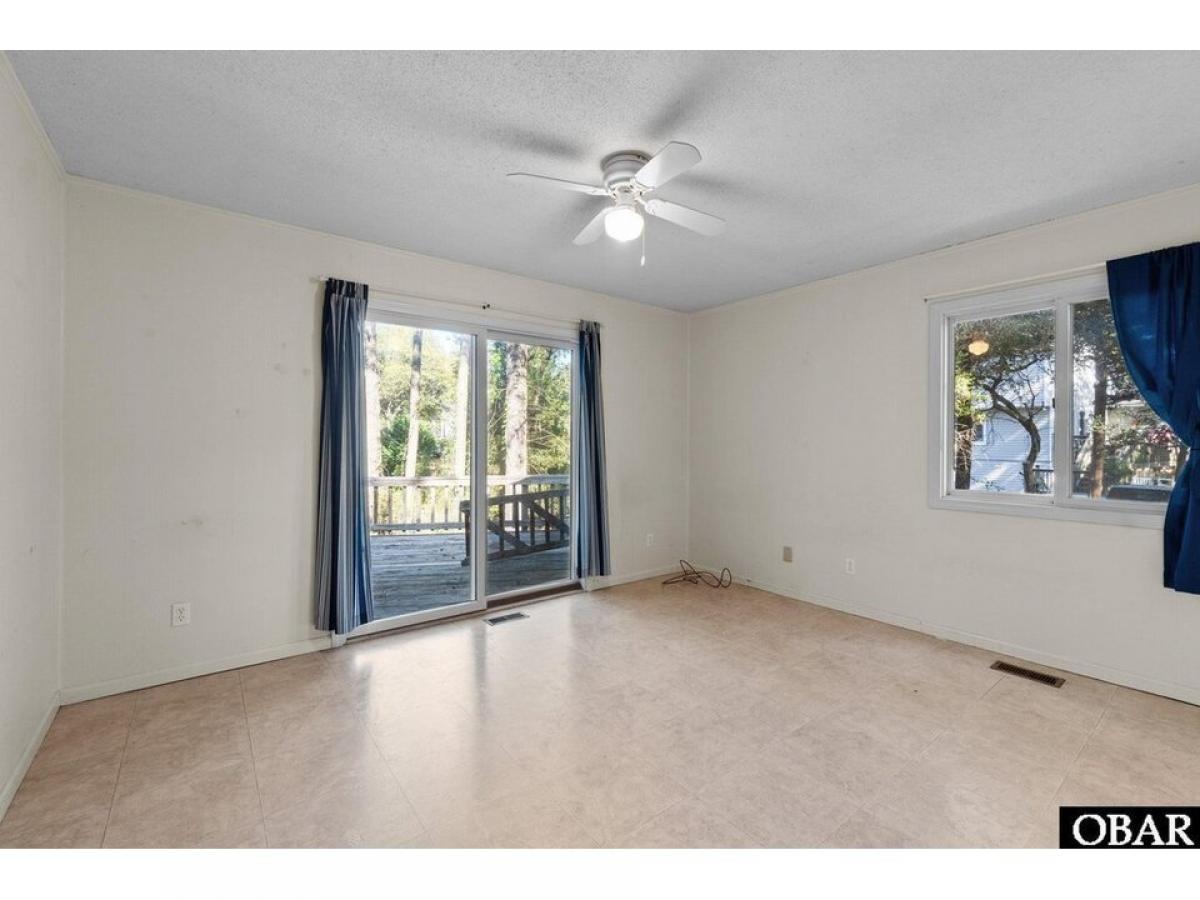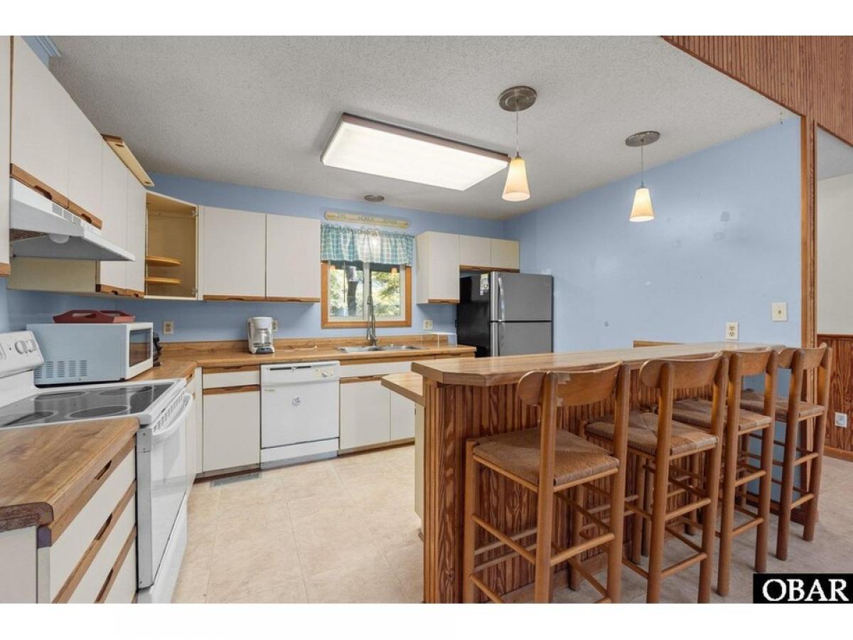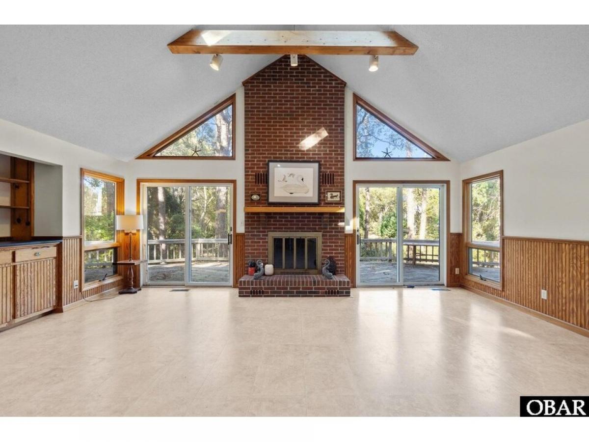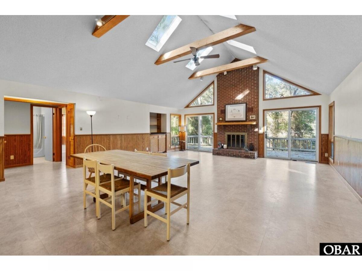 Southern Shores 4 bedroom 2 bath pleasantly tucked in the trees. The popular ldquo;Hrdquo; Plan or also known as the Beach Plan. Open floorplan with a nice kitchen with convenient eat-at bar. A large living area with cathedral ceiling with exposed beams and four skylights, attractive wainscoting, built-in cabinet with shelves and an attractive brick fireplace. Four bedrooms with 2 bedrooms sharing a bath conveniently located on each side of the living area. Two of the bedrooms have their own sliders out to the back deck. Relax on the private 620 square foot back deck surrounded by beautiful trees. Or you could step out front and enjoy the inviting, spacious 22 X 12 screened porch with cathedral ceiling and ceiling fan. Spacious under house parking and 458 square feet of ground floor storage and an outside shower. Large, nicely wooded 18,170 square foot 115 X 159 X 115 X 157 lot gives you plenty of options. Needs paint inside and some TLC to make this a gem. Sold ldquo;As Isrdquo;. Agent and owner do not guarantee the accuracy of the Lighthouse dimensions and floorplans. See associated documents for County As-Built Survey, Permits, Insurance Info, and Floorplans. Combo lockbox, EZ to Show!!!