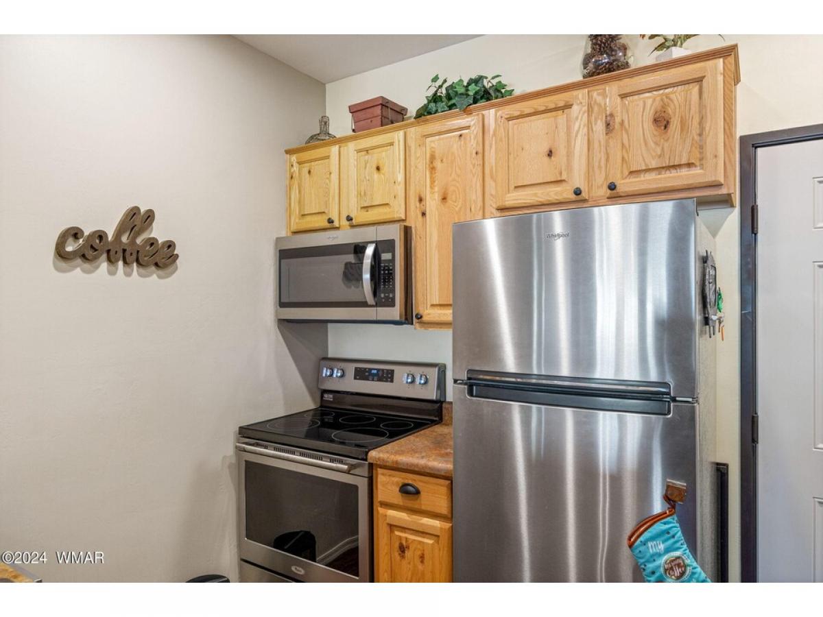 Come to the beautiful White Montains & see this updated condo that is fully furnished & turn key ready! The unit is on the first floor & can be entered through the front door on the gated covered patio or by the door at the side entrance. This condo has upgraded solid surface flooring, remote ceiling fans, newer stainless appliances, new light fixtures, toilet & shower heads. Lots of extras! As an added plus, the condos include an exersise room, game area with billards, & a laundry room. The Ranch amenities include a fish & release pond, basket ball & tennis courts, volleyball, & childrens' play area. Walk to Bison Town with shops & restaurants. Only a short drive to the NF for views of wildlife, hiking, quads, & miles of pines. Much to do or relax on the covered deck and enjoy the peace.