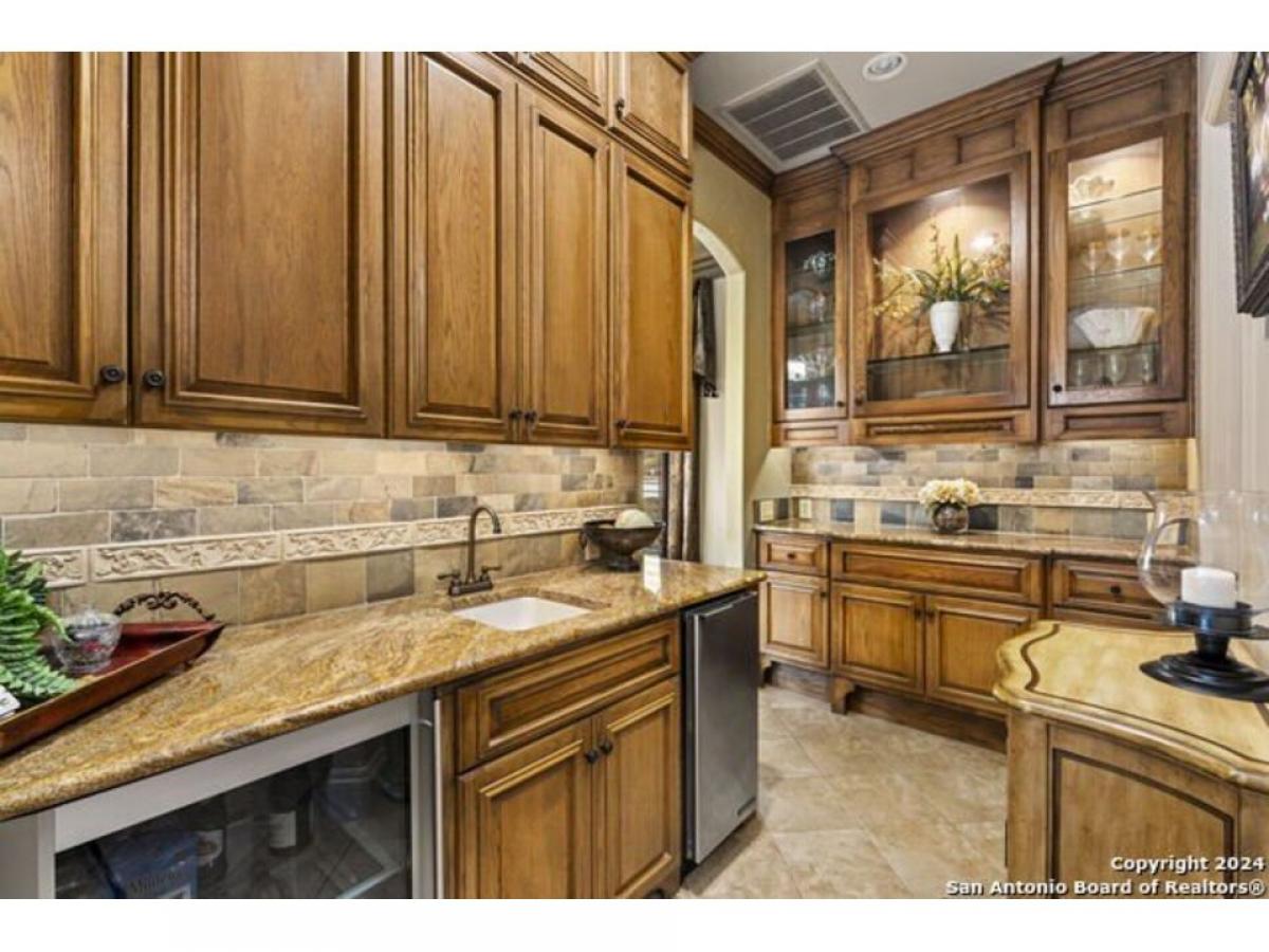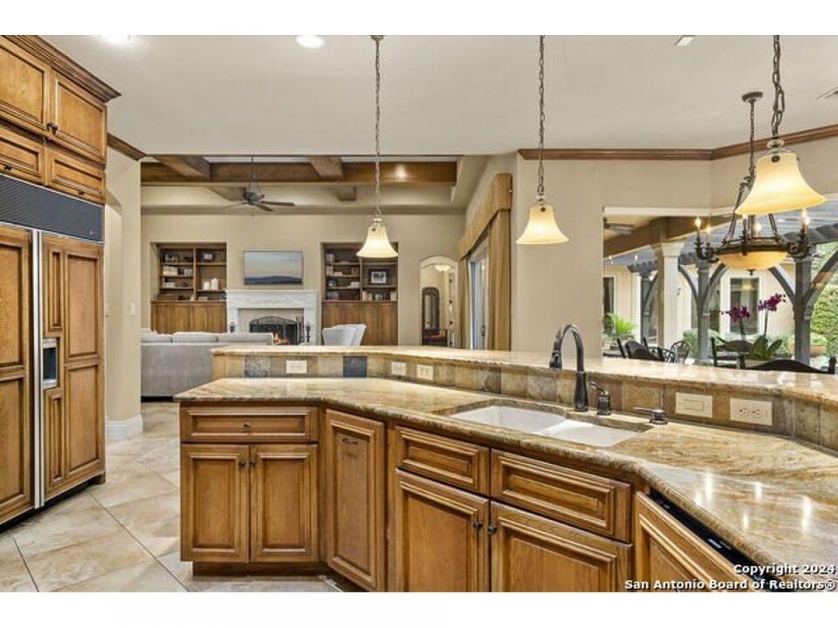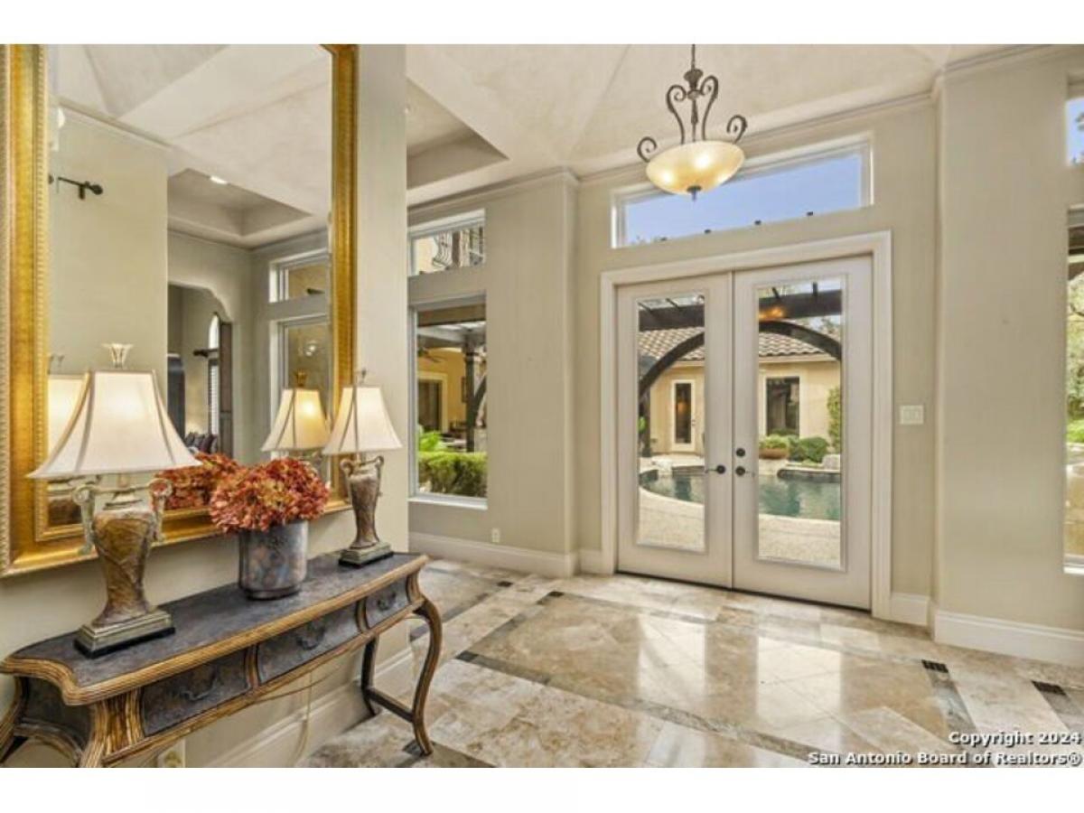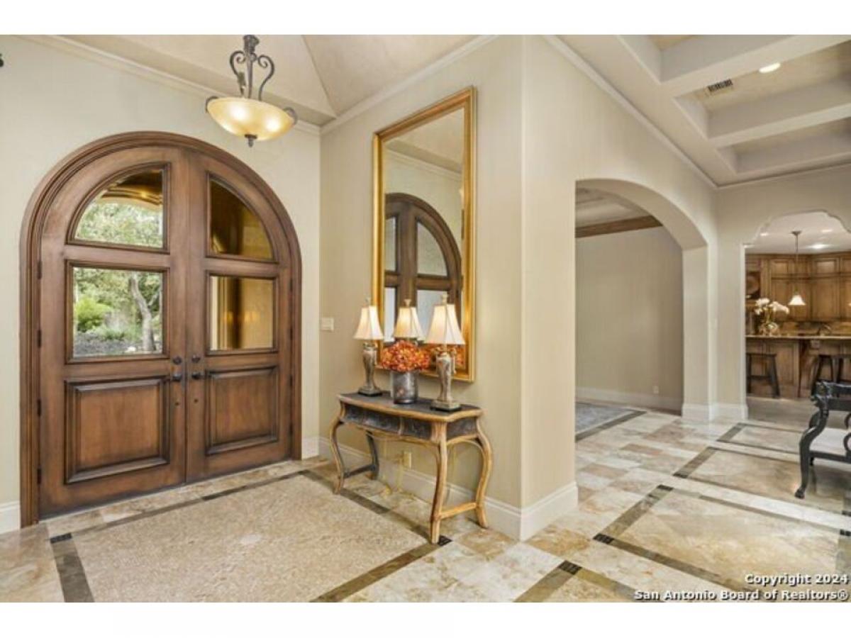 Located in Bentley Manor, this Spanish Revival residence, masterfully balances open, inviting spaces with private retreats for solitude. Through beautiful double-arched wooden doors, you#039;re welcomed into a home filled with natural light, expansive windows, and elegant travertine flooring beneath high ceilings. The living room showcases custom built-ins and an intricate beamed ceiling that adds depth and architectural interest. The gourmet kitchen is outfitted with Thermador, Sub-Zero, Bosch, and Miele appliances, a large walk-in pantry, and a butler#039;s pantry complete with a wine fridge, sink, and Hoshizaki ice maker. Located on the main floor, the primary suite is thoughtfully designed with two walk-in closets, an en suite bath featuring dual toilets and a bidet, along with a flexible adjoining room. A convenient secondary bedroom with an en suite bath is also situated on the main level. Upstairs, three additional bedrooms, each with en suite baths, accompany a game room that opens to a balcony overlooking the tranquil grounds. Outdoors, a large covered patio with outdoor fireplace and grill overlook your Keith Zars-designed pool and spa, private putting green, and lush landscaping, creating an ideal sanctuary. Landscape lighting adds to the tranquility of the setting, perfect for evening relaxation. Additional features include a three-car garage and gated driveway.
