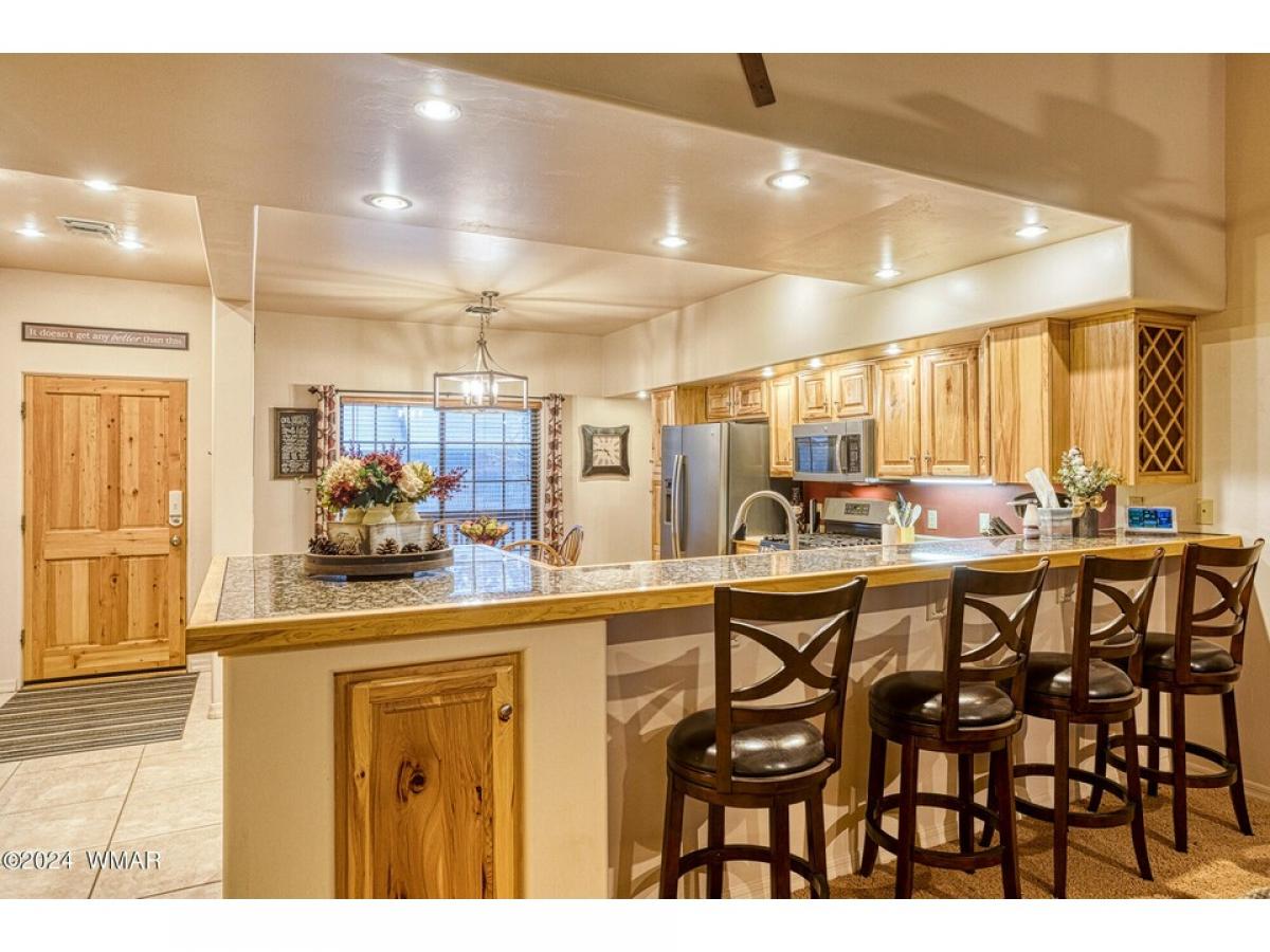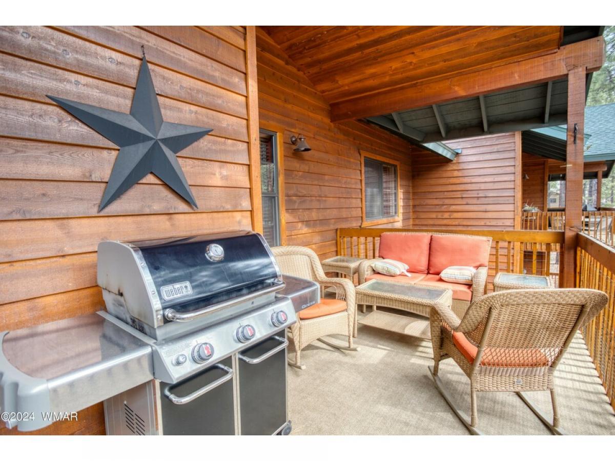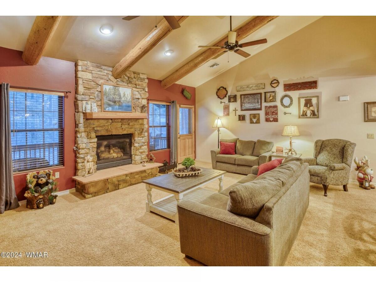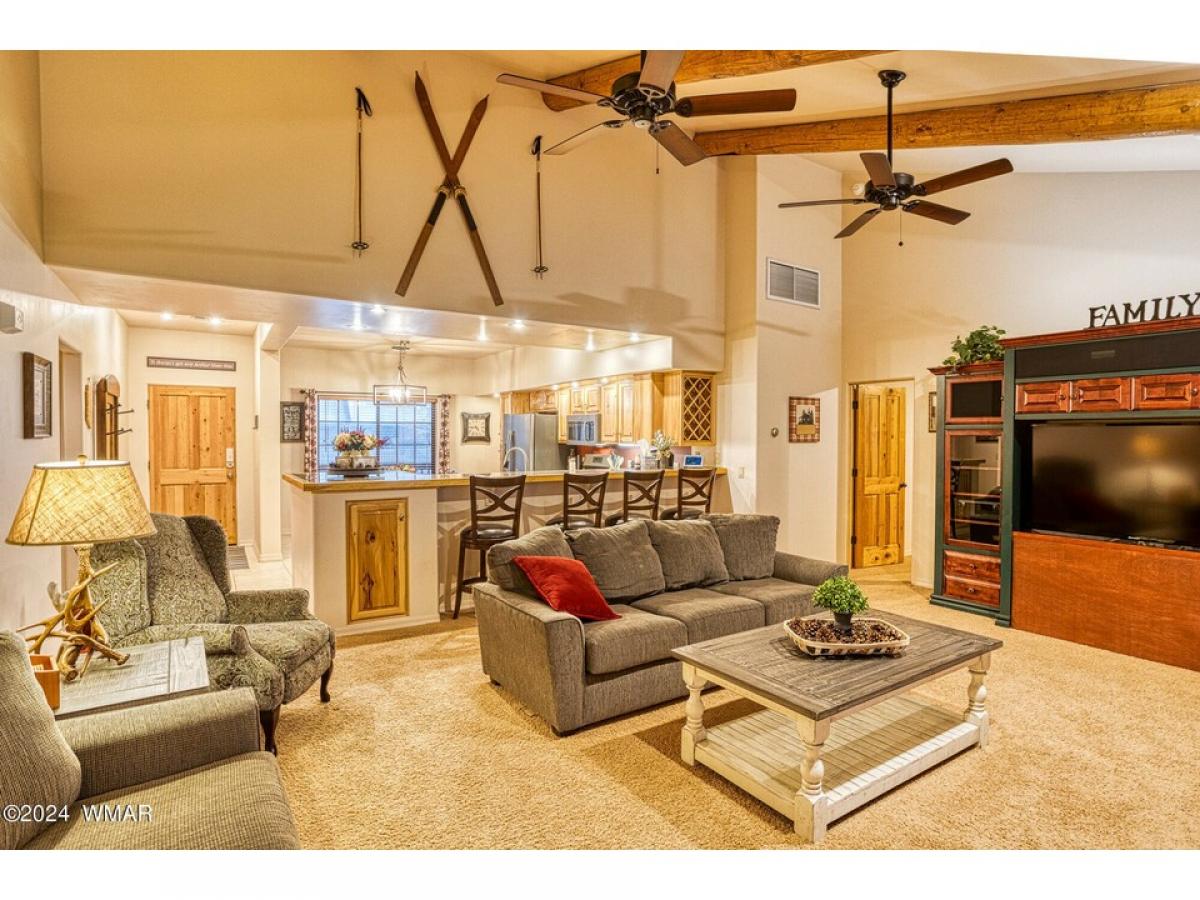 Welcome to 2531 Village Court, a charming end unit nestled on the second floor offering everything you need in a mountain home. Fully furnished and turn-key, the desirable split floorplan boasts a meticulously maintained interior, vaulted ceilings & stunning real log beams. Upgrades include added cupboard space, high-end appliances, and new roof installed in 2023! Entertain on the eastern facing and expansive barrel-vaulted deck, providing panoramic views of tall pines and lush greenery. Conveniently situated in the gated community of The Village in Pinetop Country Club, this residence offers easy access to golf, hiking trails, skiing, town amenities, and more! This is the condo you've been waiting for! Seller is licensed to sell Real Estate in AZ