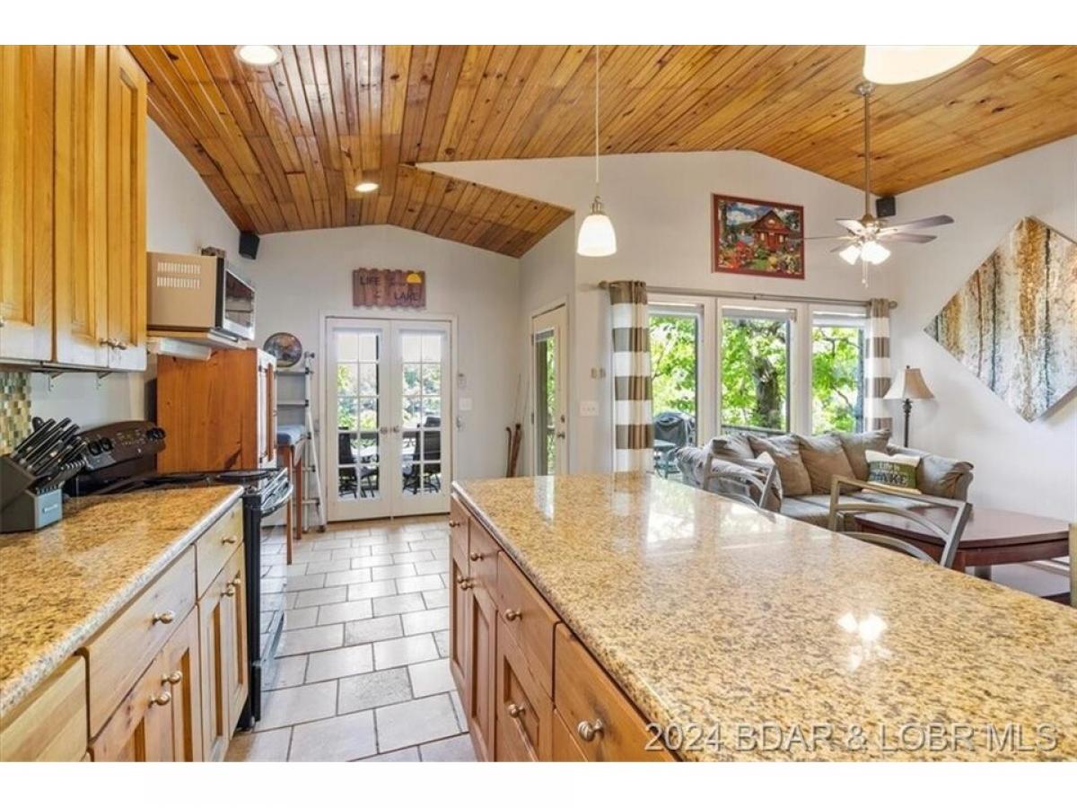 TURNKEY Log-Sided Lake Cabin on the 61 MM of Lake of the Ozarks! Remodeled in 2015, the home was gutted to raise and vault the ceiling, replace framing as needed, install PECS plumbing, new electric, windows, LVP & tile flooring, knotty pine cabinets with granite counters, and create a screened in deck area! The bathroom features a sizable walk in shower and has hookup for a stackable washer/dryer. Absolutely stunning view from the decks and with mature trees all around, it feels very secluded and almost like a tree house! Tons of outdoor space with the screened deck, open deck, and a second large deck half way down to the road. Single well boat dock and swim platform included as well as the lift (the lift needs repair). Year round water, excellent fishing, calm waters, and gas dock/restaurants just across the channel! Fantastic vacation cabin or potential for nightly rental! Selling in as-is condition. No info known about septic.
