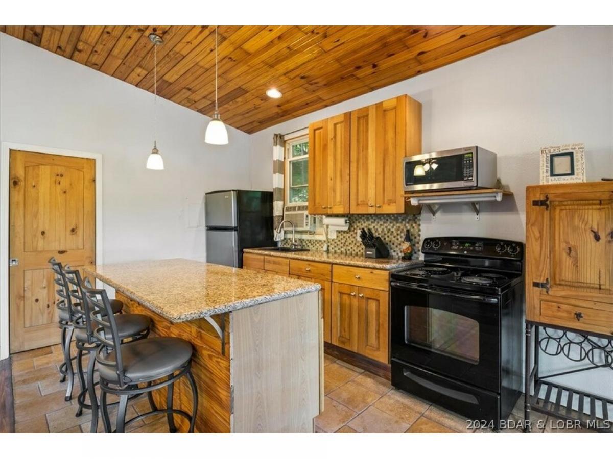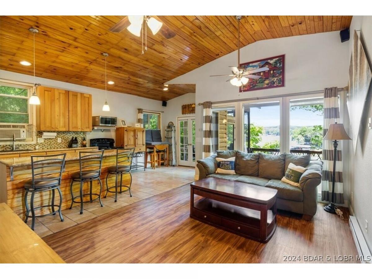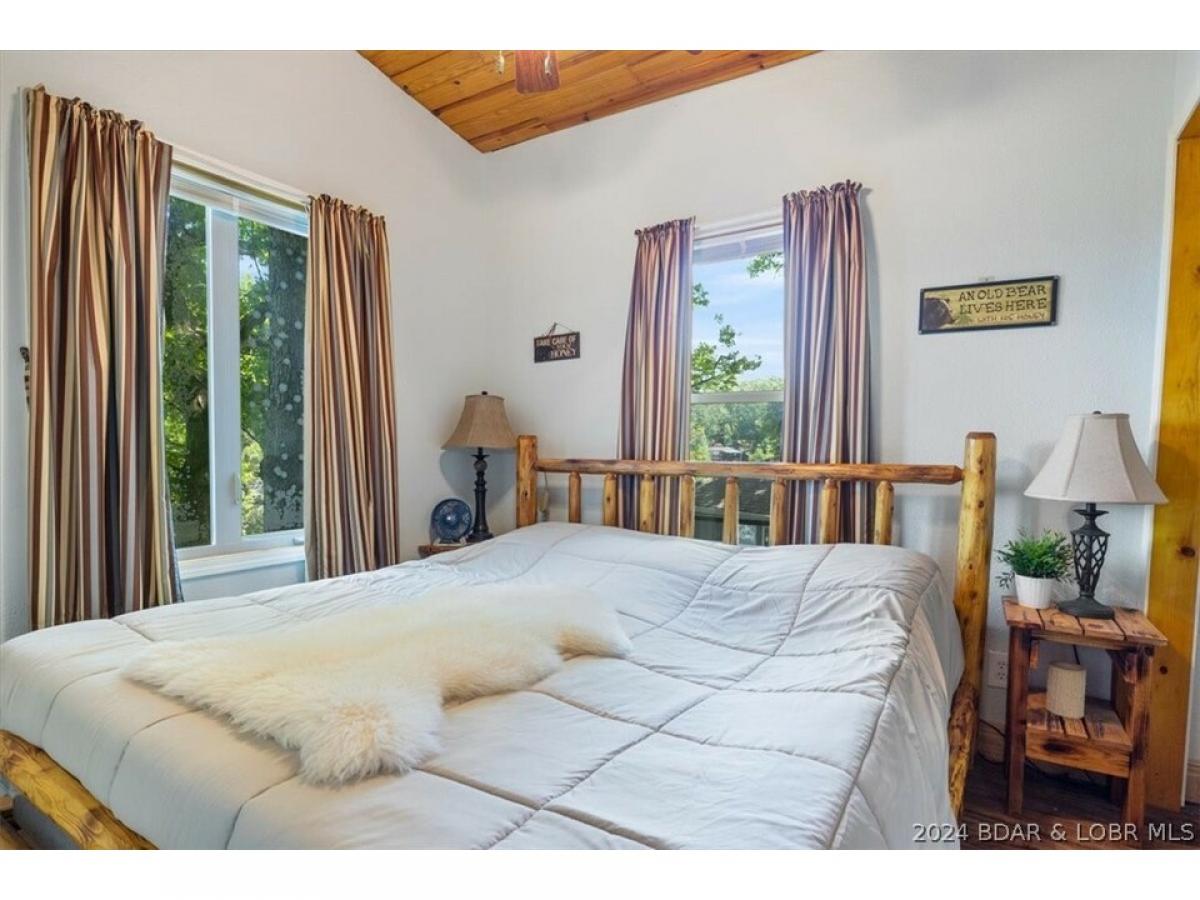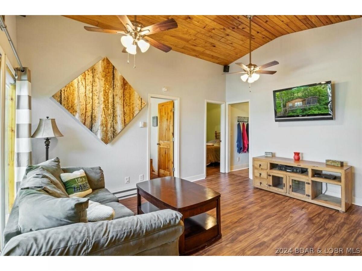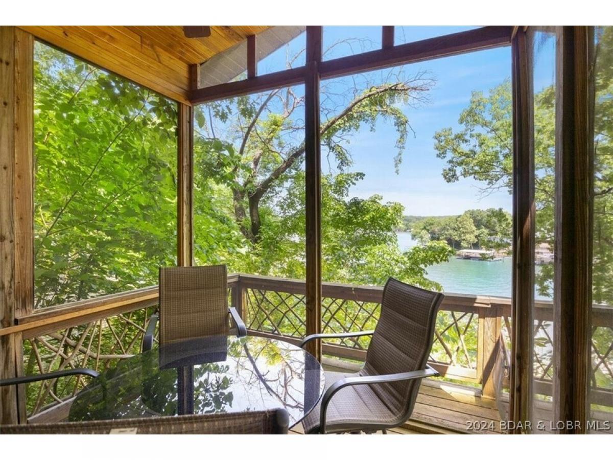 TURNKEY Log-Sided Lake Cabin on the 61 MM of Lake of the Ozarks! Remodeled in 2015, the home was gutted to raise and vault the ceiling, replace framing as needed, install PECS plumbing, new electric, windows, LVP & tile flooring, knotty pine cabinets with granite counters, and create a screened in deck area! The bathroom features a sizable walk in shower and has hookup for a stackable washer/dryer. Absolutely stunning view from the decks and with mature trees all around, it feels very secluded and almost like a tree house! Tons of outdoor space with the screened deck, open deck, and a second large deck half way down to the road. Single well boat dock and swim platform included as well as the lift (the lift needs repair). Year round water, excellent fishing, calm waters, and gas dock/restaurants just across the channel! Fantastic vacation cabin or potential for nightly rental! Selling in as-is condition. No info known about septic.