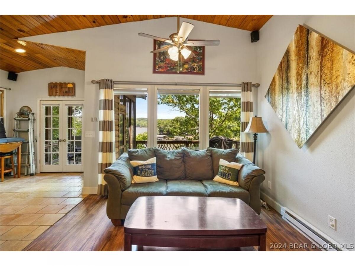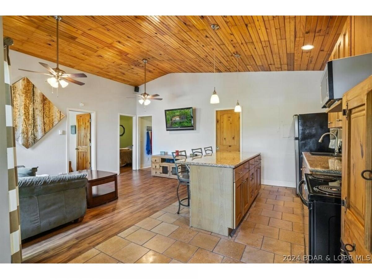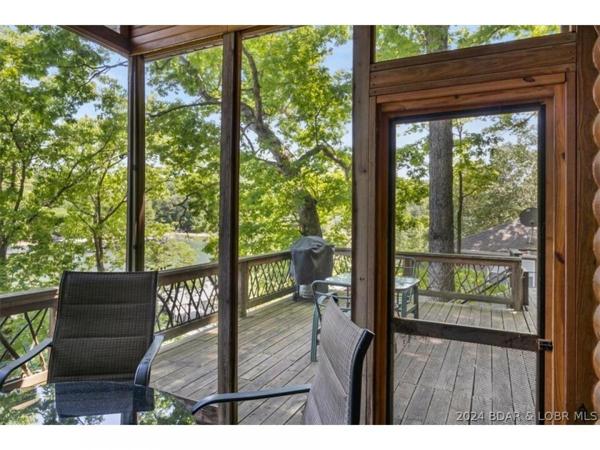 TURNKEY Log-Sided Lake Cabin on the 61 MM of Lake of the Ozarks! Remodeled in 2015, the home was gutted to raise and vault the ceiling, replace framing as needed, install PECS plumbing, new electric, windows, LVP & tile flooring, knotty pine cabinets with granite counters, and create a screened in deck area! The bathroom features a sizable walk in shower and has hookup for a stackable washer/dryer. Absolutely stunning view from the decks and with mature trees all around, it feels very secluded and almost like a tree house! Tons of outdoor space with the screened deck, open deck, and a second large deck half way down to the road. Single well boat dock and swim platform included as well as the lift (the lift needs repair). Year round water, excellent fishing, calm waters, and gas dock/restaurants just across the channel! Fantastic vacation cabin or potential for nightly rental! Selling in as-is condition. No info known about septic.