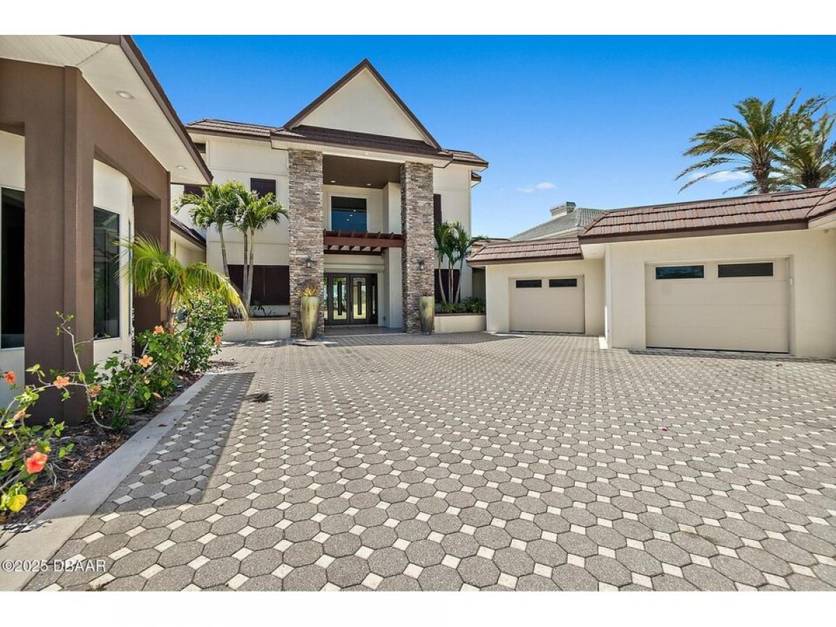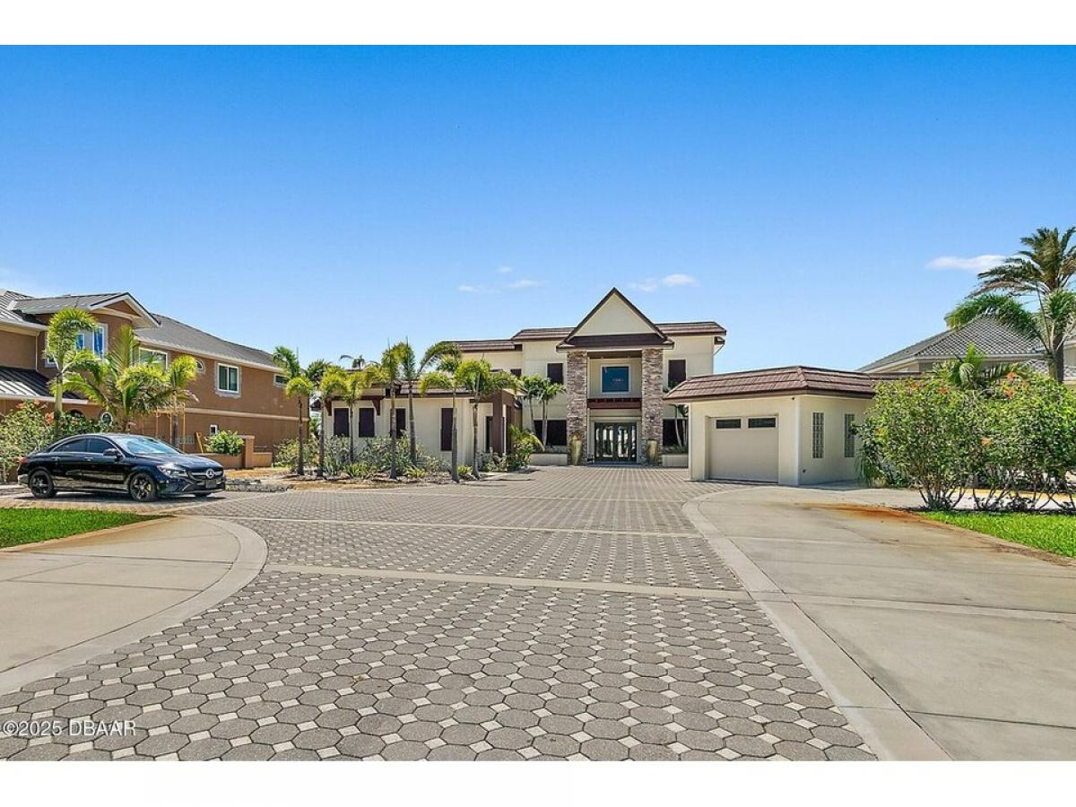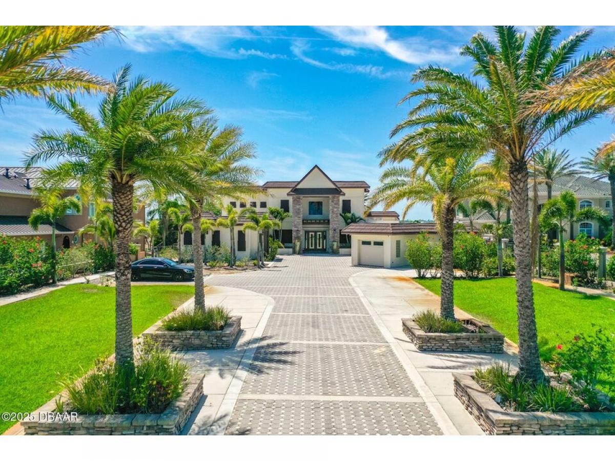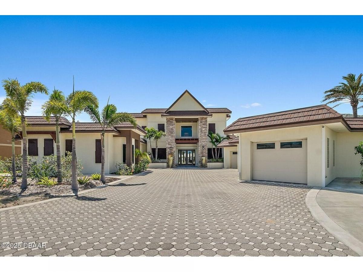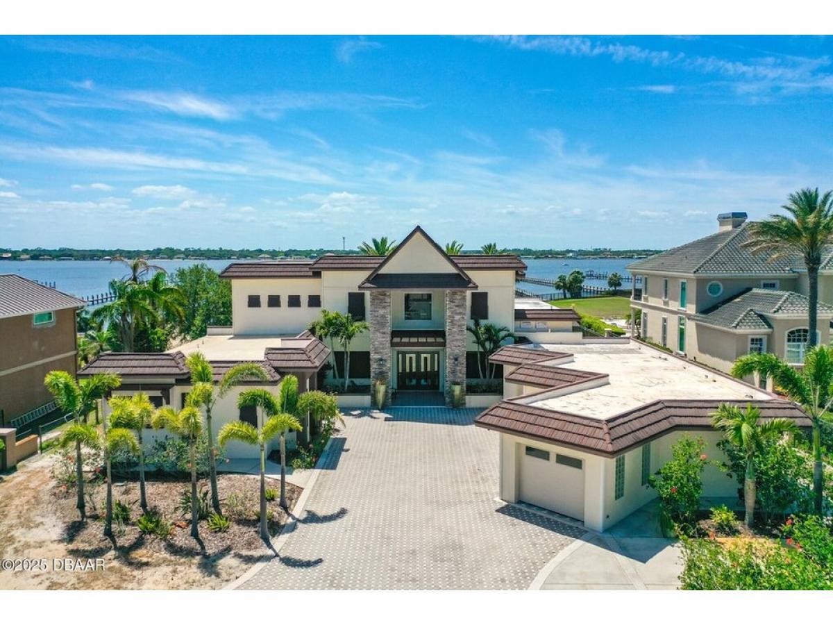 Introducing a stunning gated beachside riverfront estate, set on an expansive 1.4 acres that evoke a park-like atmosphere, located just minutes from the beautiful shores of Daytona Beach. This custom-built luxury home boasts an impressive 4,985 square feet of living space, featuring three spacious bedrooms, three full bathrooms, and two half baths, along with an in-law suite, an office, and a versatile loft that#039;s perfect for family life and entertaining. Additionally, the property includes a generous three-car garage totaling 1,152 square feet. With 115 feet of waterfront access, complete with a deep-water dock, this estate offers an exceptional blend of comfort and outdoor enjoyment. Showcasing over a million dollars in high-end upgrades. Notably, $250,000 has been dedicated to creating a stunning landscape adorned with palm trees that greatly enhance the property#039;s appeal. As you pass through the elegant gates, you#039;ll be welcomed by a sprawling paver motor court with custom stacked stones pillars and landscaped vignettes. This home boasts a robust concrete block stucco exterior with striking stacked stone pillars all leading to a grand and inviting entrance. Upon entering through the double doors, you#039;re immediately met with a soaring 22-foot ceiling that frames expansive river views, while an exquisite crystal chandelier hangs seamlessly with understated elegance. The first floor is finished with lustrous 36x36 porcelain tiles, adding a touch of modern refinement. Step into the chef inspired kitchen adorned with a contemporary flair highlighted with black wood cabinets, an impressive large custom island, soft close drawers, and wrapped in a double slab stone countertop. Kitchen Aid appliances with two refrigerators, two dishwashers, double oven, warming drawer, and 6-burner gas stove with pot filler. The butler#039;s pantry is tucked away for seamless hosting, equipped with a dishwasher, deep sink with disposal, and large pantry. Right off the kitchen is the spacious living room which features travertine stacked stones all the way up the wall to create a beautiful feature wall with a contemporary fireplace and tv niche. Easy access to the outdoor lanai and pool area, which is ideal for entertaining and offers beautiful river and pool views. Ascend the custom-built Walnut staircase, adorned with wrought iron balusters, to discover the upper level encompassing 1,283 square feet of exquisite living space. The primary bedroom offers breathtaking river views, complete with a private deck that overlooks the pool. The primary bath exudes luxury, featuring a relaxing soaking tub, a walk-in shower with striking tile that elegantly extends up the wall, a separate toilet and bidet in the water closet, and a spacious walk-in closet. Additionally, the upper level includes a stunning loft that provides sweeping views of the expansive intracoastal and a panoramic perspective of the open floor plan below. Downstairs, you#039;ll find a riverfront bedroom that features an in-law suite, complete with a private living room and a well-appointed laundry room, equipped with ample cabinetry and two washing machines and dryers for added convenience. The full bathroom showcases rustic charm, featuring a thoughtful mix of gray, brown, and beige tiles that evoke a farmhouse aesthetic. Additionally, the third bedroom comes with its own ensuite bathroom, ensuring comfort and privacy for guests or family members. This well-designed layout offers both practicality and a warm, inviting atmosphere. Other notable features, Anderson Windows, 4 AC units replaced in 2018, Rinnai commercial grade tankless water heater 2018. The inviting backyard is highlighted by a lovely pool, added in 2017, which is perfect for relaxation or entertaining guests, a large pergola, and walkways in a serene setting. The 2019 sea wall provides added protection and stability, enhancing the property#039;s value and appeal. For those who enjoy boating, this property is an entertainer#039;s dream.