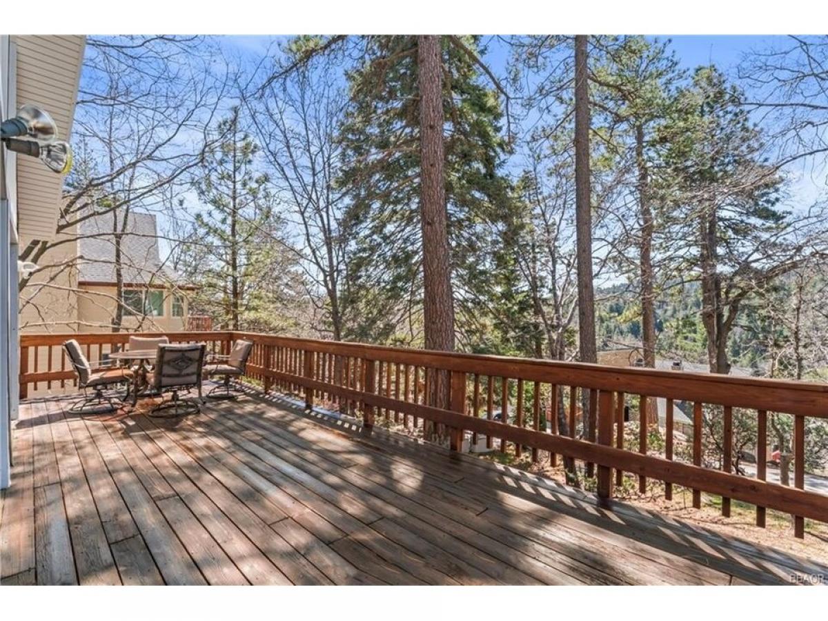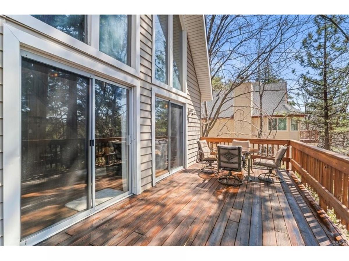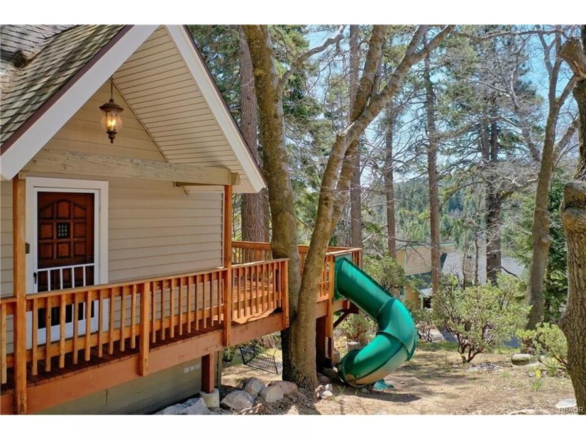 Terrific Mountain Chalet with Lake Rights! Located on a quiet, tree-lined street in a sought-after neighborhood, this beautifully maintained A-frame mountain home blends timeless character with modern comforts. Set on nearly a quarter-acre lot with mostly usable space and a gentle slope, the property offers ample outdoor area for entertaining, relaxing, and enjoying all four seasons. A level covered entry opens to a spacious interior with vaulted open-beam ceilings, hardwood flooring, and a dramatic wall of glass that invites natural light and scenic forest views. The open-concept layout features a living area with a romantic fireplace, flowing seamlessly into the dining space and kitchen. The kitchen is outfitted with white tile countertops, a breakfast bar, and generous cabinet space. From the main living area, step out onto a newly rebuilt, oversized deckmdash;ideal for outdoor dining, lounging, and taking in the mountain air. The exterior space also includes a custom Twister Slide, adding a fun and unique touch. The main level includes a bedroom and full bath, while upstairs offers two additional well-sized bedrooms and a second full bath. Recent updates including newer carpet upstairs, complementing the original wood paneling throughout the home for a warm, inviting atmosphere. Additional highlights include four on-site parking spaces and a location on a main plowed road, ensuring easy year-round access. This property may be offered fully furnished.