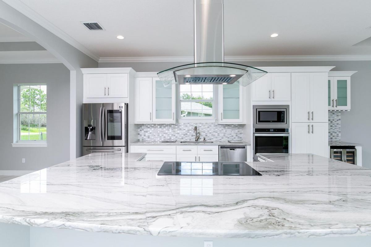 Mint condition! 3,444 sq ft custom built 2019 Builder's home with a unique floorplan, Porcelain tile floors and 14' volume Ceilings. The Kitchen features white cabinetry, Quartz countertops, Stainless Steel Appliances, oversized Island with Cooktop. Large 14k sq ft lot, Impact Windows throughout, white Vinyl Fence, 3 Car Garage, Circular Paved Driveway and a Metal Roof. Bring your cars, toys and golf cart, there is plenty of room! Elegant Travertine tile surrounds the Pool area. Pool features include a Jacuzzi, Heater and a Sun Shelf to enjoy sitting in the water under the Tiki table. No HOA!