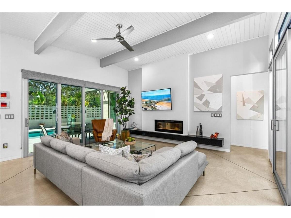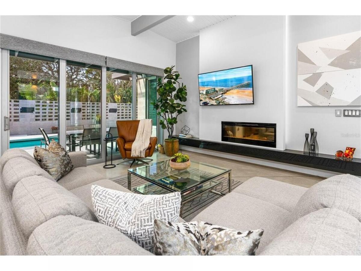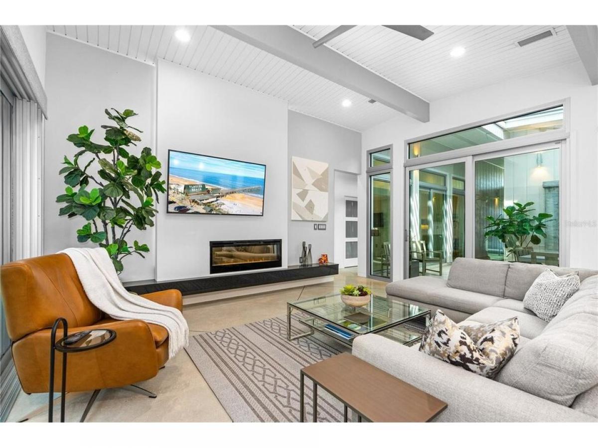 This custom-designed, Eichler-inspired Mid-Century Modern home, built in 2016, masterfully combines timeless architecture with contemporary comfort. Constructed with durable CMU block and proudly showing off its striking four-foot soffit overhangs, this home ensures both energy efficiency and low maintenance. Inside, soaring vaulted ceilings span the entry, atrium, family room, kitchen, and master suite, all accentuated by Plytanium tongue-and-groove finishes. Polished concrete floors throughout create a sleek, modern aesthetic, complemented by solid core frosted glass doors for a touch of understated elegance. All windows and sliders are Low E, PGT Impact resistant tinted windows. The kitchen is a culinary dream, featuring quartz countertops and a stunning 4#039;x8#039; island with double waterfall ends and a 24#039;#039; beverage cooler. High-gloss Italian cabinetry combines with top-of-the-line GE Profile stainless steel appliances, including a 36#039;#039; gas cooktop and an adjacent pantry equipped with built-in shelving for practical convenience. In the vaulted design is carried throughout the home. Stepping into the living room, a 13-foot granite mantel sets a bold tone, paired with a 52quot; electric fireplace, integrated LED lighting, and a 65quot; Samsung flat-screen TV. The primary bedroom and family room sliding and stackable doors open up to the pool area, allowing the outdoors to be brought inside. Additionally, the primary suite and guest room have luxurious en-suite baths with walk-in tile and stone showers, quartz-topped vanities, and custom cabinetry for a spa-like experience. An interior atrium, complete with motorized pergola, rimmed with 10#039; floor-to-ceiling windows and doors, creates a serene retreat. The space features an 8#039; concrete and tile water feature, tropical plants, and a seamless connection to the outdoors. Outside, the 30#039; saltwater solar heated lap pool and private patio, bordered by mid-century-inspired walls, provides a peaceful oasis. The garage door with transom windows brings sophistication to the garage, where an elevated brand new (April 2025) HVAC system maximizes space efficiency. Additional features include a whole-house Aquasana water filtration system, a tankless propane water heater, and a dedicated laundry room with extensive cabinetry, granite countertops, and modern appliances. This home is more than a residence, it#039;s a statement of modern design and craftsmanship, perfectly positioned in the heart of Flagler Beach. A true standout, it offers elegance, functionality, and unparalleled style.