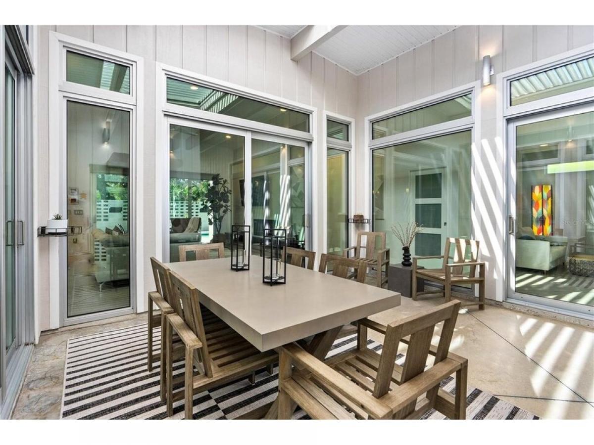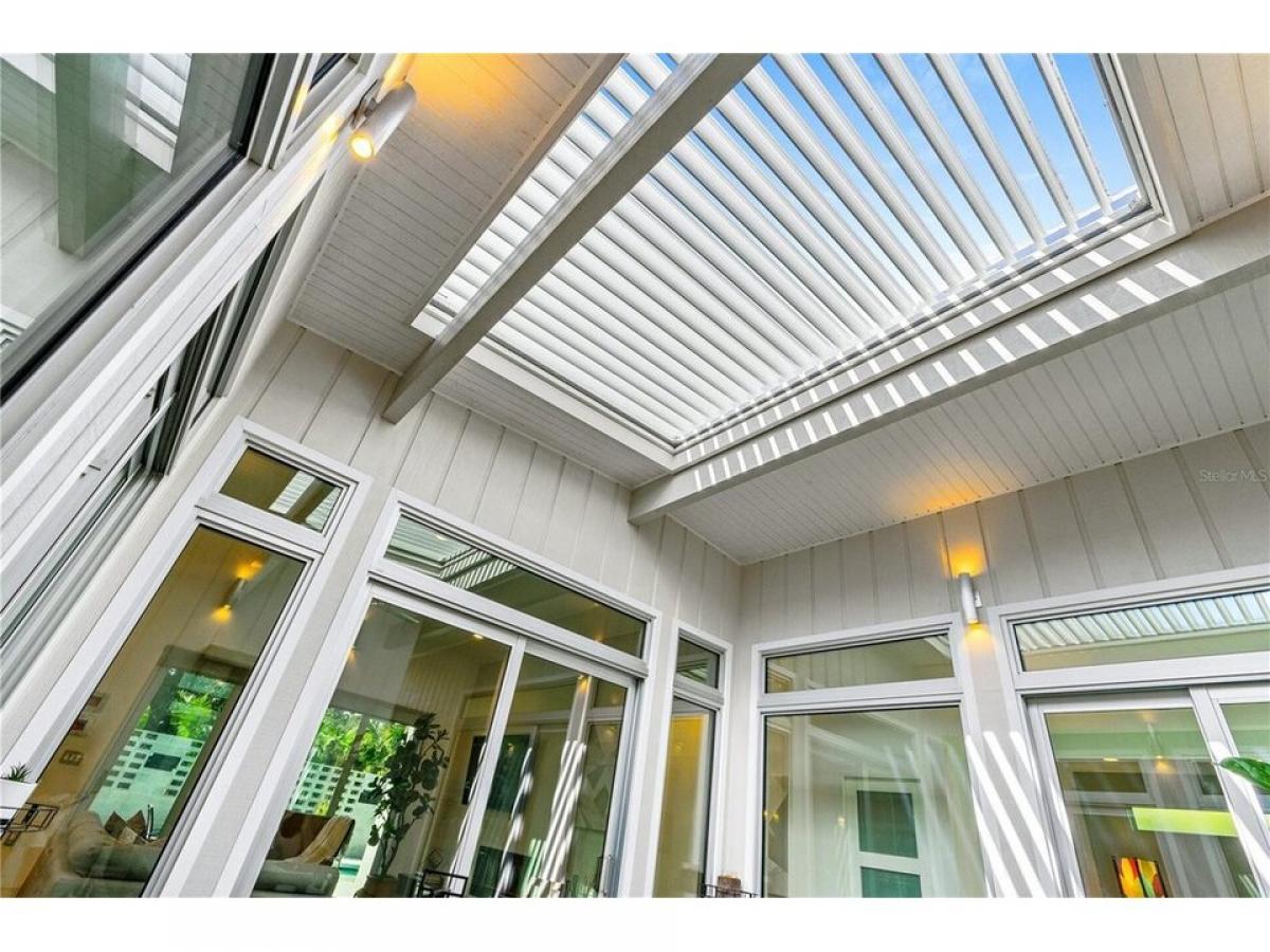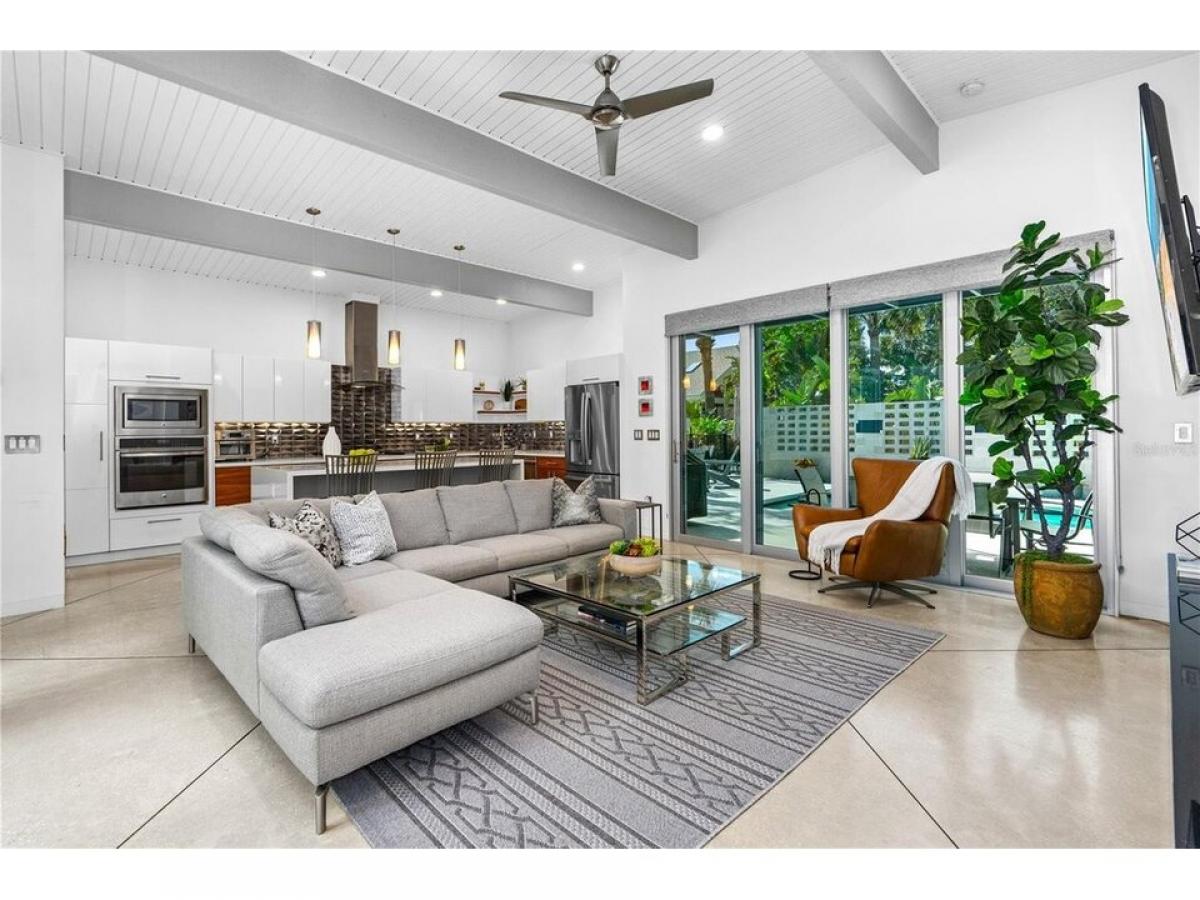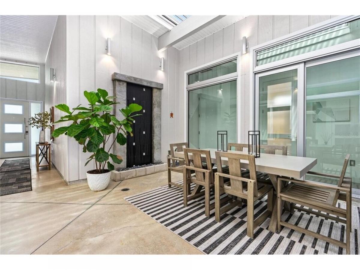 This custom-designed, Eichler-inspired Mid-Century Modern home, built in 2016, masterfully combines timeless architecture with contemporary comfort. Constructed with durable CMU block and proudly showing off its striking four-foot soffit overhangs, this home ensures both energy efficiency and low maintenance. Inside, soaring vaulted ceilings span the entry, atrium, family room, kitchen, and master suite, all accentuated by Plytanium tongue-and-groove finishes. Polished concrete floors throughout create a sleek, modern aesthetic, complemented by solid core frosted glass doors for a touch of understated elegance. All windows and sliders are Low E, PGT Impact resistant tinted windows. The kitchen is a culinary dream, featuring quartz countertops and a stunning 4#039;x8#039; island with double waterfall ends and a 24#039;#039; beverage cooler. High-gloss Italian cabinetry combines with top-of-the-line GE Profile stainless steel appliances, including a 36#039;#039; gas cooktop and an adjacent pantry equipped with built-in shelving for practical convenience. In the vaulted design is carried throughout the home. Stepping into the living room, a 13-foot granite mantel sets a bold tone, paired with a 52quot; electric fireplace, integrated LED lighting, and a 65quot; Samsung flat-screen TV. The primary bedroom and family room sliding and stackable doors open up to the pool area, allowing the outdoors to be brought inside. Additionally, the primary suite and guest room have luxurious en-suite baths with walk-in tile and stone showers, quartz-topped vanities, and custom cabinetry for a spa-like experience. An interior atrium, complete with motorized pergola, rimmed with 10#039; floor-to-ceiling windows and doors, creates a serene retreat. The space features an 8#039; concrete and tile water feature, tropical plants, and a seamless connection to the outdoors. Outside, the 30#039; saltwater solar heated lap pool and private patio, bordered by mid-century-inspired walls, provides a peaceful oasis. The garage door with transom windows brings sophistication to the garage, where an elevated brand new (April 2025) HVAC system maximizes space efficiency. Additional features include a whole-house Aquasana water filtration system, a tankless propane water heater, and a dedicated laundry room with extensive cabinetry, granite countertops, and modern appliances. This home is more than a residence, it#039;s a statement of modern design and craftsmanship, perfectly positioned in the heart of Flagler Beach. A true standout, it offers elegance, functionality, and unparalleled style.