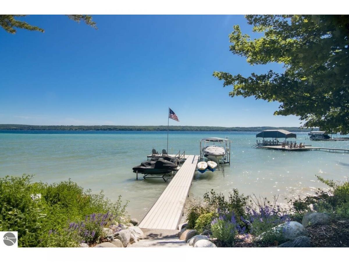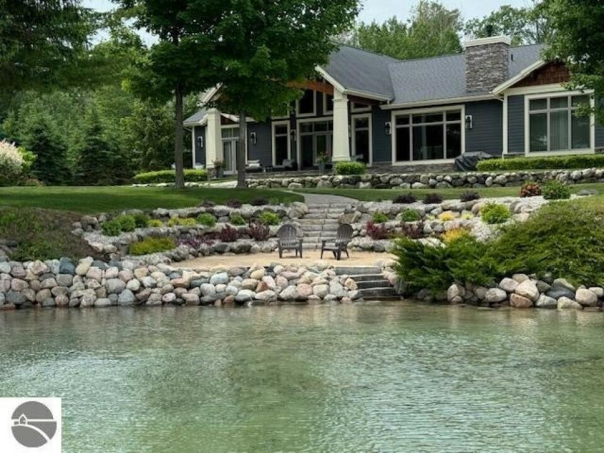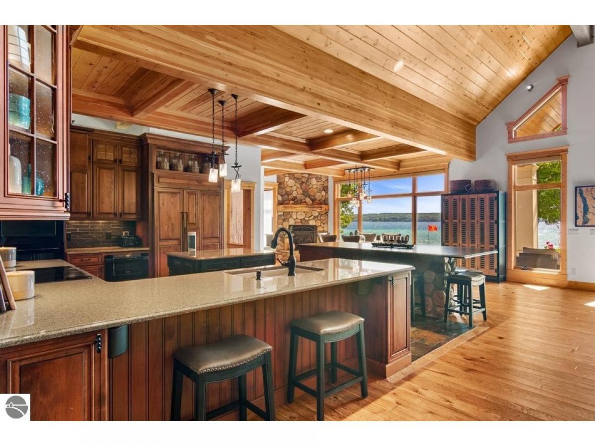 TORCH LAKE - Welcome to your dream home which is being sold as "Turn-Key" & has everything you will need! A stunning ranch residence meticulously designed & maintained for luxury and comfort that offers 5 bedrooms, 4 full baths and 2 half baths. This exquisite property features a spacious Great Room with 20-foot ceiling. Home boasts 3-River Rock gas fireplaces, complemented by elegant barn timber mantles and flagstone hearths. Radiant heated flooring, ensuring warmth throughout all flagstone and tile flooring. The gourmet kitchen is a chef's delight with a 9.5 custom island and large walk-in pantry. The primary bedroom is highlighted by a custom ensuite bathroom & closet with a library ladder system. Your guests will enjoy the convenience of a second lakeside bedroom suite, as well as two additional bedrooms, a bathroom, and a large office with ample storage in the main house. The Carriage House, built to match the main home's quality, offers vaulted ceilings, an efficiency kitchen, and an oversized bunk room, perfect for guests. Entertain outdoors on the terraced flagstone patio, hailed as the "Best Porch on Torch," complete with custom accent lighting and a lakeside patio with a fireplace and BBQ. Both garages are equipped with gas heaters, custom epoxy floors, and hot/cold hose faucets, ideal for any season. With 119 feet of sandy beachfront, boulder terraces, a whole property generator, and new landscaping, this estate is an unparalleled sanctuary offering the best of Torch Lake living.