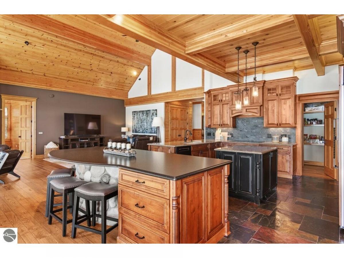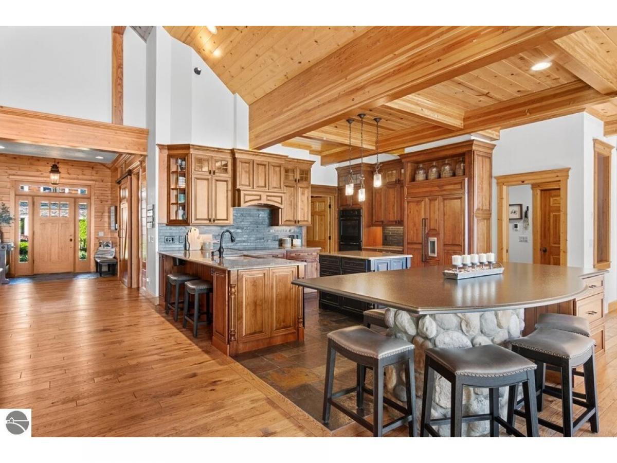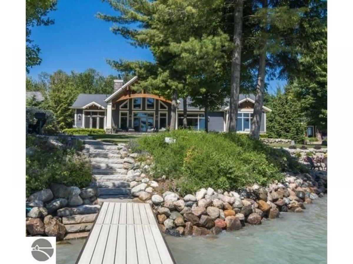 TORCH LAKE - Welcome to your dream home which is being sold as "Turn-Key" & has everything you will need! A stunning ranch residence meticulously designed & maintained for luxury and comfort that offers 5 bedrooms, 4 full baths and 2 half baths. This exquisite property features a spacious Great Room with 20-foot ceiling. Home boasts 3-River Rock gas fireplaces, complemented by elegant barn timber mantles and flagstone hearths. Radiant heated flooring, ensuring warmth throughout all flagstone and tile flooring. The gourmet kitchen is a chef's delight with a 9.5 custom island and large walk-in pantry. The primary bedroom is highlighted by a custom ensuite bathroom & closet with a library ladder system. Your guests will enjoy the convenience of a second lakeside bedroom suite, as well as two additional bedrooms, a bathroom, and a large office with ample storage in the main house. The Carriage House, built to match the main home's quality, offers vaulted ceilings, an efficiency kitchen, and an oversized bunk room, perfect for guests. Entertain outdoors on the terraced flagstone patio, hailed as the "Best Porch on Torch," complete with custom accent lighting and a lakeside patio with a fireplace and BBQ. Both garages are equipped with gas heaters, custom epoxy floors, and hot/cold hose faucets, ideal for any season. With 119 feet of sandy beachfront, boulder terraces, a whole property generator, and new landscaping, this estate is an unparalleled sanctuary offering the best of Torch Lake living.
