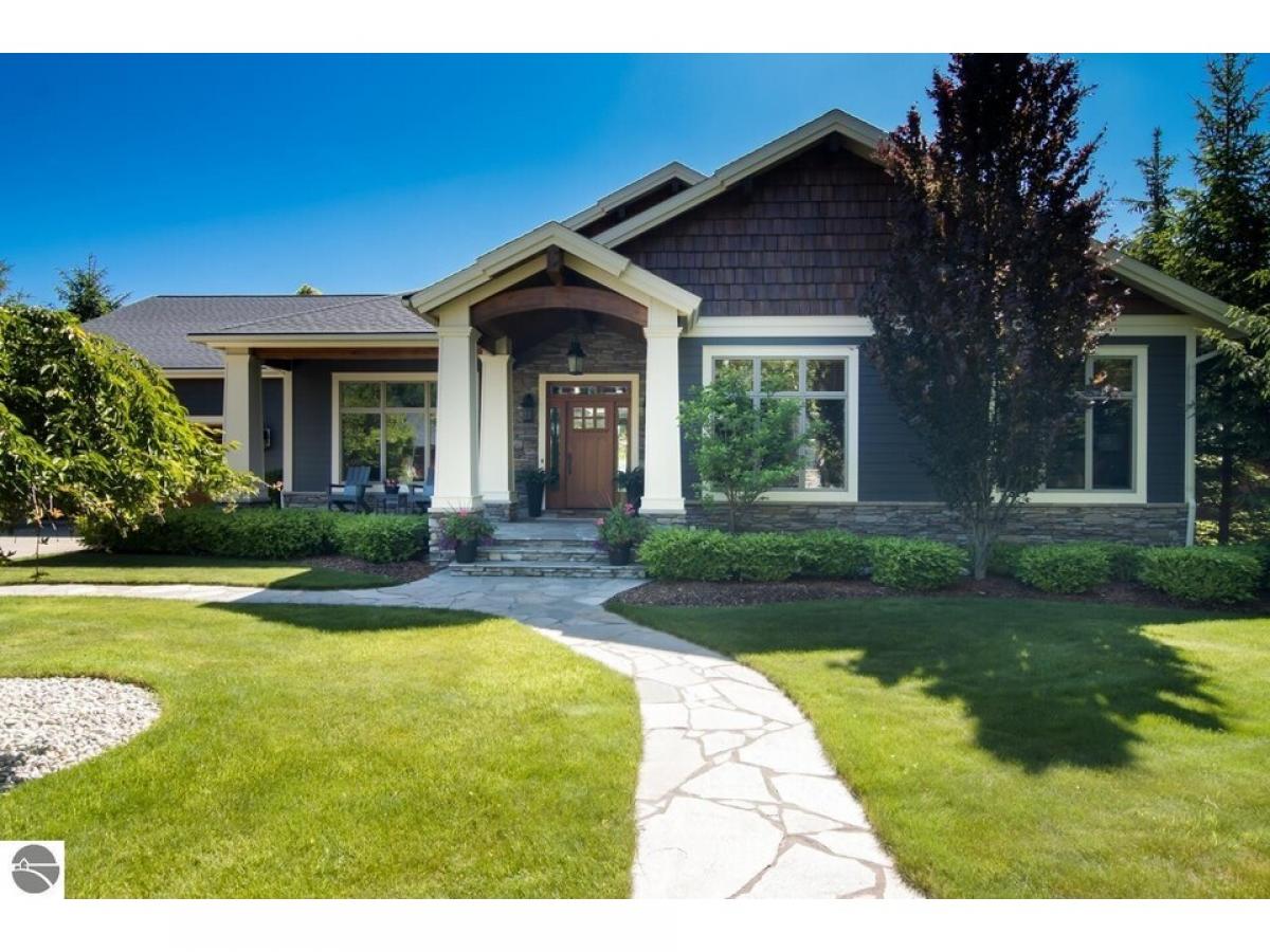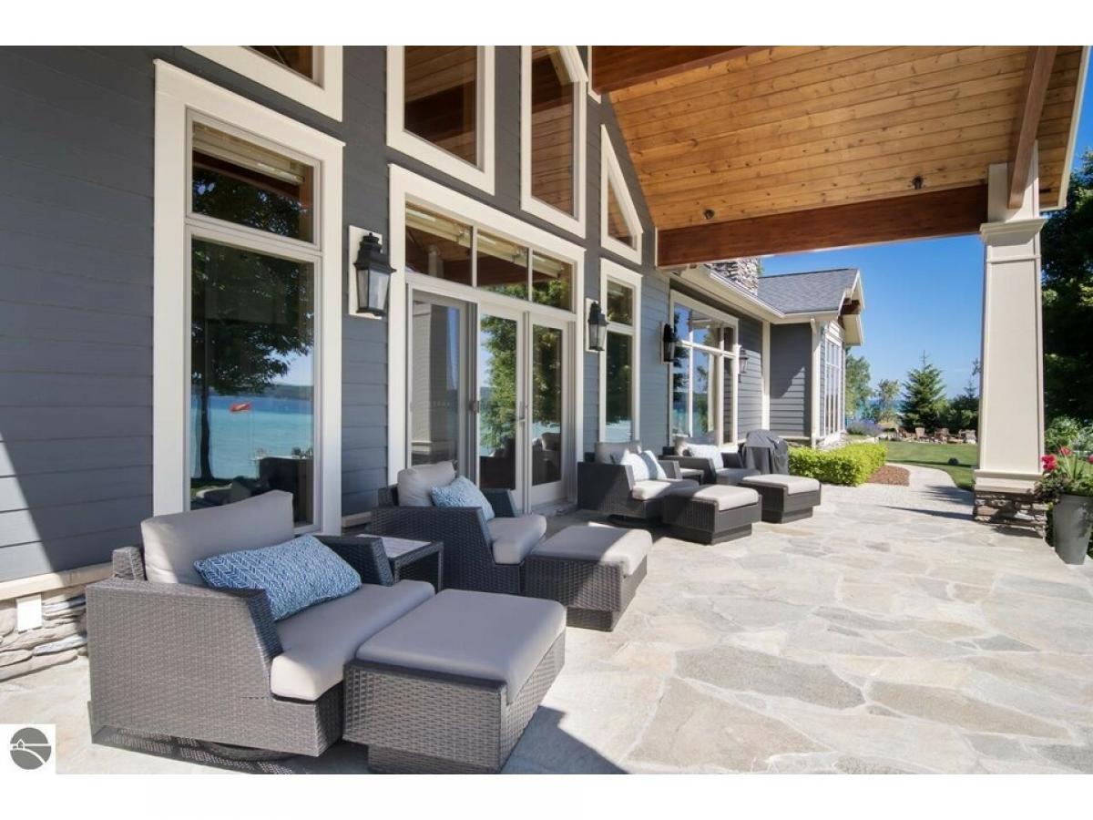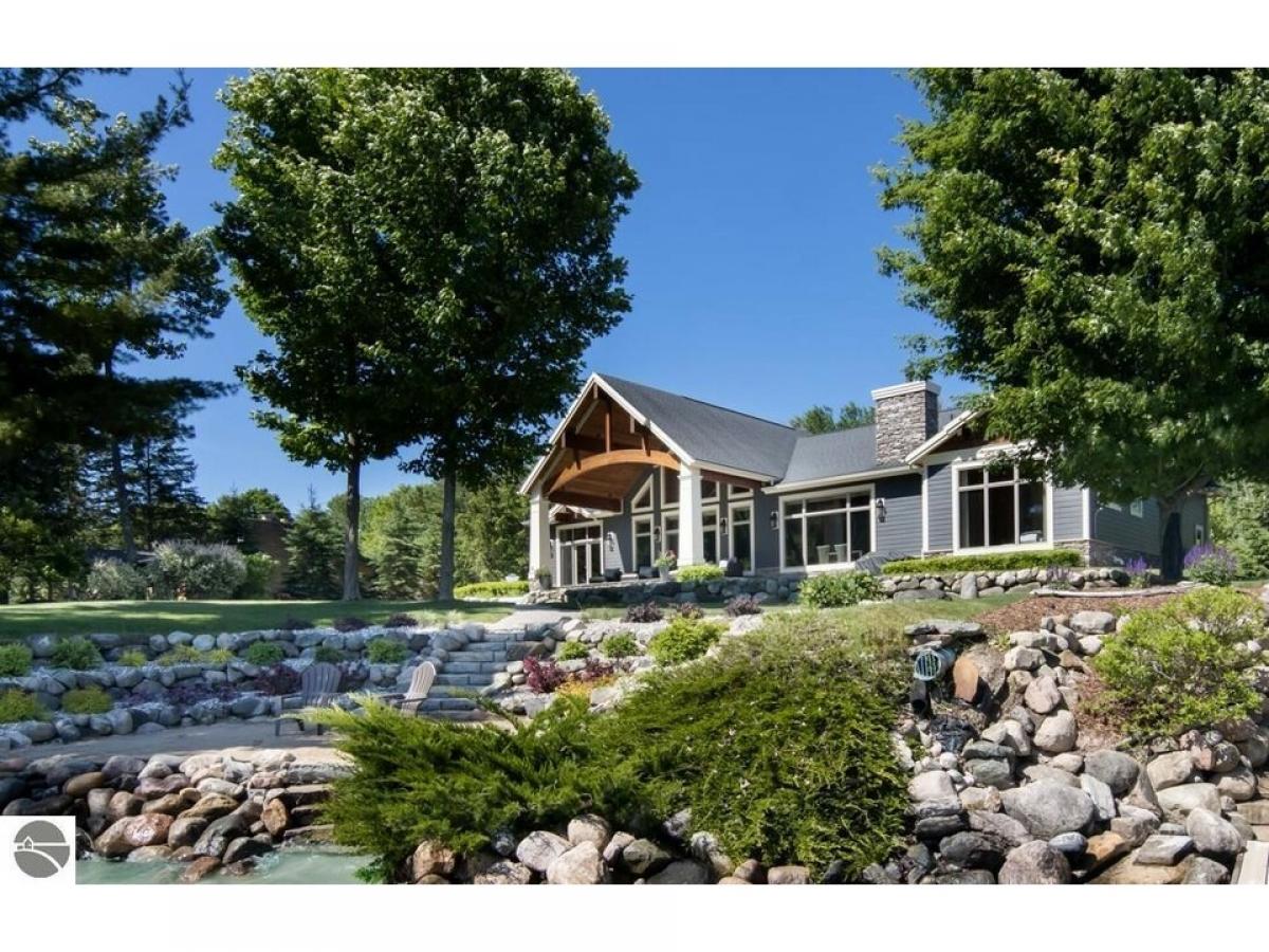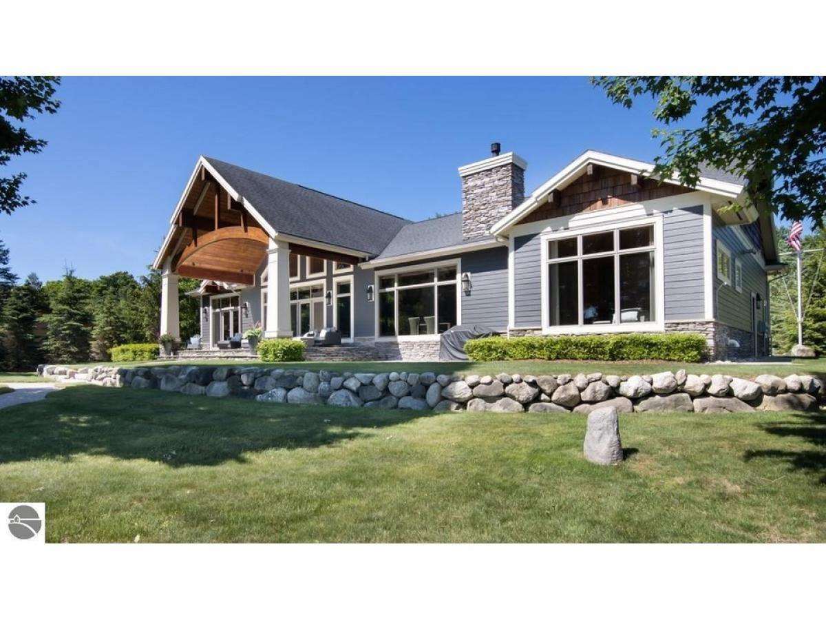TORCH LAKE - Welcome to your dream home which is being sold as "Turn-Key" & has everything you will need! A stunning ranch residence meticulously designed & maintained for luxury and comfort that offers 5 bedrooms, 4 full baths and 2 half baths. This exquisite property features a spacious Great Room with 20-foot ceiling. Home boasts 3-River Rock gas fireplaces, complemented by elegant barn timber mantles and flagstone hearths. Radiant heated flooring, ensuring warmth throughout all flagstone and tile flooring. The gourmet kitchen is a chef's delight with a 9.5 custom island and large walk-in pantry. The primary bedroom is highlighted by a custom ensuite bathroom & closet with a library ladder system. Your guests will enjoy the convenience of a second lakeside bedroom suite, as well as two additional bedrooms, a bathroom, and a large office with ample storage in the main house. The Carriage House, built to match the main home's quality, offers vaulted ceilings, an efficiency kitchen, and an oversized bunk room, perfect for guests. Entertain outdoors on the terraced flagstone patio, hailed as the "Best Porch on Torch," complete with custom accent lighting and a lakeside patio with a fireplace and BBQ. Both garages are equipped with gas heaters, custom epoxy floors, and hot/cold hose faucets, ideal for any season. With 119 feet of sandy beachfront, boulder terraces, a whole property generator, and new landscaping, this estate is an unparalleled sanctuary offering the best of Torch Lake living.