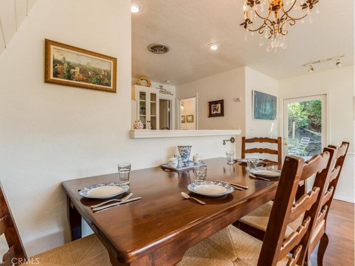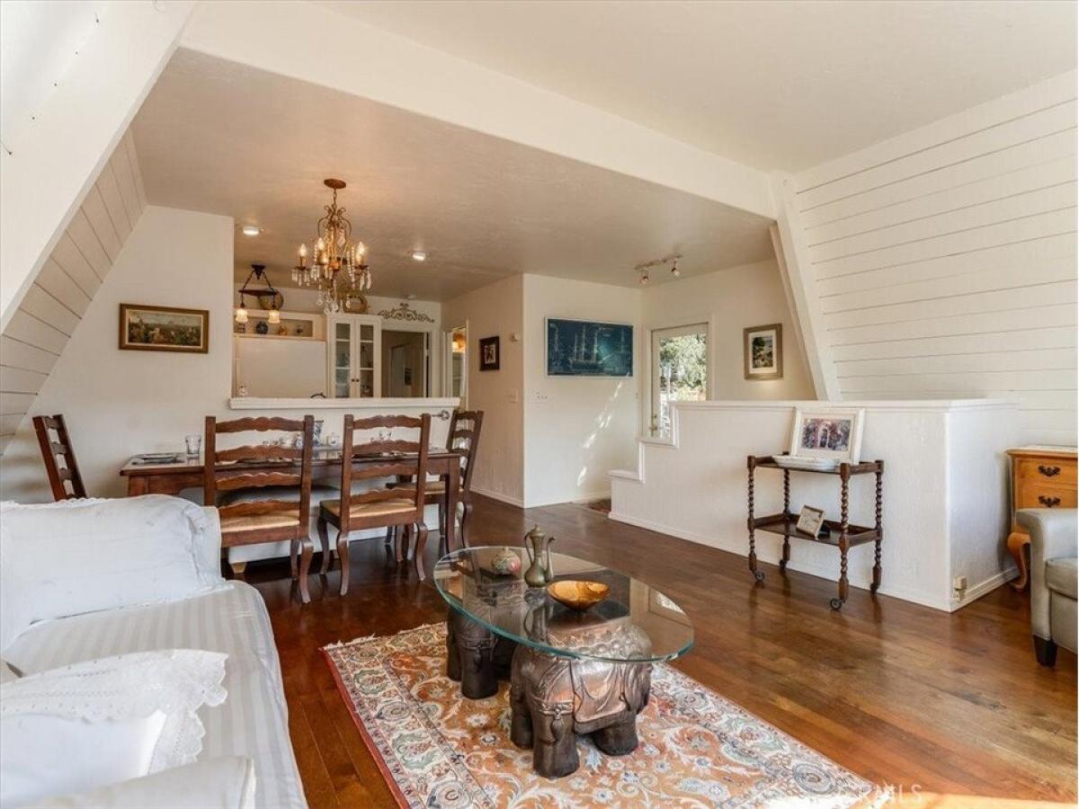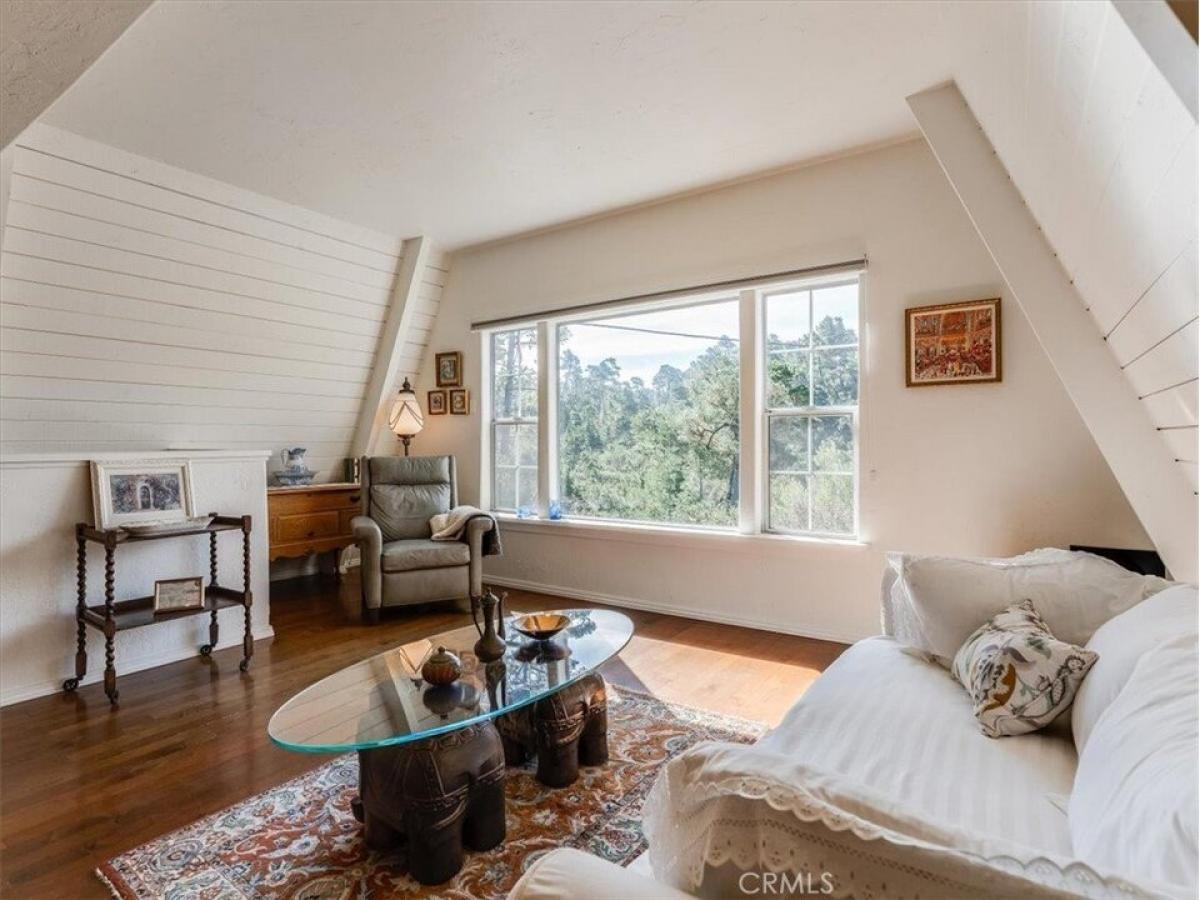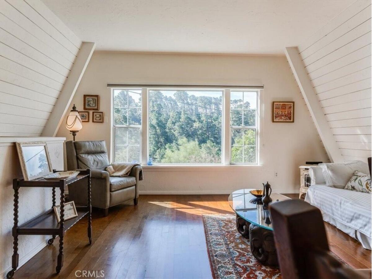 Nestled among the Cambria pines, this A-frame cottage is a true sanctuary. The harmony of shapes, textures, and light come together to craft a timeless abode, where every window frames a vista of verdant pine trees. Not another house is visible in this homersquo;s view corridor so it is quite private and special! The charm of this cottage is in its details - wooden and tile floors blend effortlessly with wood walls, some of which are painted white to enhance the cozy cottage atmosphere. The living area boasts an open floor plan, anchored by a large west-facing window that invites the golden hues of the afternoon sun to bathe the room in warmth. A half-wall separates the living and dining areas from the kitchen, where white tiles with blue accents and wood and glass faced cabinetry evoke the tranquility of the Swedish countryside. Throughout the home are vintage chandeliers and light fixtures. The bedroom on the main level has a large walk-in closet and private view deck. Another deck off the living area provides the ultimate relaxation space. It is privatized by mature landscaping and has a staircase to the top floor of the home which is comprised of a sitting area, another bedroom and a bathroom. The sloped wood walls with windows culminate at the top of the A-frame. A west facing picture window lies above the bed area. This is a self-sufficient space with its own entrance at the top of the deck. At the entrance level of the home is a large bonus/family room with many windows and a French door bringing in afternoon sunshine. This room has two closets, one of which houses the laundry facilities. The cottage is located on four oversized private lots. This sale includes the furniture and furnishings and has a Vacation Rental License. The owners had the roof replaced. The home was recently treated and tented for termites. There are two charming freestanding fireplaces in this Cambria cottage. The cottage is located just a short walk to one of the trail entrances to the Fiscalini walking trails and dog park. There is a floor plan in with the pictures. Please also visit the two 360 virtual tours.