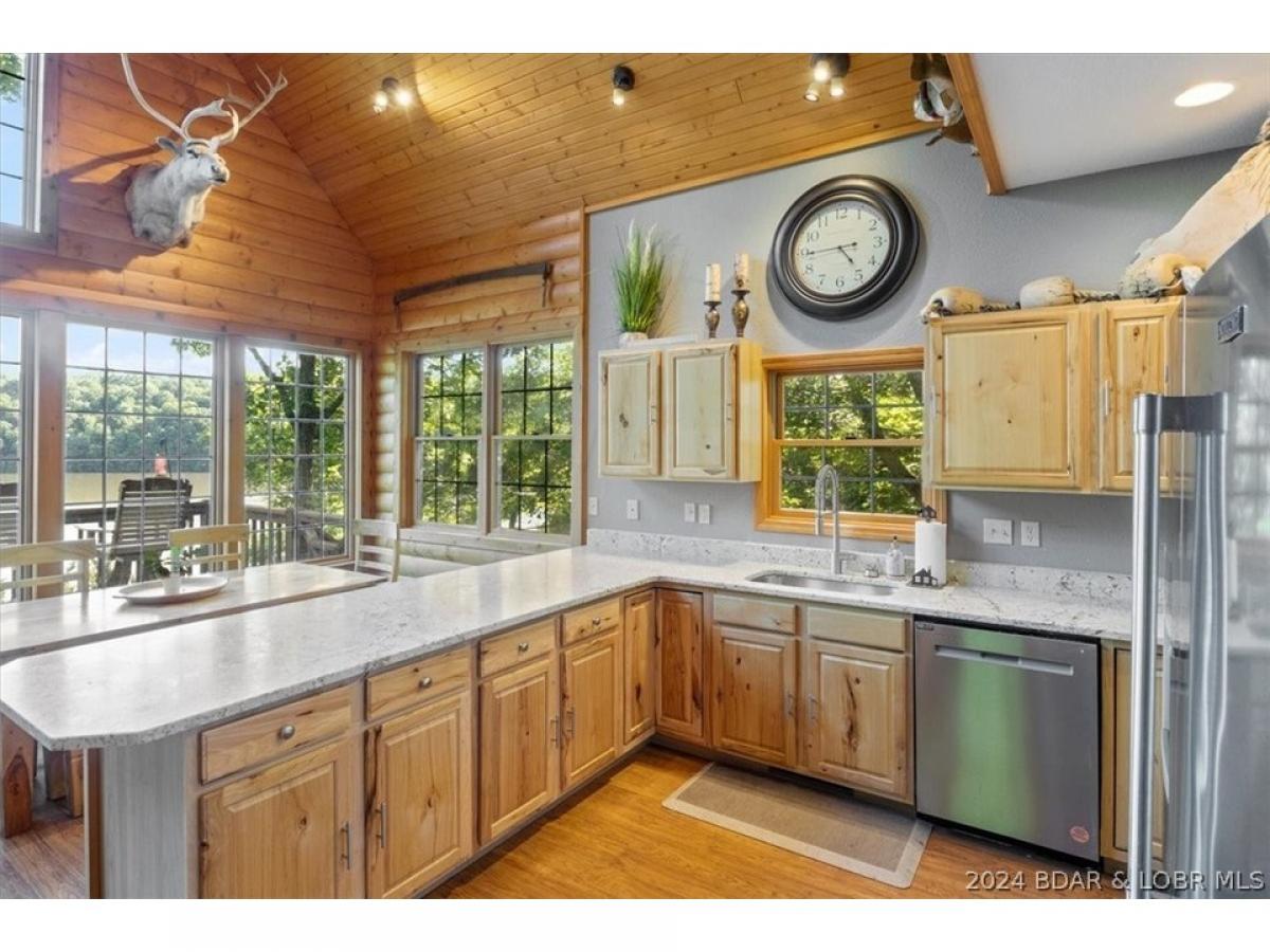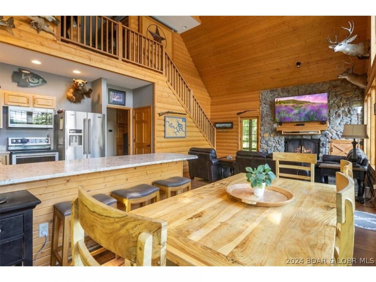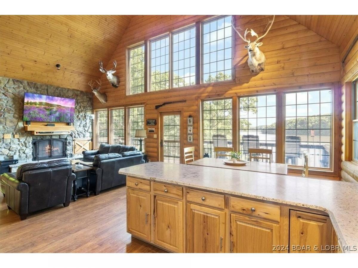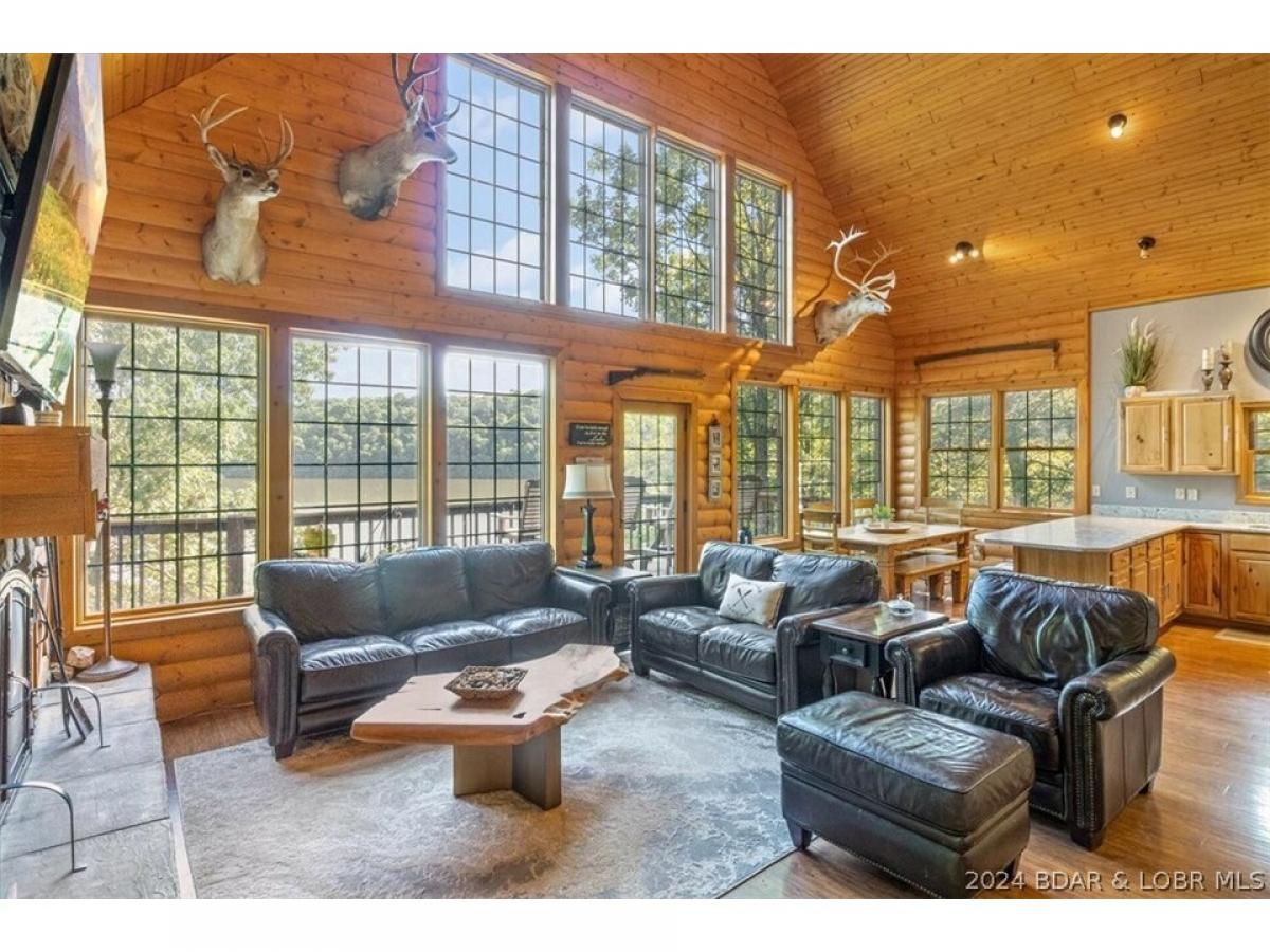 Stunning lakefront home with privacy, space, and a shop! A true lake home on the 67 Mile Marker of Lake of the Ozarks with log siding that was recently stained, vaulted ceilings, tons of windows, and lots of upgrades. Selling furnished and ready for lake season, this gorgeous home features new granite countertops, new stainless appliances, interior log siding, and beautiful functioning wood burning fireplace. Enjoy the outdoors with plenty of entertaining room on the covered decks and escape the in screened deck area! Maintenance free composite decking walkway and steps down to the dock. Boat lift and jetski lifts included plus the cove location is perfect for swimming, has excellent fishing, and provides protection from main channel waves. With over 200ft of shoreline and 11 acres, this will feel like a private retreat while still having high speed fiber optic internet! Relax and unwind by the fire pit or in the new hot tub that is included with the sale! Plenty of storage as the basement is a one car garage with a large unfinished room for utility and additional sleeping plus a detached oversized 2 car shop with electric and concrete floors!