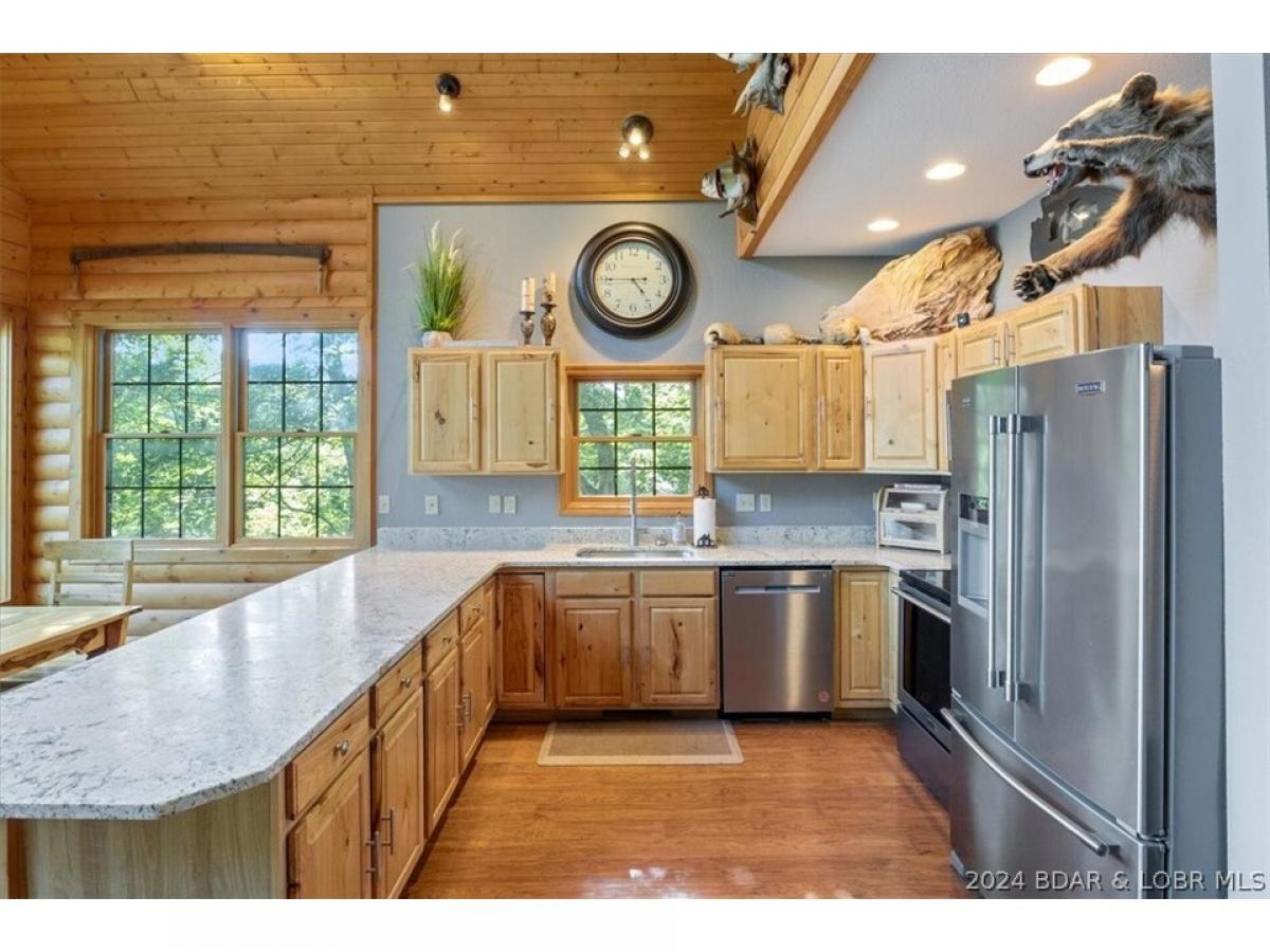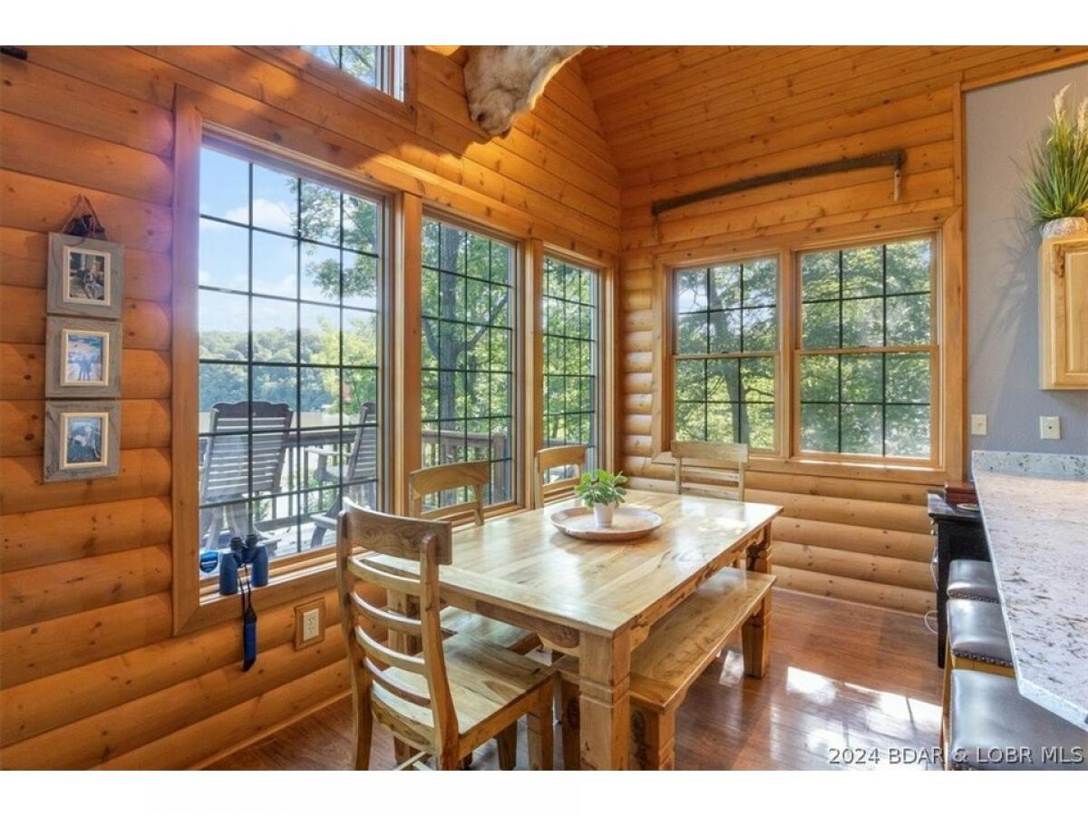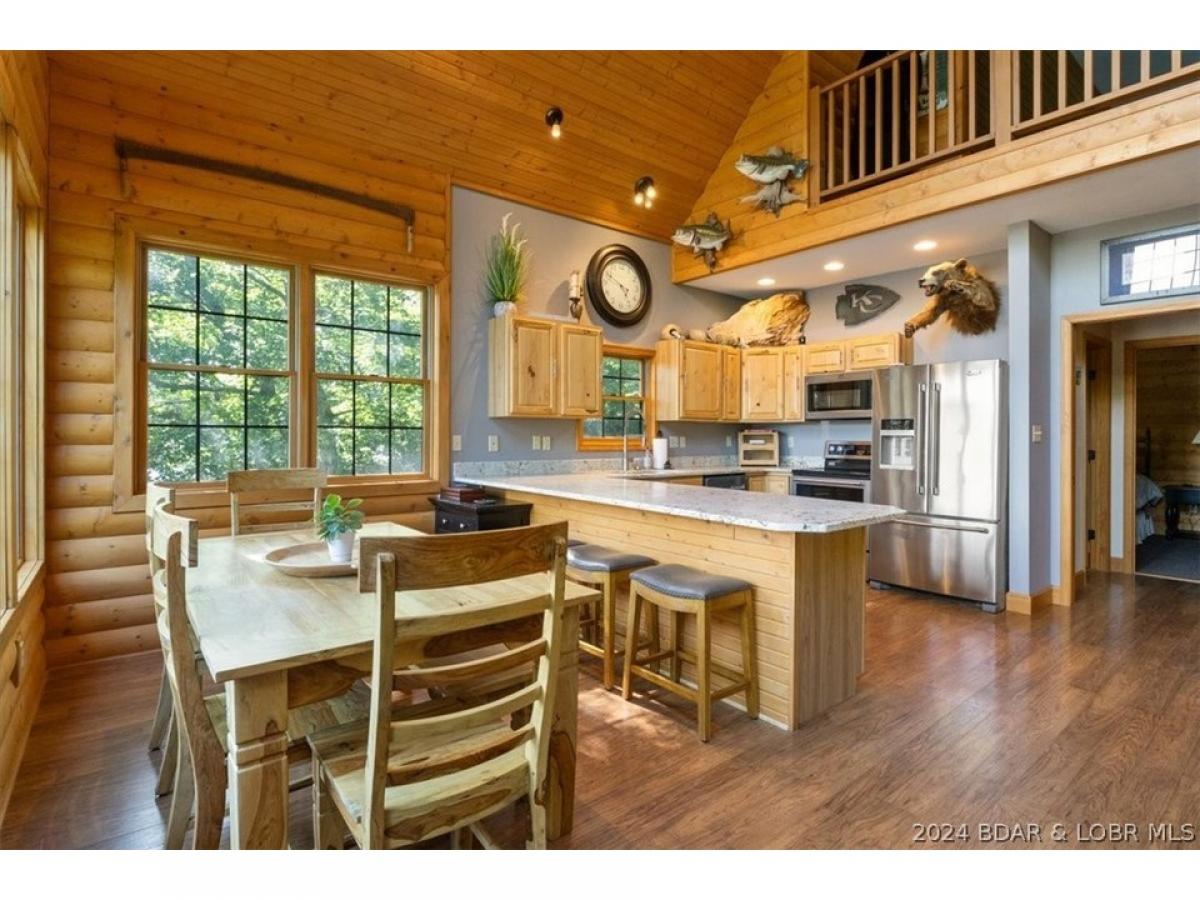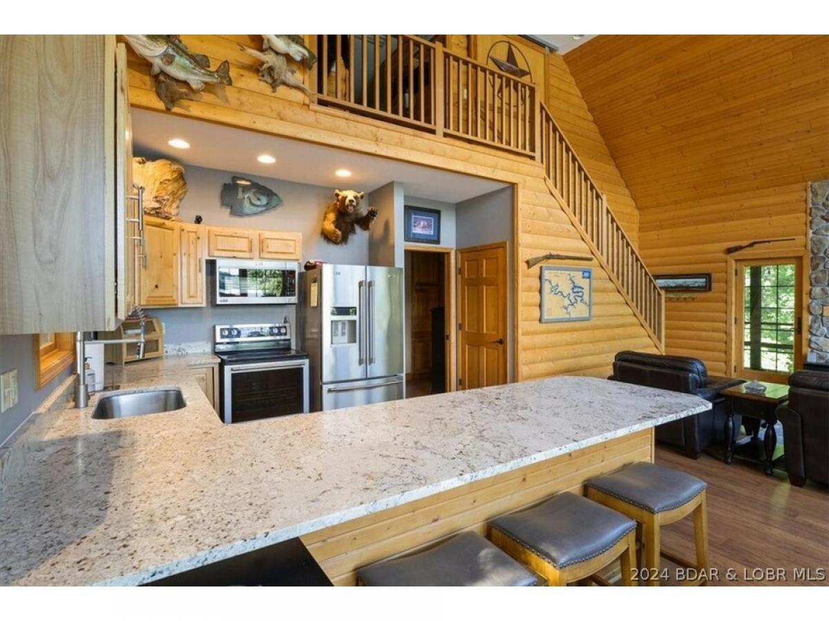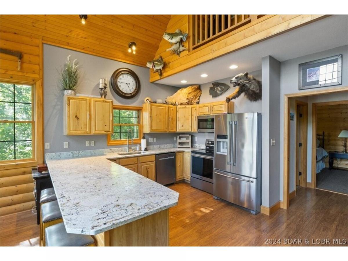 Stunning lakefront home with privacy, space, and a shop! A true lake home on the 67 Mile Marker of Lake of the Ozarks with log siding that was recently stained, vaulted ceilings, tons of windows, and lots of upgrades. Selling furnished and ready for lake season, this gorgeous home features new granite countertops, new stainless appliances, interior log siding, and beautiful functioning wood burning fireplace. Enjoy the outdoors with plenty of entertaining room on the covered decks and escape the in screened deck area! Maintenance free composite decking walkway and steps down to the dock. Boat lift and jetski lifts included plus the cove location is perfect for swimming, has excellent fishing, and provides protection from main channel waves. With over 200ft of shoreline and 11 acres, this will feel like a private retreat while still having high speed fiber optic internet! Relax and unwind by the fire pit or in the new hot tub that is included with the sale! Plenty of storage as the basement is a one car garage with a large unfinished room for utility and additional sleeping plus a detached oversized 2 car shop with electric and concrete floors!