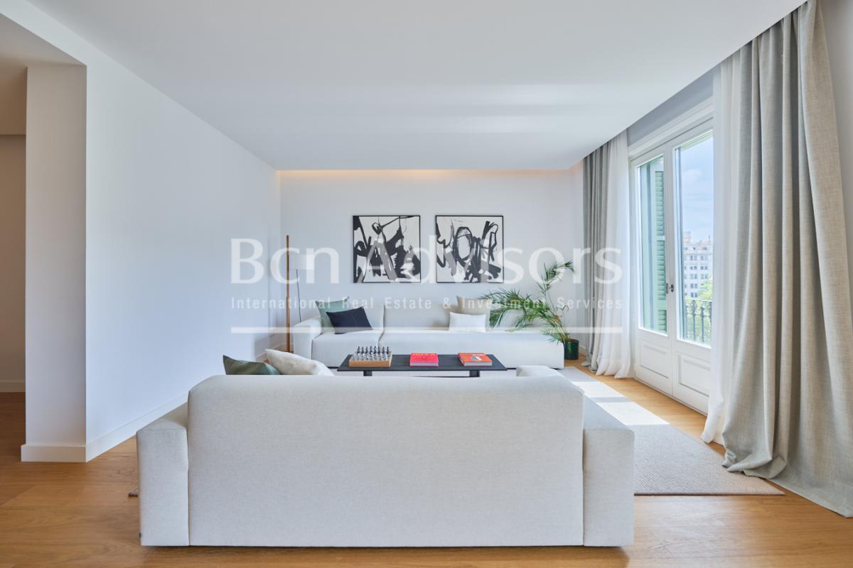 This brand new flat is located in a completely refurbished historic building on Paseo de Gracia in Barcelona, the most sought-after avenue in the city and one of the most emblematic in Europe, with exclusive luxury homes. This is a unique opportunity to live in the centre of the city with maximum comfort and the highest quality materials and finishes, in a building with terrace and swimming pool.This flat is located on the third floor and has 217 built interior sqm. The entrance hall distributes the day and night areas on both sides. The day area consists of a large continuous space but in which each area occupies its own differentiated space. The 34 sqm living room has access to 2 balconies facing Paseo de Gracia, with its fantastic urban and architectural views. This communicates with a dining room that leads to the semi-open kitchen, fully equipped with top brand appliances, which has an adjoining laundry room.