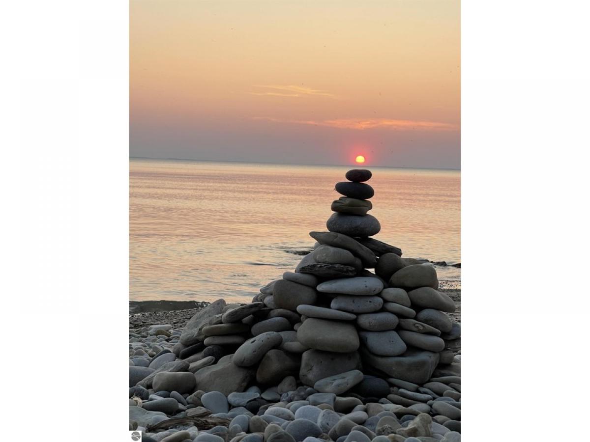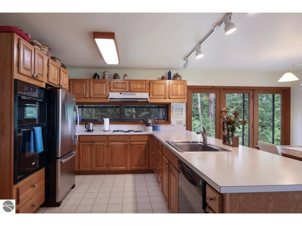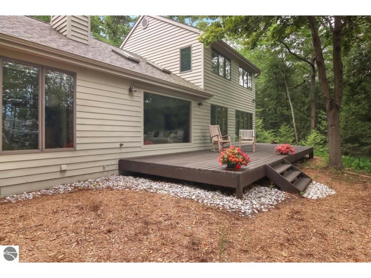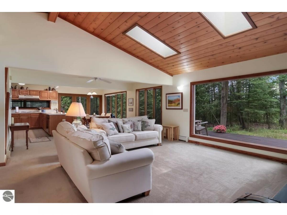 400' GRAND TRAVERSE BAY FRONTAGE! ENJOY THE WILDERNESS AND SUNSETS OVER GRAND TRAVERSE BAY will entertain you every night from this gorgeous home. The living room is enhanced by a fireplace, wood paneled vaulted ceiling and a floor to ceiling picture window overlooking your 400 feet of frontage. Enjoy your meals in the sun filled dining area with gorgeous views from expansive windows and head outside to the deck for dining al fresco through the french doors. Well equipped kitchen with double wall ovens, beautiful cabinetry, tile flooring and built ins. Wake up to gorgeous views and the sounds of waves lapping the shoreline from the primary suite on the main level with dual closets and private bath. The sauna will feel wonderful after a day at the beach. Grab your favorite game and head to the sunroom for lively conversation and friendly competition with family and friends. Accented by 6 bedrooms, 3 ½ baths; natural light from the skylights; air conditioning; main floor laundry room; 2-car attached garage; back-up generator included; and so much more. The 13.89 wooded acres give you privacy and room to roam the natural setting. Imagine gathering around the firepit on the lakeshore for stories and s’mores. You will love the beachside deck where you can soak up the sun, read a book and appreciate the natural beauty of your surroundings. Backup generator included. This is the place you have been looking for to relax, rejuvenate and rest. Adjoins 37 acres of nature preserve.
