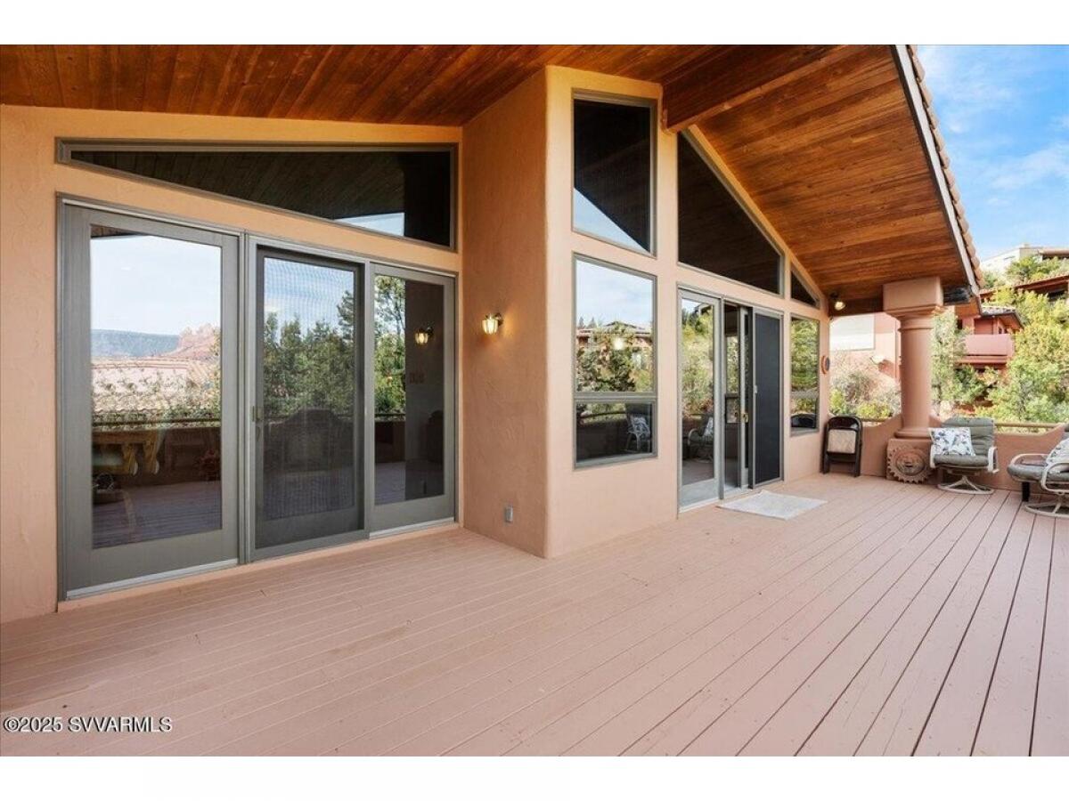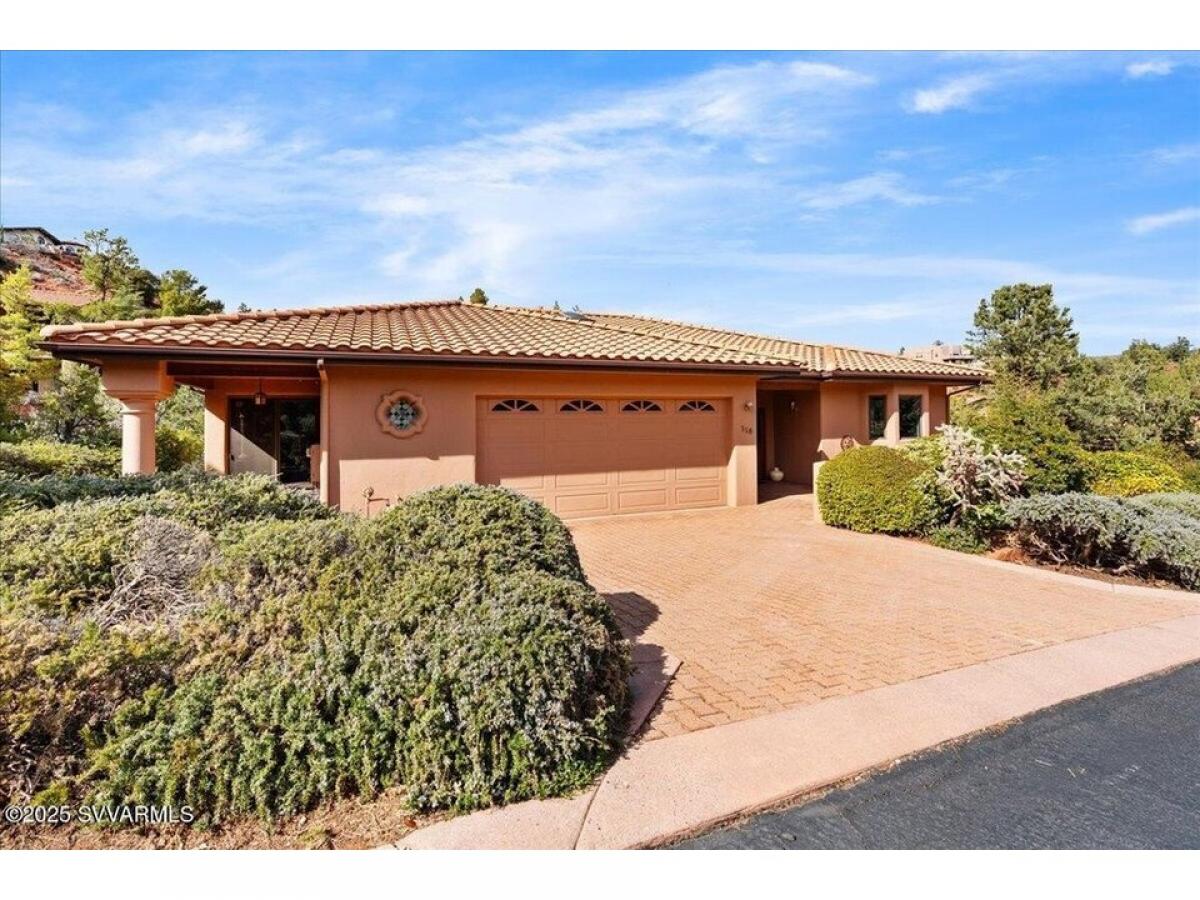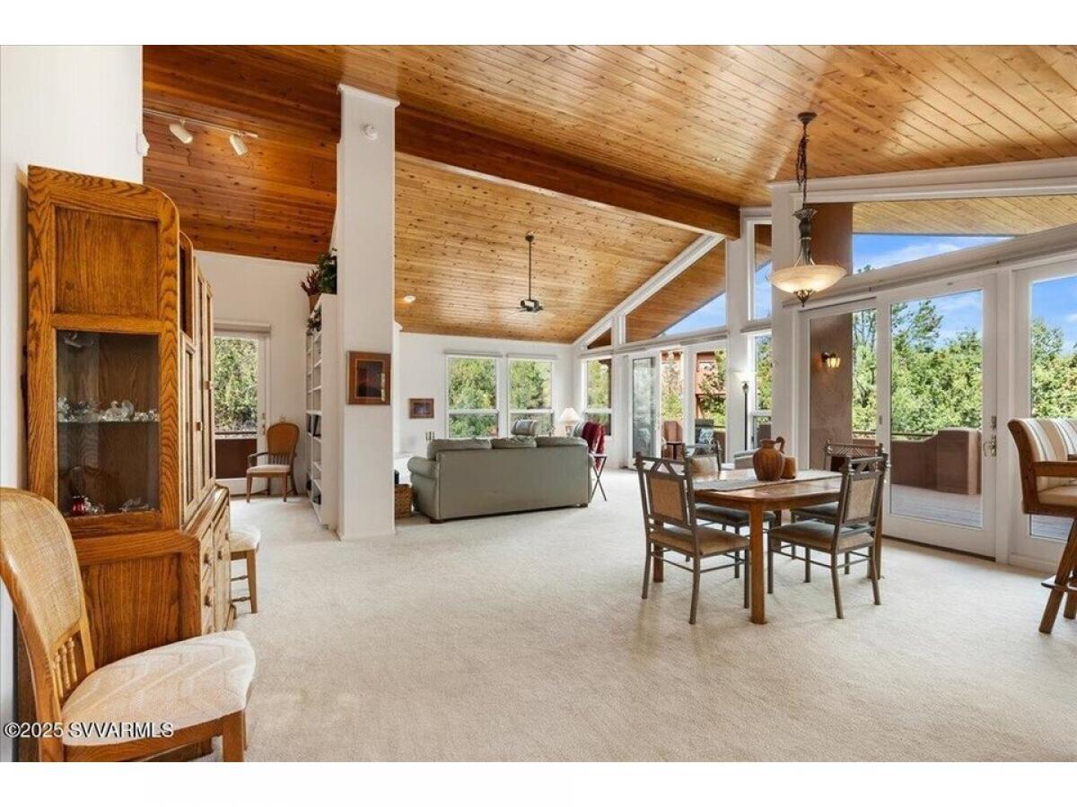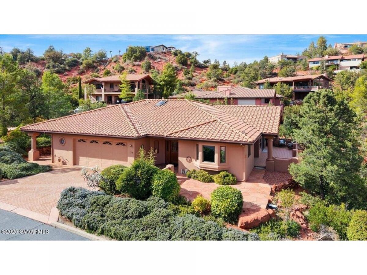 Spacious design with gorgeous vaulted ceiling and stunning red rock views from your living room, kitchen, outdoor decks amp; patios. This home is nestled within the prestigious luxury gated Les Springs community and surrounded by nature and beauty. Featuring floor-to-ceiling windows, a stunning cathedral wood ceiling, and a cozy fireplace. The great room floor plan offers a large kitchen open to the dining and living room. Bedrooms have walk-in closets. The primary suite has deck access and a spacious bathroom with a soaking tub and a separate shower. Les Springs has a community pool, pickleball courts, an exercise room, clubhouse. Dues include water, trash, landscaping, and gate maintenance.Live the Sedona lifestyle where your everyday living feels like a vacation.