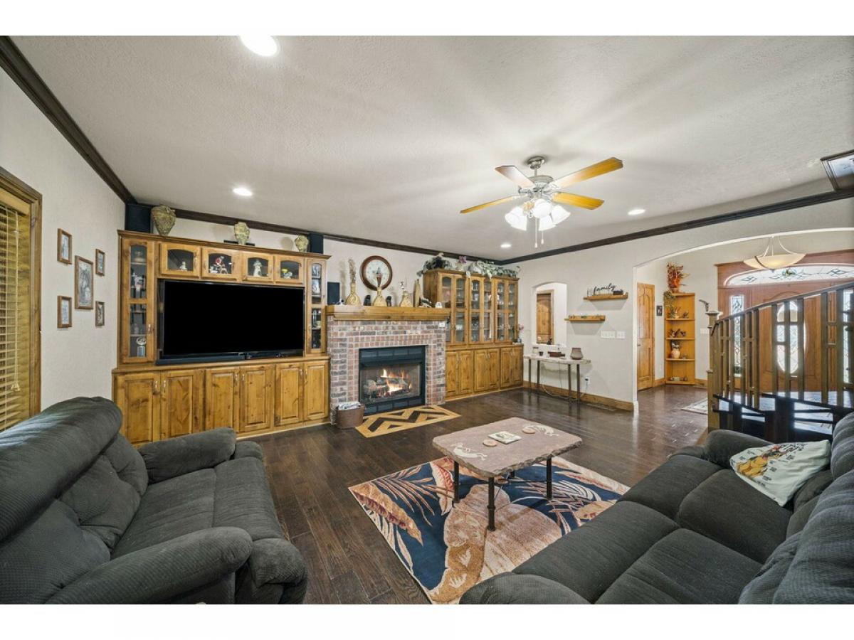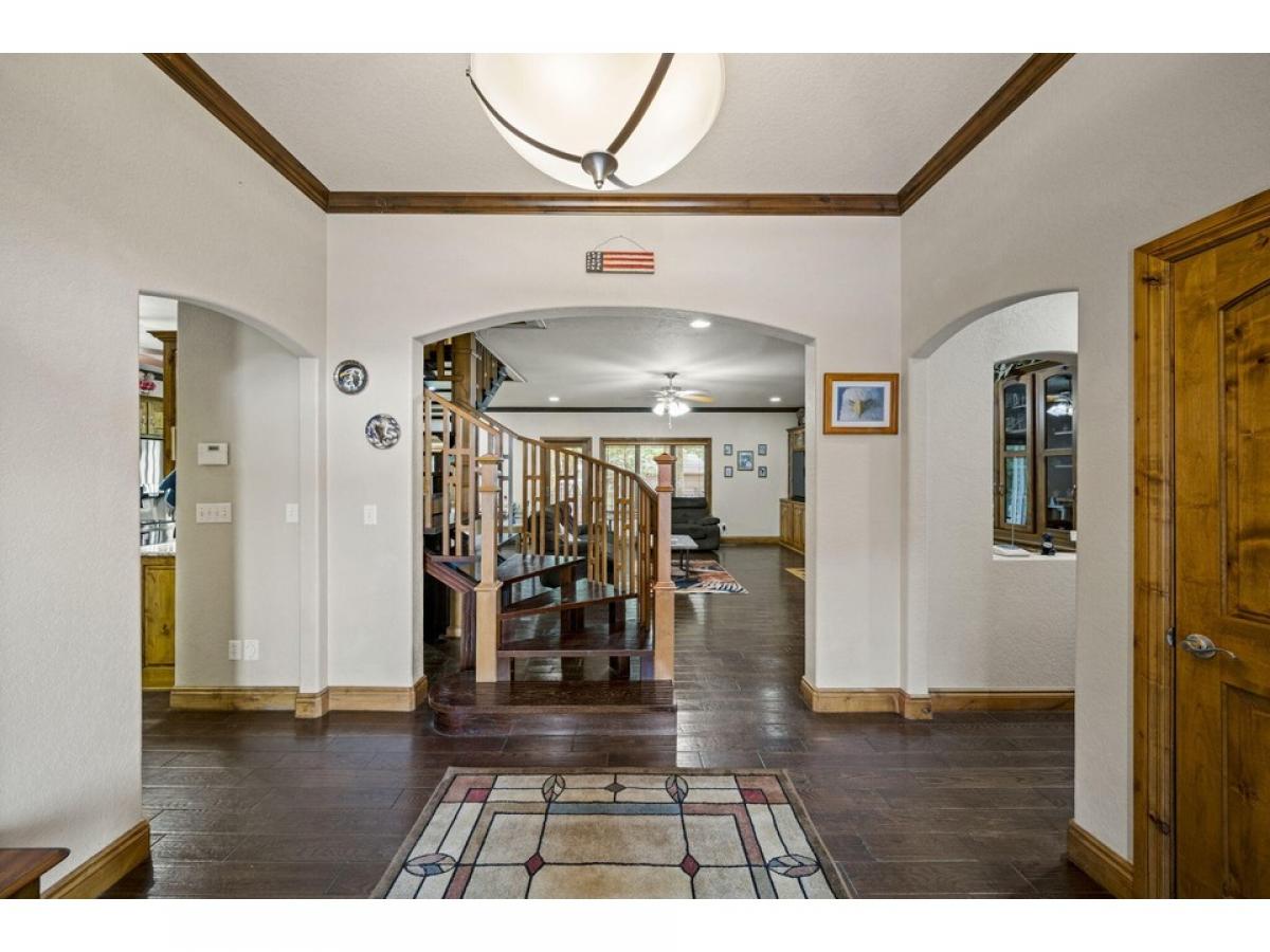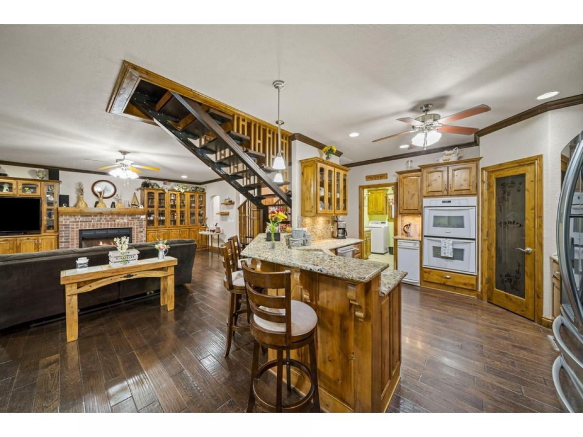 Situated on a large corner lot in Buffalo Shores South, this stunning home offers 3 bedrooms, 2.5 bathrooms, an office, & a spacious upstairs bonus room. The split floor plan features hardwood floors throughout, with carpet in one bedroom. The primary bedroom includes an ensuite bathroom with a custom tile shower, a jacuzzi, & a walk in closet. The kitchen features granite countertops, soft-close cabinets & drawers, double ovens, & bar seating, with a dining area nearby. Additional features include an instant hot water system, central vac, & an intercom system. The property also features a circle drive, a 3-car garage with a storm shelter, & RV hookups. The fenced backyard, covered deck, & climate controlled workshop in the basement add to its appeal. Optional HOA! Call today!