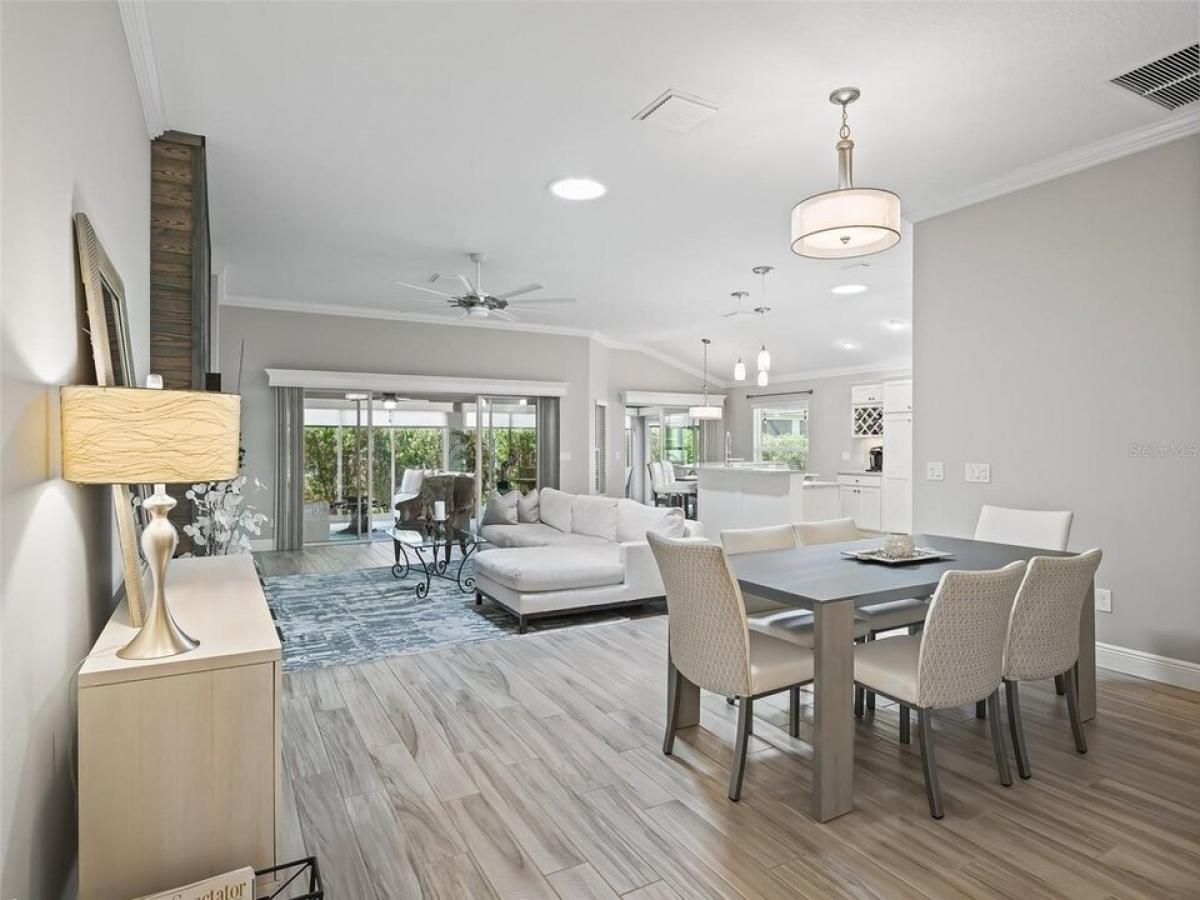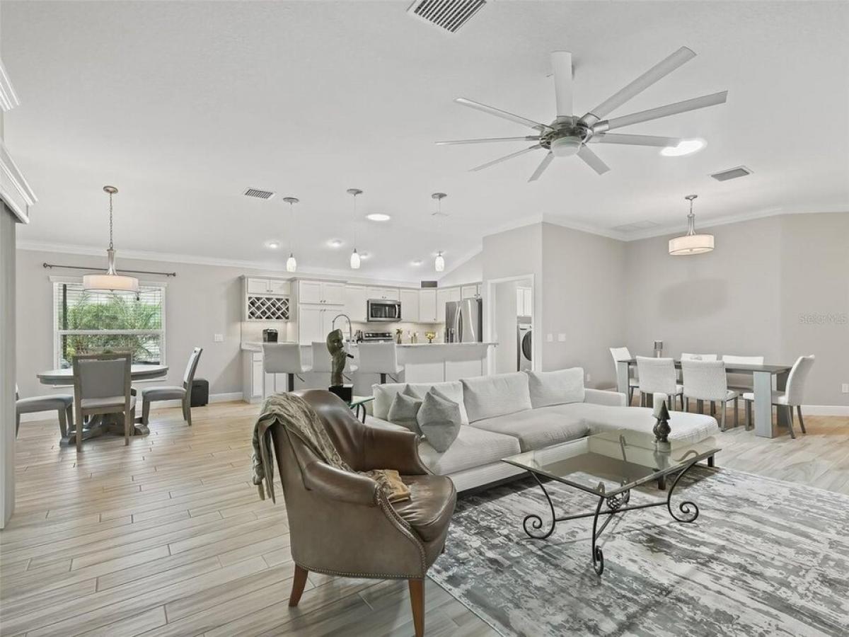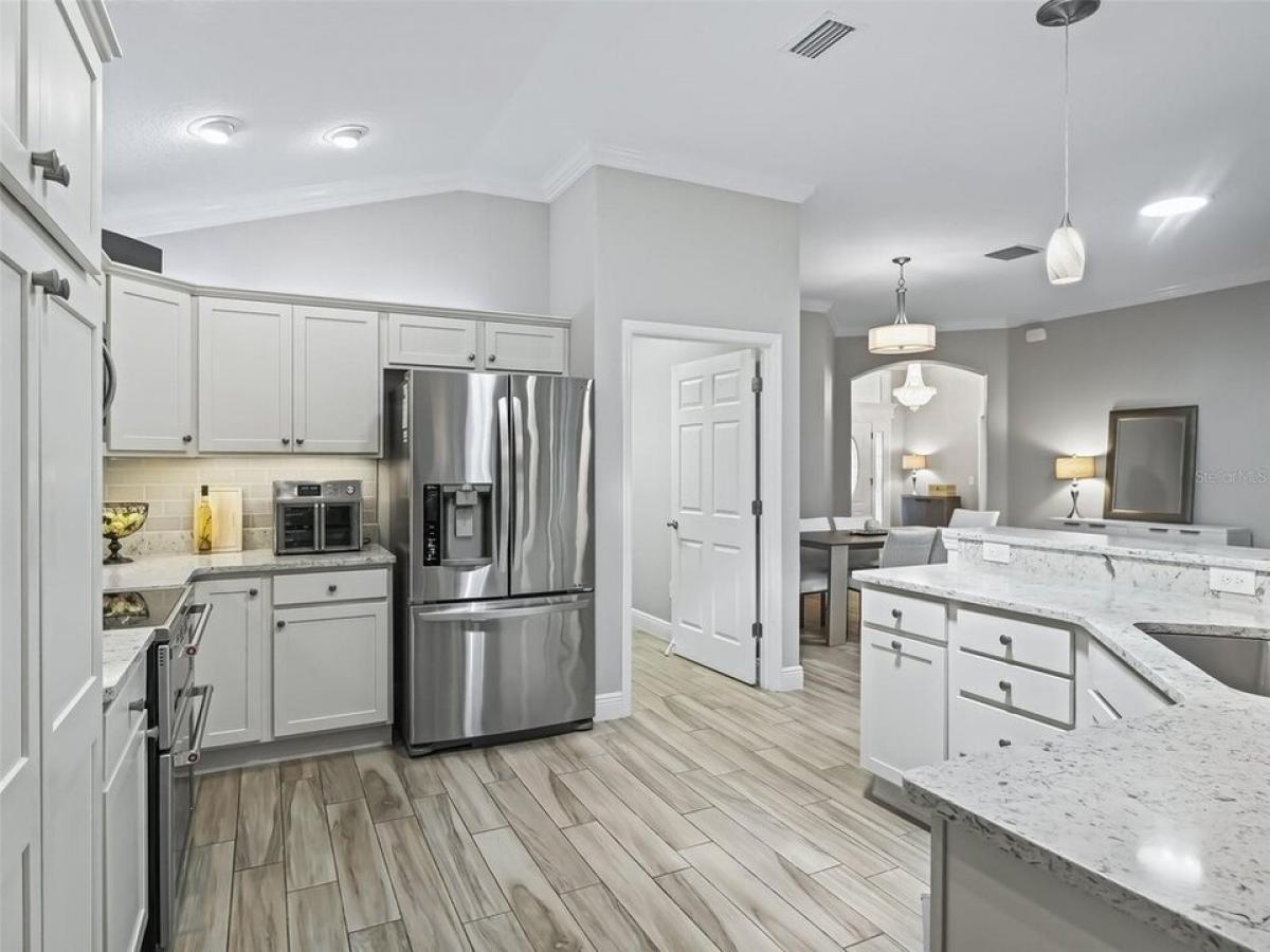 Seller, highly motivated! This beautifully appointed Iris-5 model offers many modernized upgrades. Freshly painted neutralized walls throughout, crown molding throughout the main living area, newer appliances, a subway-tiled kitchen backsplash, quartz counters in the kitchen and all three bathrooms, a spacious enclosed climate-controlled lanai with a hardwood ceiling, a beautiful outdoor sitting area that is under a UV barrier screened-in lanai, a spacious Roman shower in the primary ensuite with a California Closets detailed walk-in closet, epoxy finished garage floor, whole-house water softener and filtration system, woodgrain ceramic tile flooring in the living and wet areas of the home and upgraded thick plush carpet in all of the bedrooms. The house sits in a cul-de-sac with mature landscaping. HVAC System (2024). Hot Water Tank (2022). This is most definitely a move-in-ready home. Make your appointment today! Let#039;s get you Living the dream in The Villages!