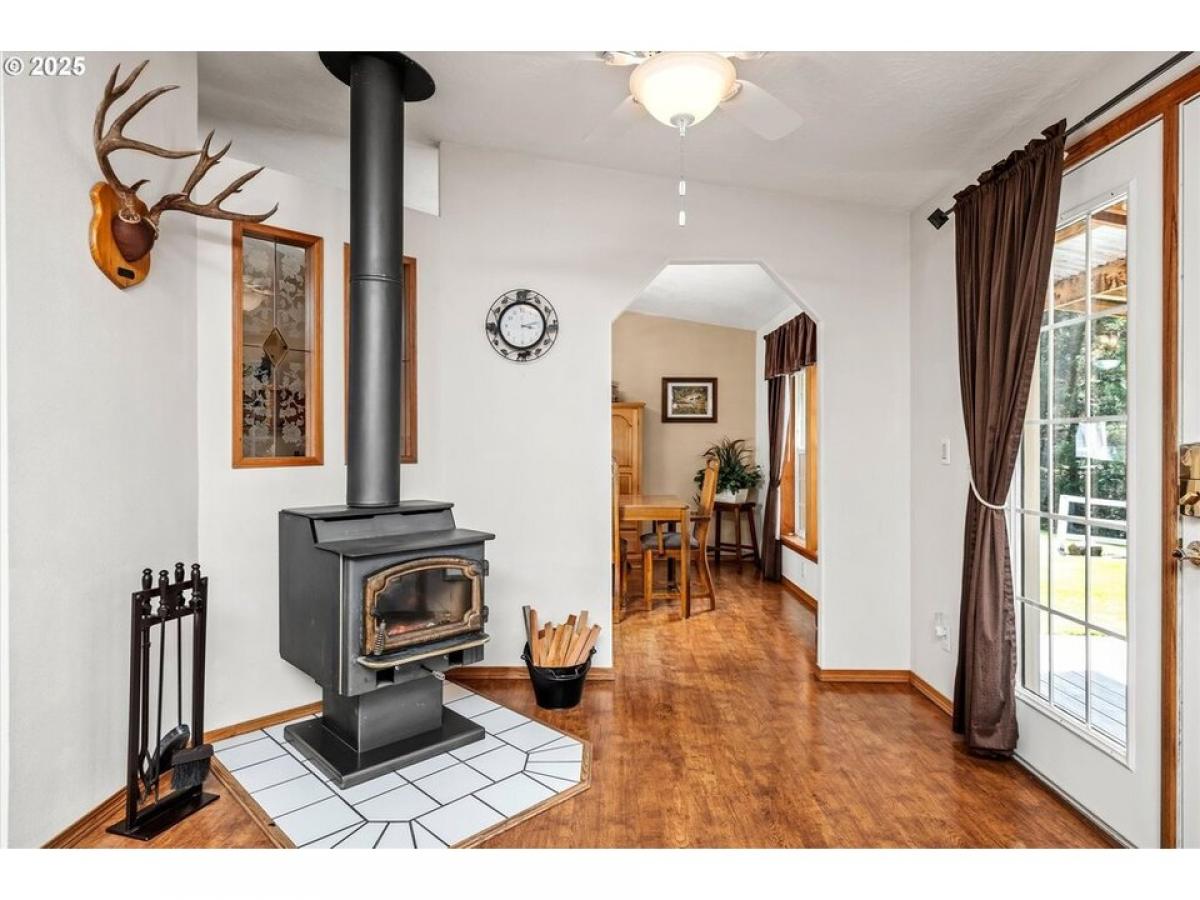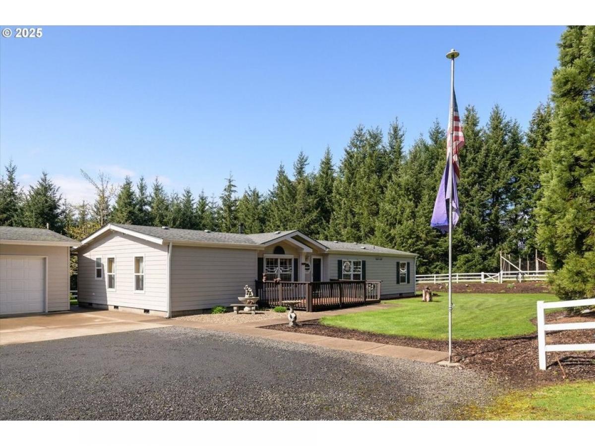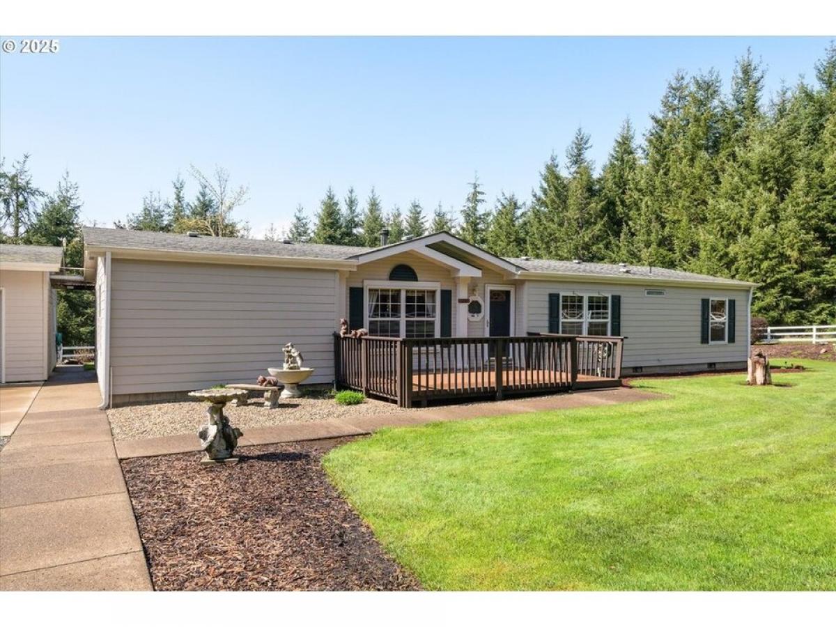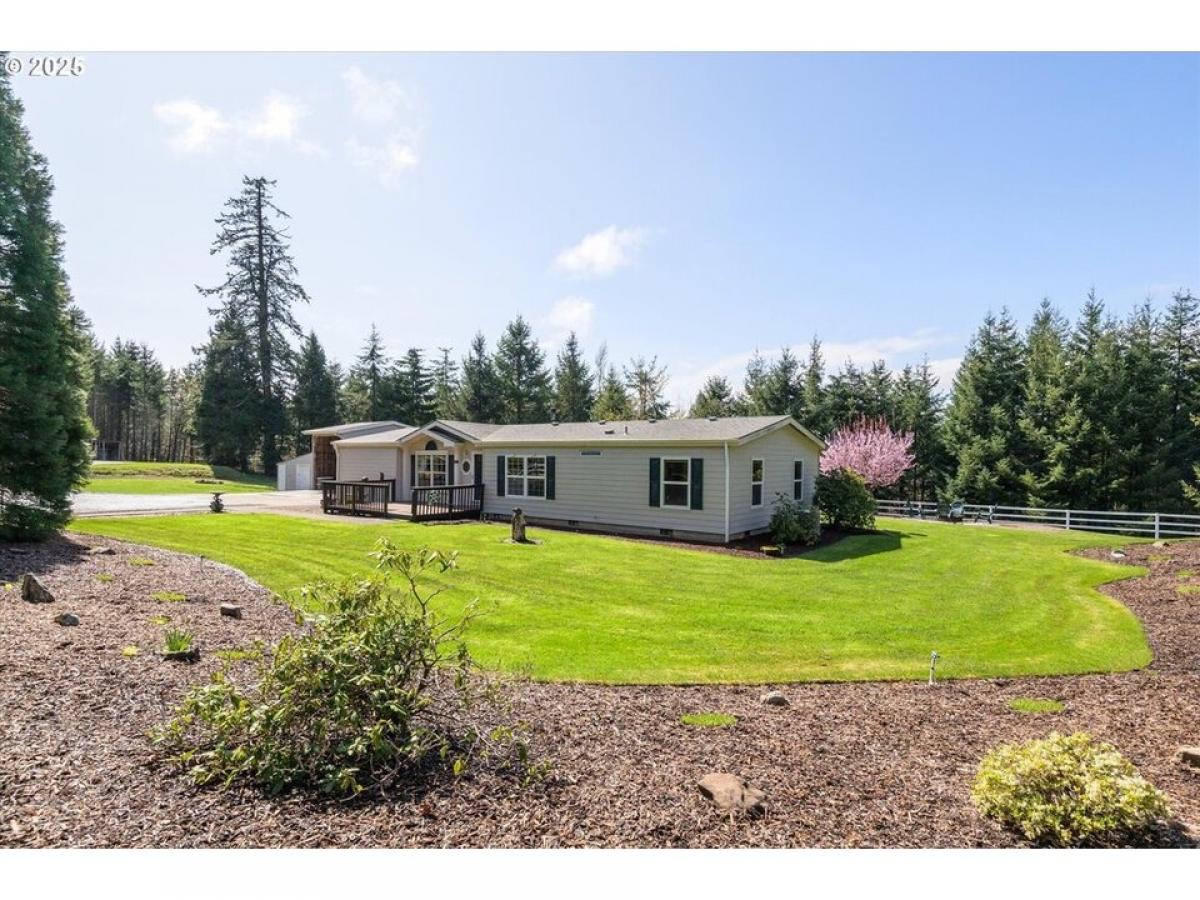 40 acres ( 2 tax lots ) of secluded paradise at your doorstep. The private drive leads to a meticulously maintained manufactured home that sits on 5 acres. This home has 3 bedrooms, 2 full bathrooms and many amenities throughout including a beautiful primary suite with a large updated bathroom, double sinks, vaulted ceilings, skylights, walk in closets and custom kitchen cabinetry. Outside there is plenty of storage in the numerous outbuildings and RV parking. Oversized 30X24 2 car detached garage with RV storage cover. There is also a separate shop with a roll down door 24X11. Two fire pits and a covered Trex deck with fans facing the 35 acre second tax lot of beautiful timber land that was cut and replanted 30 years ago. Large fenced garden area with access to irrigation well water. Enjoy exploring the pond and wooded trails on your quad.
