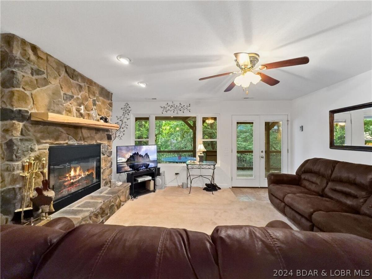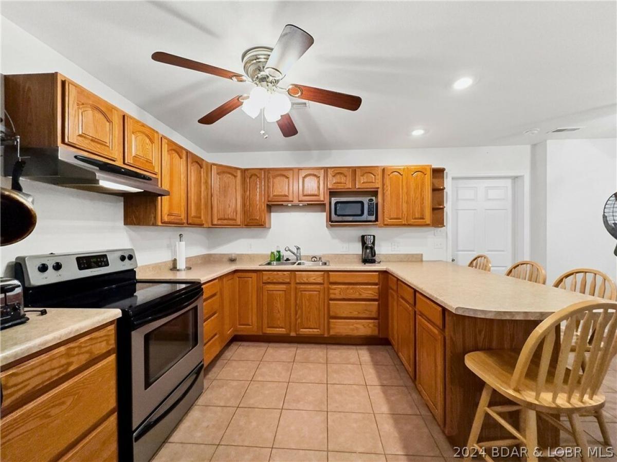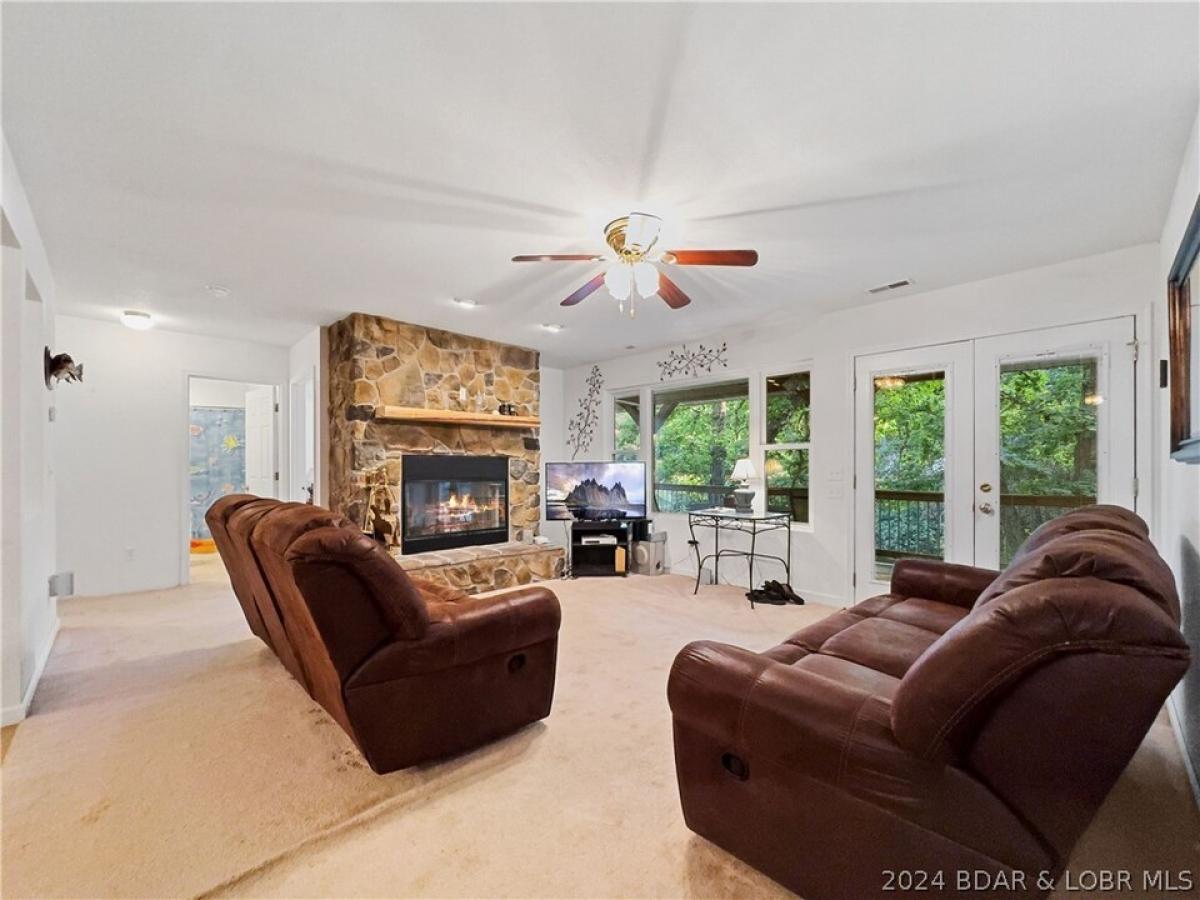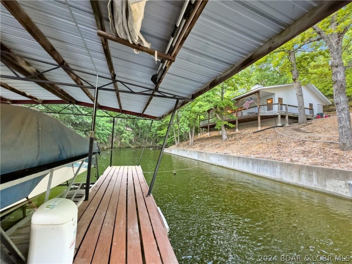 Ranch Lake Front Home at the Osage 3 mile mark and Cove protected. Open Living/Kitchen/Dining and Wood Fireplace in the Living Room. Tiled Kitchen has lots of Cabinets, Breakfast Bar, Stainless Steel Appliances and Pantry. There is a hookup for a Dishwasher. The Storage/Laundry area is just off the Kitchen. The Master Bedroom/Bath has double Sinks and nice Linen Closet. The 2nd Bedroom doesn’t have a closet. There is access to the attic and more rooms could be added. The roof is such to allow and the closet in the dining area would be for access stairs. Large open Deck on the Lake side and a 2-Well Dock with 130 Ft of Lake Front. Great location for Family to Boat, Kayak and Swim in Birdsong Hollow Cove and close to Aqua Moon Marina.