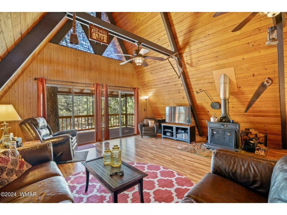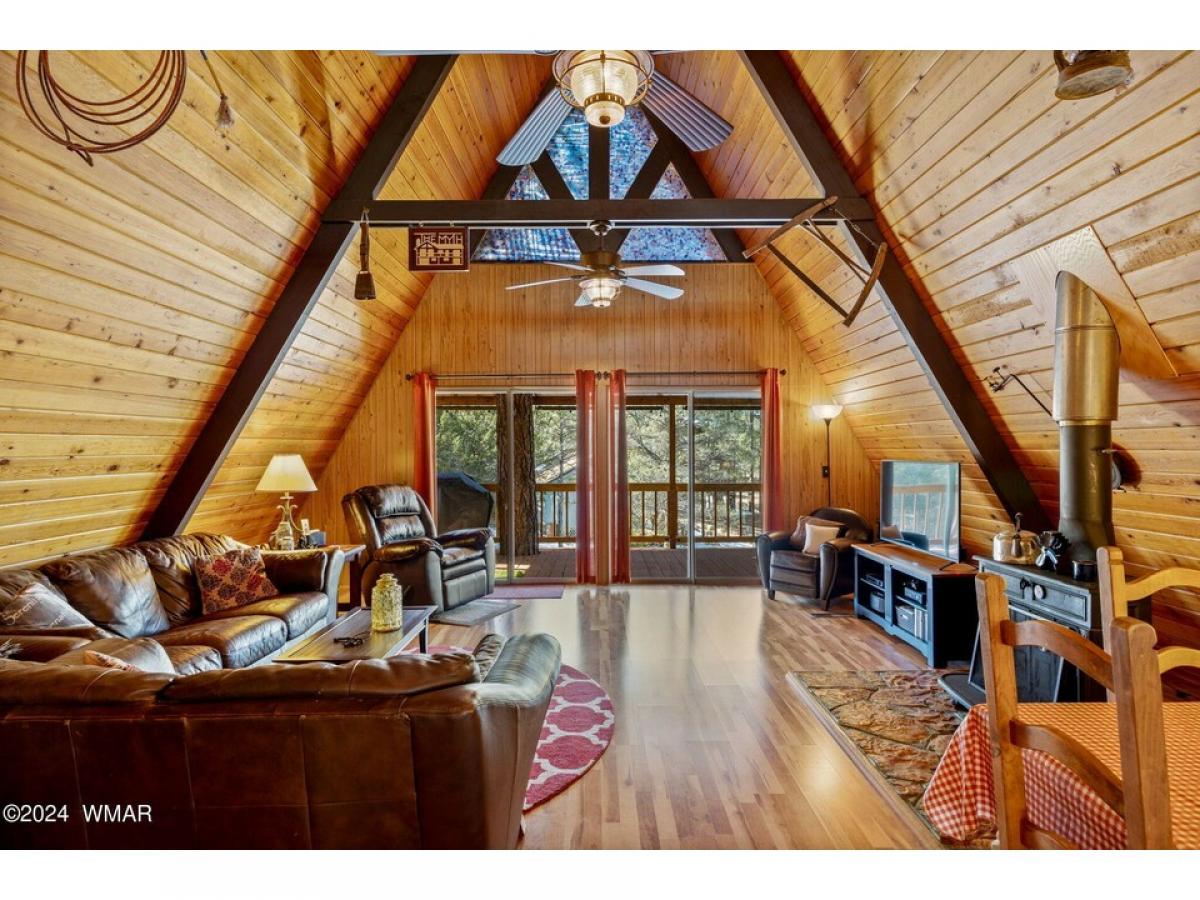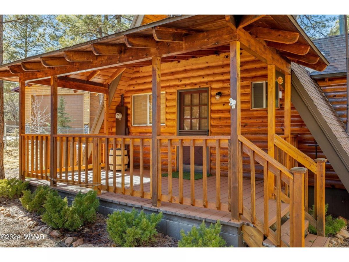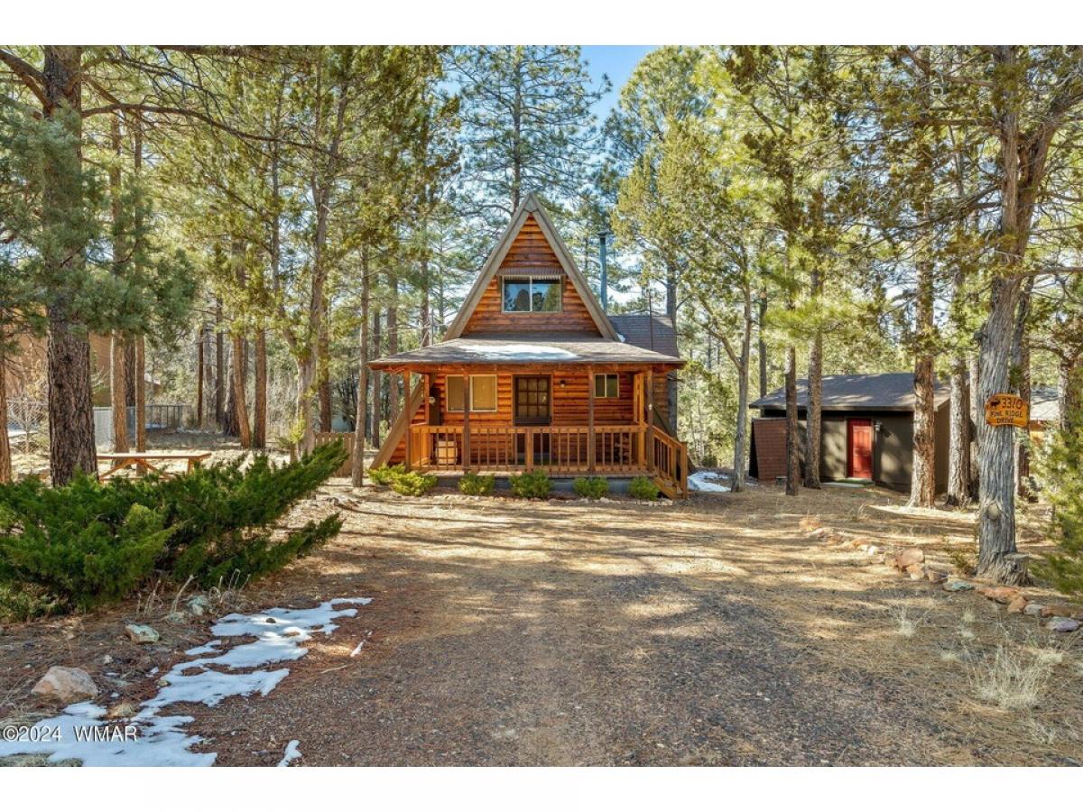 MOTIVATED SELLER - MAKE AN OFFER. Welcome to your one of a kind mountain retreat nestled in the pines. This fully Air Conditioned 2BR/1BA log sided A-Frame boasts a stunning interior. Kitchen with stainless steel appliances. Gas stove in kitchen. Wood burning stove in great room. Spacious loft/bedroom with 2 queen size beds. Home was repainted in 2023. Detached garage with gas & water. Forced air heat.. Heavily treed lot with large Ponderosa Pines. Mild HOA and located in a homes only subdivision with paved streets. Great Secondary home or vacation rental. Fully furnished except for personal items. SOLD AS IS. List of features available in Documents.