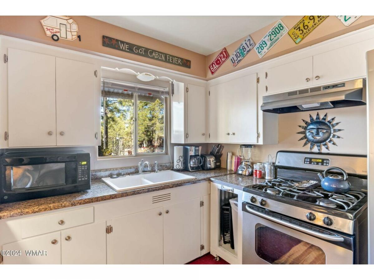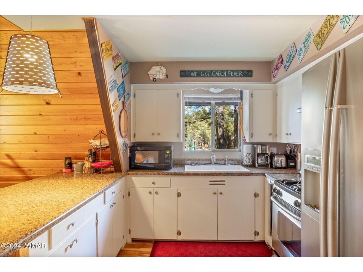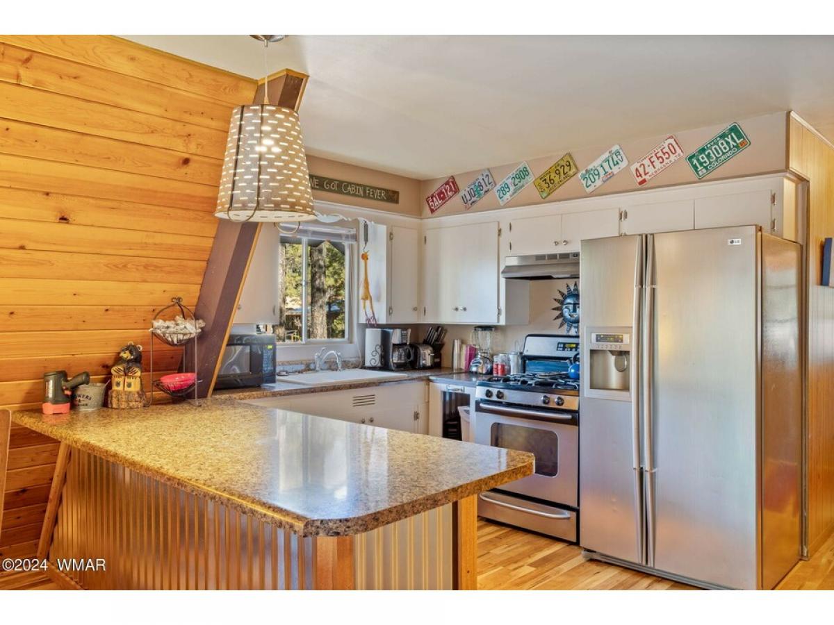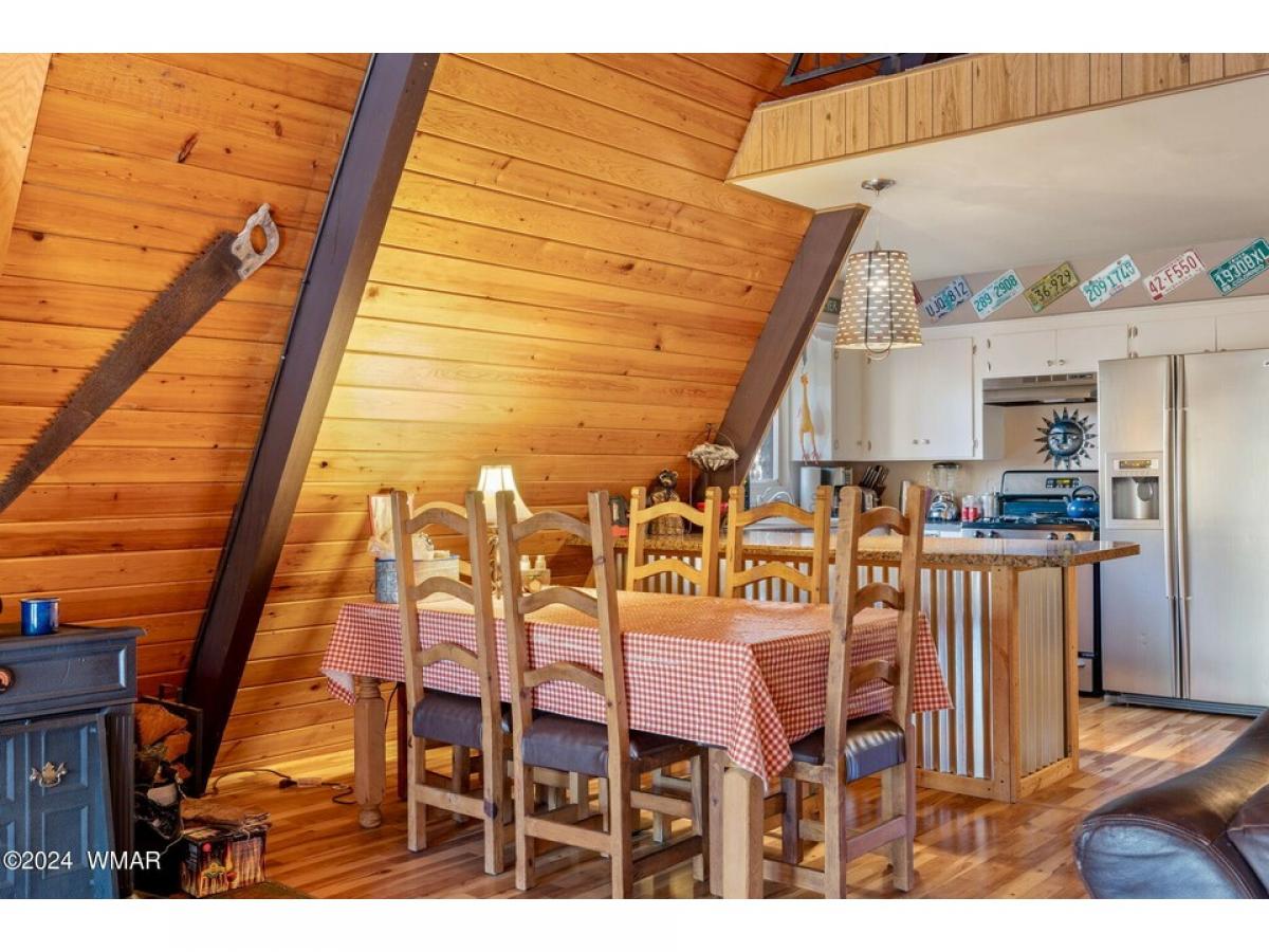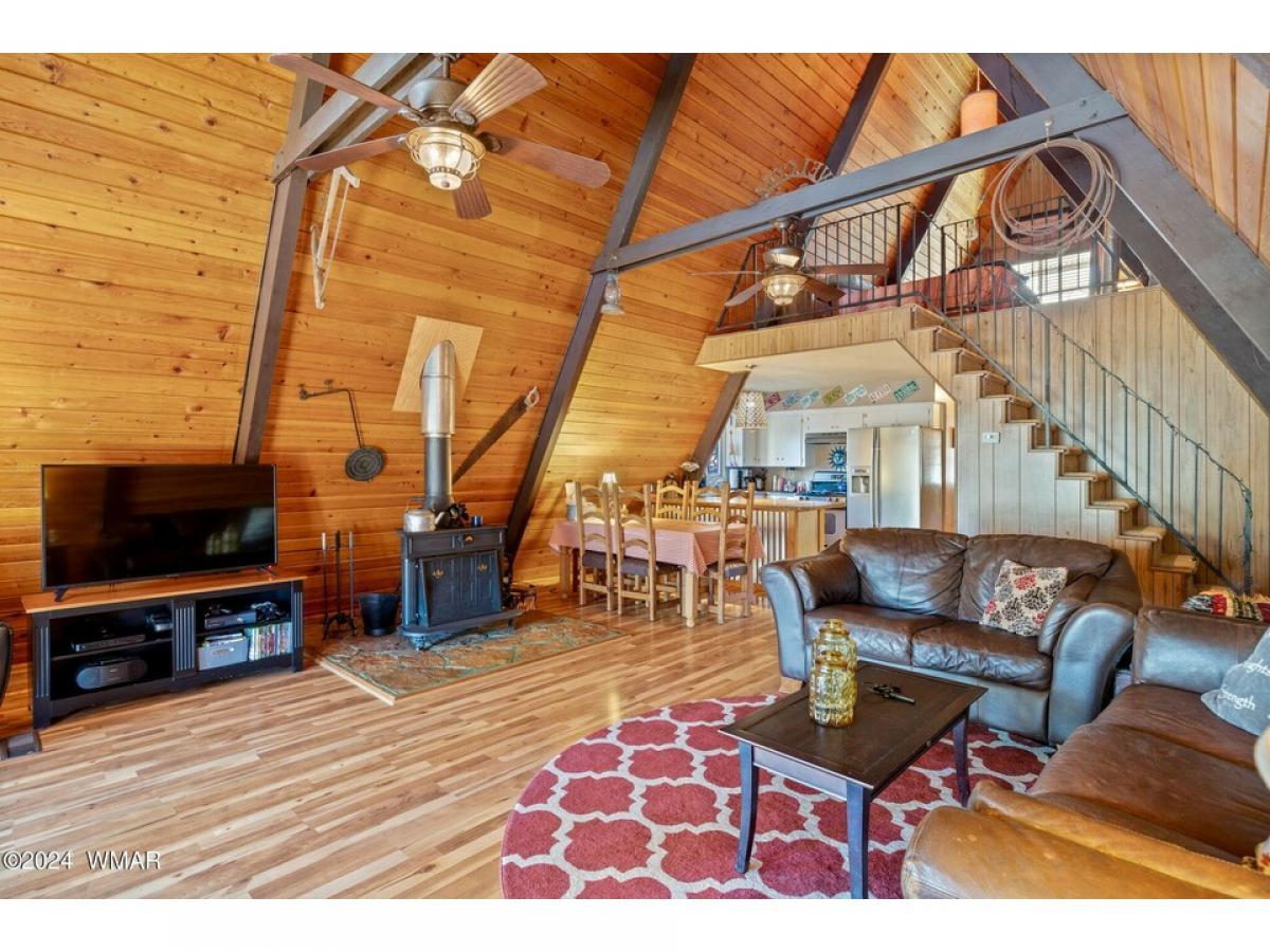 MOTIVATED SELLER - MAKE AN OFFER. Welcome to your one of a kind mountain retreat nestled in the pines. This fully Air Conditioned 2BR/1BA log sided A-Frame boasts a stunning interior. Kitchen with stainless steel appliances. Gas stove in kitchen. Wood burning stove in great room. Spacious loft/bedroom with 2 queen size beds. Home was repainted in 2023. Detached garage with gas & water. Forced air heat.. Heavily treed lot with large Ponderosa Pines. Mild HOA and located in a homes only subdivision with paved streets. Great Secondary home or vacation rental. Fully furnished except for personal items. SOLD AS IS. List of features available in Documents.