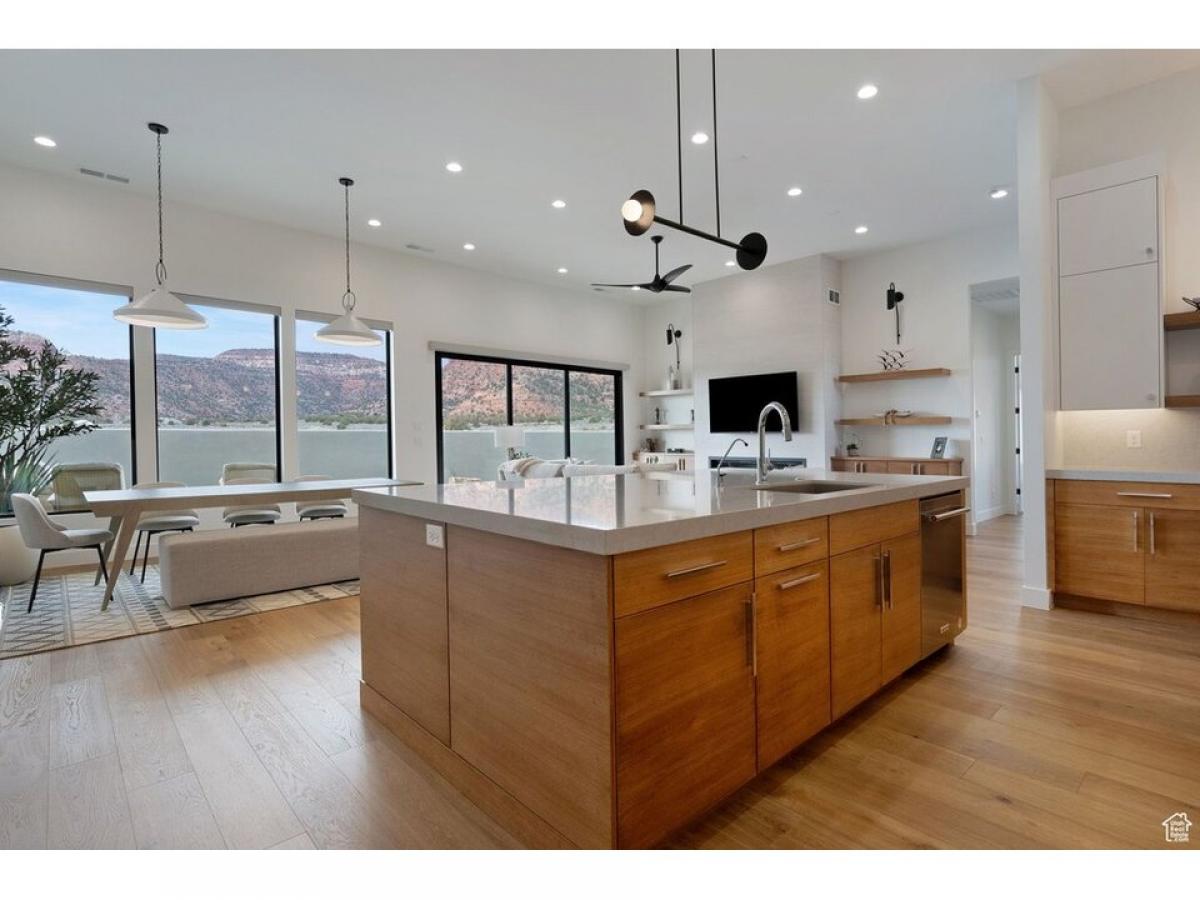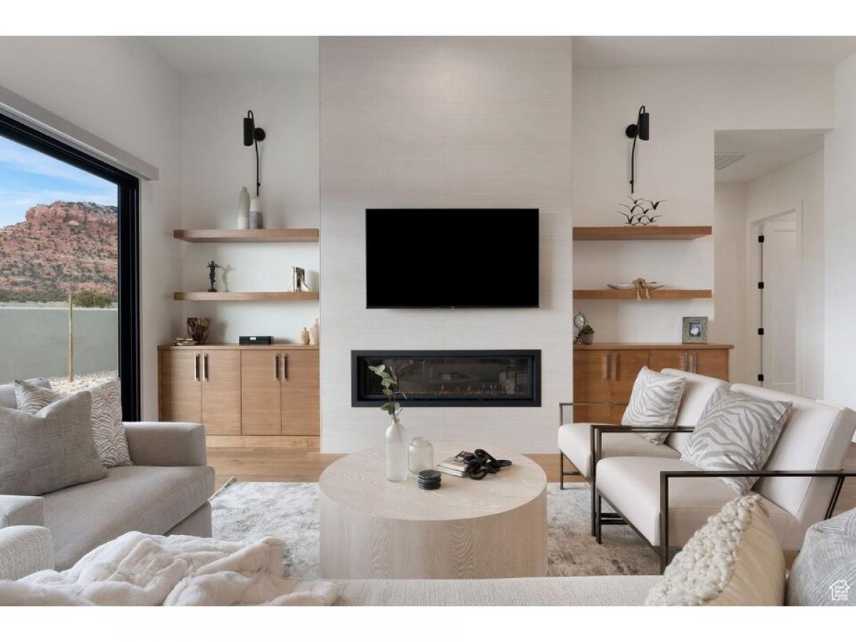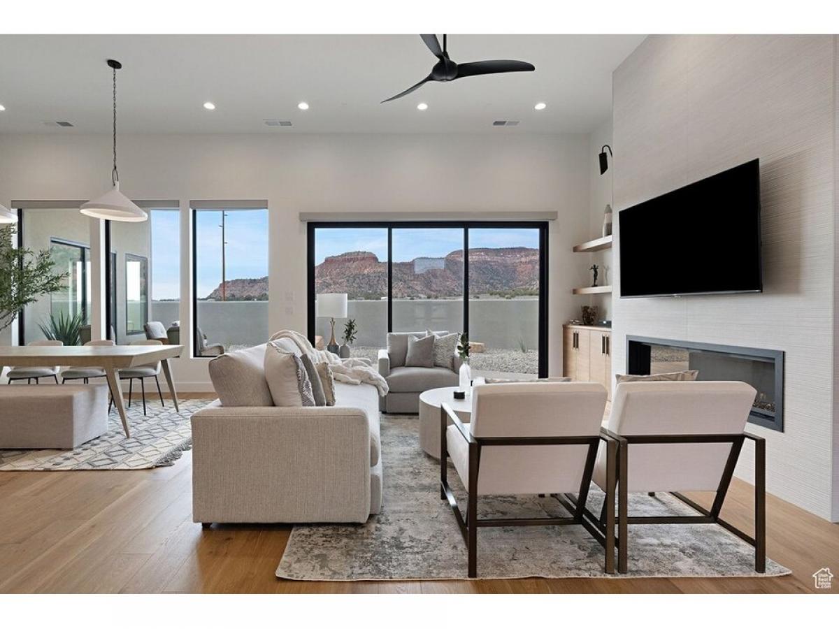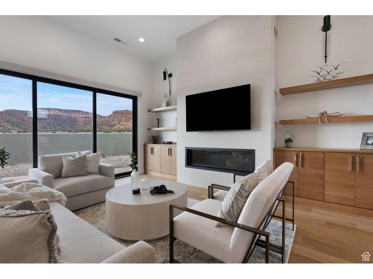 Nestled in the breathtaking landscape of Kanab, Utah... just below the majestic red mountains, lies a luxury desert oasis that redefines the essence of high-end living. This stunning property is a masterpiece of modern design, seamlessly blending into the surrounding natural beauty. As you approach the property, you are greeted by the serene ambiance of the desert landscape. Minimal landscaping and Xeriscape is used to retain the natural beauty of the native plants and history. The exterior design features clean lines, minimalist aesthetics, and an abundance of glass, allowing the stunning red rock formations to take center stage. Upon entering the property, you will be struck by the elegance of the open concept living area features such as soaring ceilings, walls of glass, and seamless transition between indoors and outdoors. Beautiful wide plank hardwood floors and porcelain tile throughout the home. The gourmet kitchen is a culinary dream, equipped with high- end appliances, sleek cabinetry, and expansive quartz countertops. just behind the main kitchen is a serving kitchen with sink where you have more room for food preparation. This serving kitchen leads to a large pantry ... with views from the pantry as well. Imagine waking up in the spacious primary suite with these exceptional red mountain views. Large glass sliding doors lead from the primary suite to the private back patio where you can enjoy your morning coffee or walk right out to one of many walking paths or the BLM hiking trail behind the community. Tucked away from the main living area, the private casita offers a serene retreat for guests with a separate entrance and kitchenette. Enjoy breathtaking views of the surrounding red rock formations, creating a sense of connection to the natural beauty Kanab is famous for. As the sun sets, the sky is painted with hues of pink, orange, and purple... making this a truly unforgettable destination. This home offers 2 temperature-controlled zones as well as a 44ft RV garage. RV side of garage also has a trailer clean out. No expense was spared in the garage with epoxy coating on the floors as well. This particular home offers a unique investment opportunity, as it is one of the few lots in the community zoned for Short Term Rental use. With access to amenities like pools, pickleball courts, hot tub, and playground... this property is poised to generate significant rental income. Out of 147 lots, only 7 will be allowed to be zoned as short term rentals and have access to the amenities in the gated community next door. This is one of those lots. It is not required... but is an option should the owner choose to use it as such. This luxury desert oasis is a rare find, offering the perfect blend of natural beauty, modern sophistication, and outdoor recreation. Whether you are seeking a private retreat, an adventure-filled getaway, or a lucrative investment opportunity, this is property is sure to exceed your expectations. Furniture package is available.