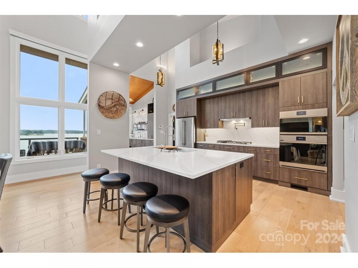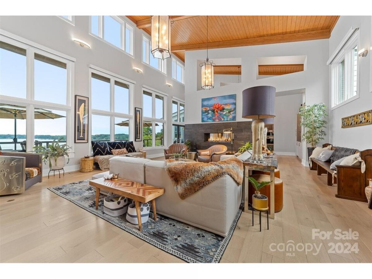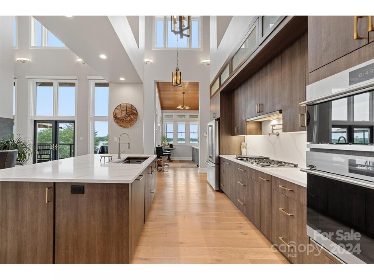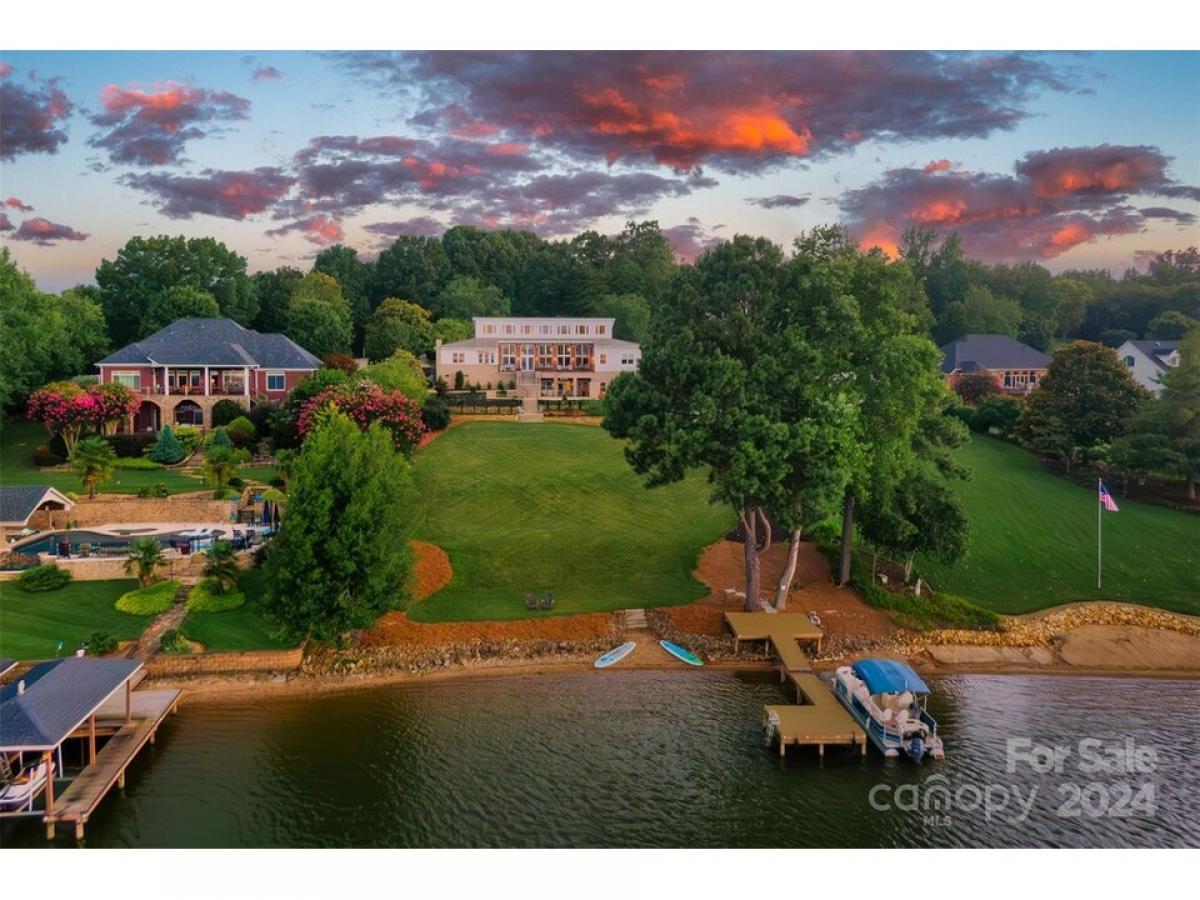 Step into the epitome of contemporary luxury with this stunning masterpiece. Discover a harmonious fusion of modern living and natural serenity in this home with breathtaking views of Moss Lake. Once inside, feel immediately enveloped by the warmth of the interior spaces. Expansive windows bathe the home in natural light while framing panoramic views of the lake and Crowders Mountain. Fully remodeled main level offers an open floor plan, primary ensuite wing with spa bath, new kitchen cabinets, quartz islands and appliances, wet bar with ice maker and 4 drawer coolers, custom Isokern fireplace, new lighting fixtures and motorized window shades. 2 more suites and full bath are also offered on the main level. The lower level has another large bedroom, full bath, second laundry area and a 26'X23' flex space that is used as a wellness gym presently. The porches and patio are spectacular with new cable railings overlooking the stone walls, illuminated hardscapes and boat dock. True Oasis.