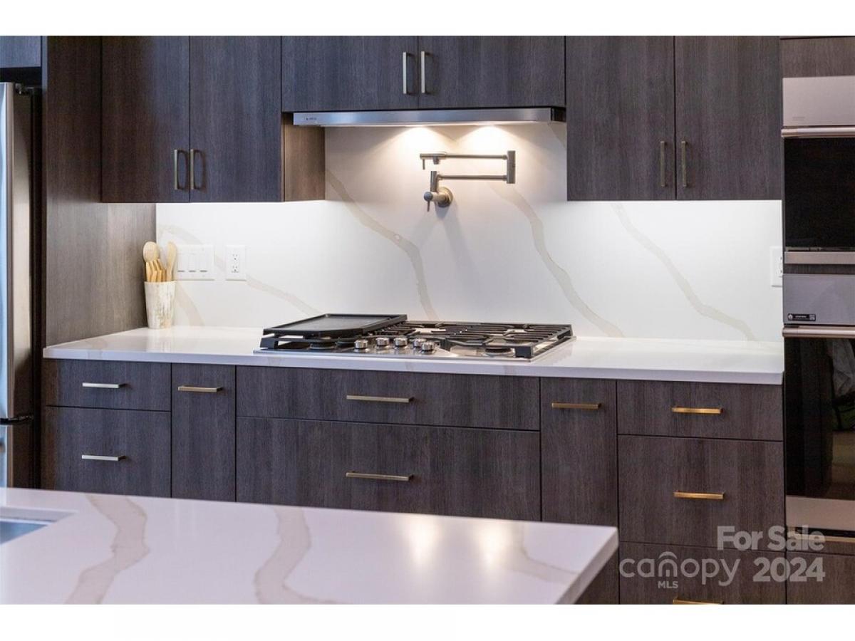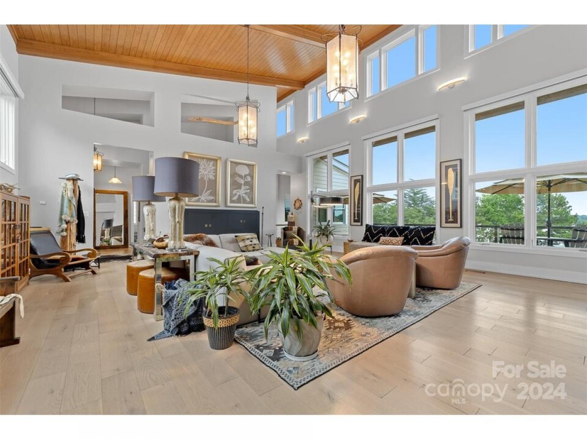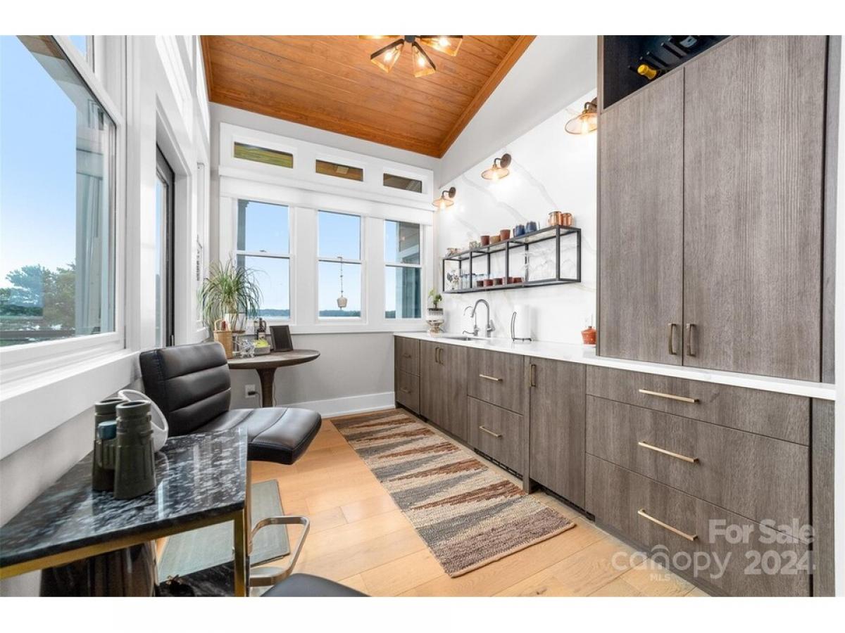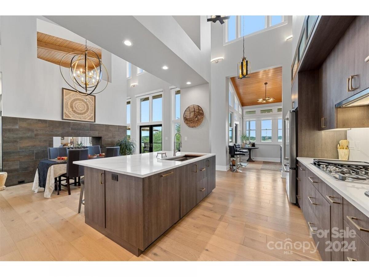 Step into the epitome of contemporary luxury with this stunning masterpiece. Discover a harmonious fusion of modern living and natural serenity in this home with breathtaking views of Moss Lake. Once inside, feel immediately enveloped by the warmth of the interior spaces. Expansive windows bathe the home in natural light while framing panoramic views of the lake and Crowders Mountain. Fully remodeled main level offers an open floor plan, primary ensuite wing with spa bath, new kitchen cabinets, quartz islands and appliances, wet bar with ice maker and 4 drawer coolers, custom Isokern fireplace, new lighting fixtures and motorized window shades. 2 more suites and full bath are also offered on the main level. The lower level has another large bedroom, full bath, second laundry area and a 26'X23' flex space that is used as a wellness gym presently. The porches and patio are spectacular with new cable railings overlooking the stone walls, illuminated hardscapes and boat dock. True Oasis.