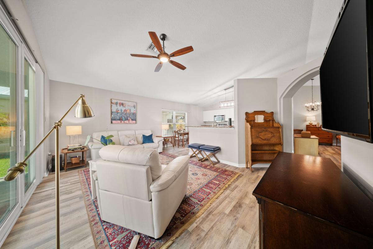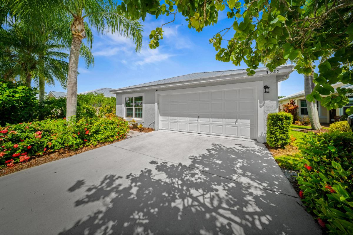 This CBS, move-in ready and exceptionally maintained 3/2/2 home is in a very sought after and popular community in Palm City. A-rated schools (middle school within walking distance), grocery stores, excellent restaurants and the beautiful beaches of Martin County. This home boasts a new standing seam metal roof installed May 2024, 2023 PGT vinyl impact glass windows throughout, 2019 Trane AC, 2023 complete exterior professionally painted, 2025 hot water heater, 2025 high end GE Profile dishwasher and refrigerator, 2024 LG washing machine, 2024 tiled front porch. Home also boasts luxury vinyl plank flooring in all living areas and master bedroom. Lowest HOA fee in Palm City at $325/month. Includes: full service property manager, accountant fees, front/side yard lawn maintenance, cable TV,yard irrigation from community lakes, community pool, basketball, tennis and pickle ball courts, gated security, common area maintenance and upkeep. Don't miss this gem of a home. It won't last long. NO RENTALS FOR FIRST 2 YEARS OF OWNERSHIP.