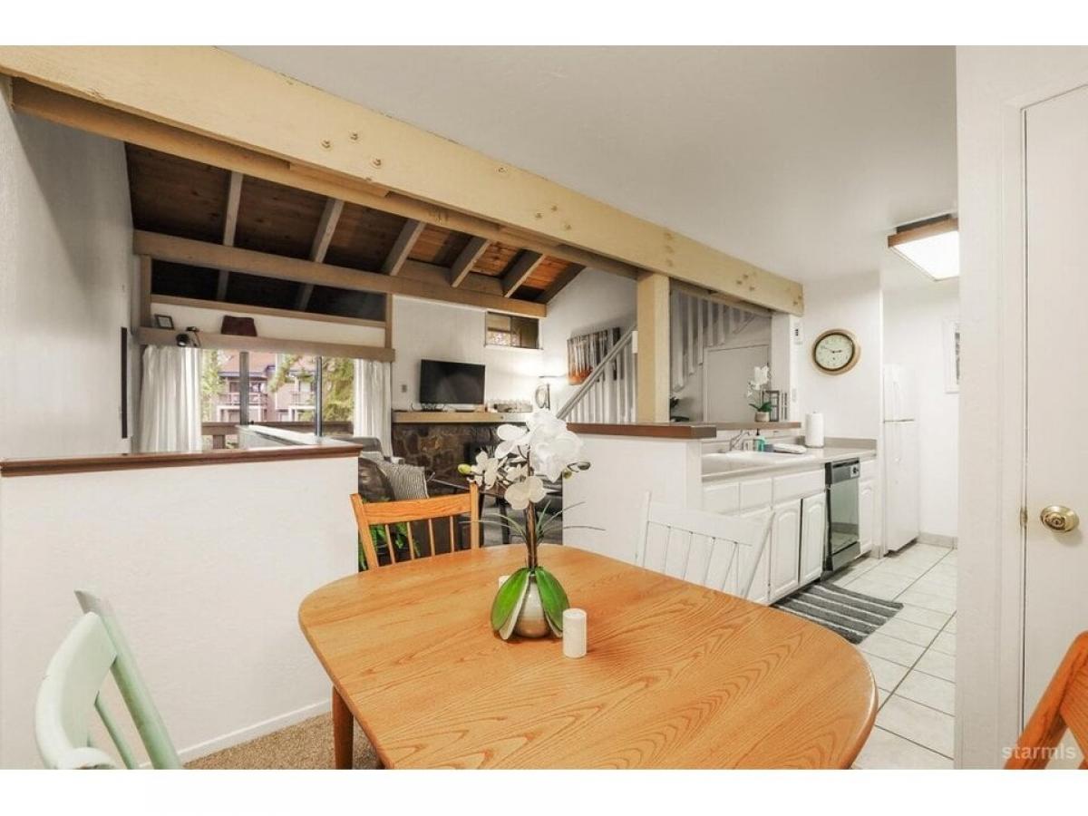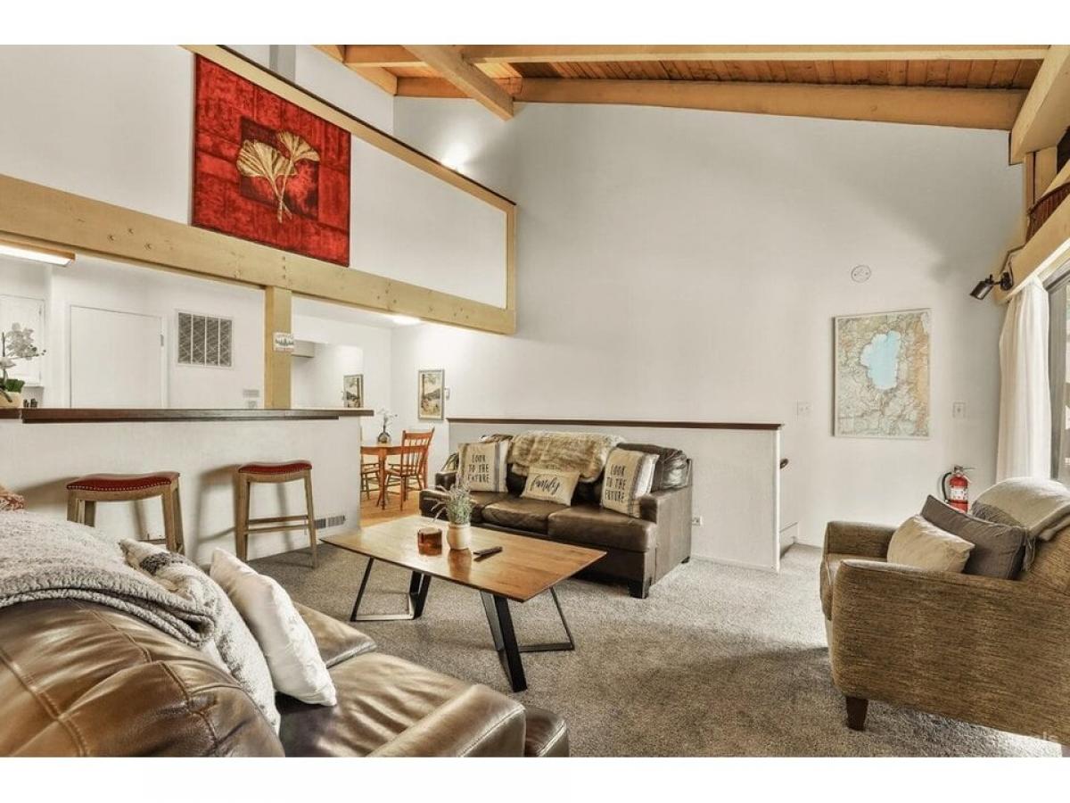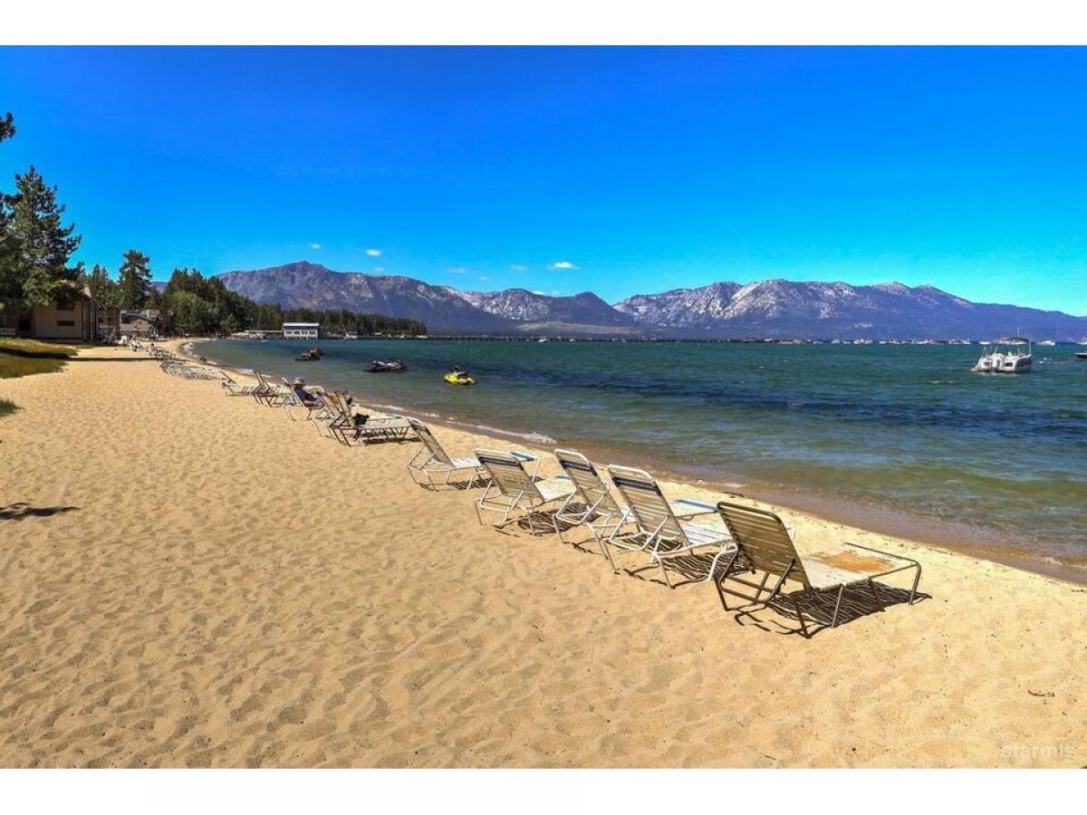Enjoy lake front living with private beach, 3 pools, 2 hot tubs, saunas, clubhouse, gym, all while earning vacation rental income! Lakeland Village is a 19 acre property located right in the heart of South Lake Tahoe.With 1,000 feet of beach frontage and private pier, only minutes to Heavenly Ski Resort, restaurants, shopping, casinos, and golf, you will enjoy your condo year-round. Tall pines surround this well maintained unit adding to the mountain feel of the home. As you enter there is one spacious bedroom and full bath with tub/shower combo on this ground level as well as the washer amp; dryer located in the hall closet. Upstairs is the living room with gorgeous open beam pine ceilings and large gas fireplace, tastefully decorated for a mountain feel. A sliding glass door opens to your own covered deck perfect to sit and enjoy the Tahoe scenery. The kitchen has lots of cabinet space and is open to the dining area and living room and has access to the 1/2 bath. Upstairs on the third level is an open loft that makes for the second bedroom. Sold with all furnishings included, this condo is move-in ready to continue on as a successful vacation rental.