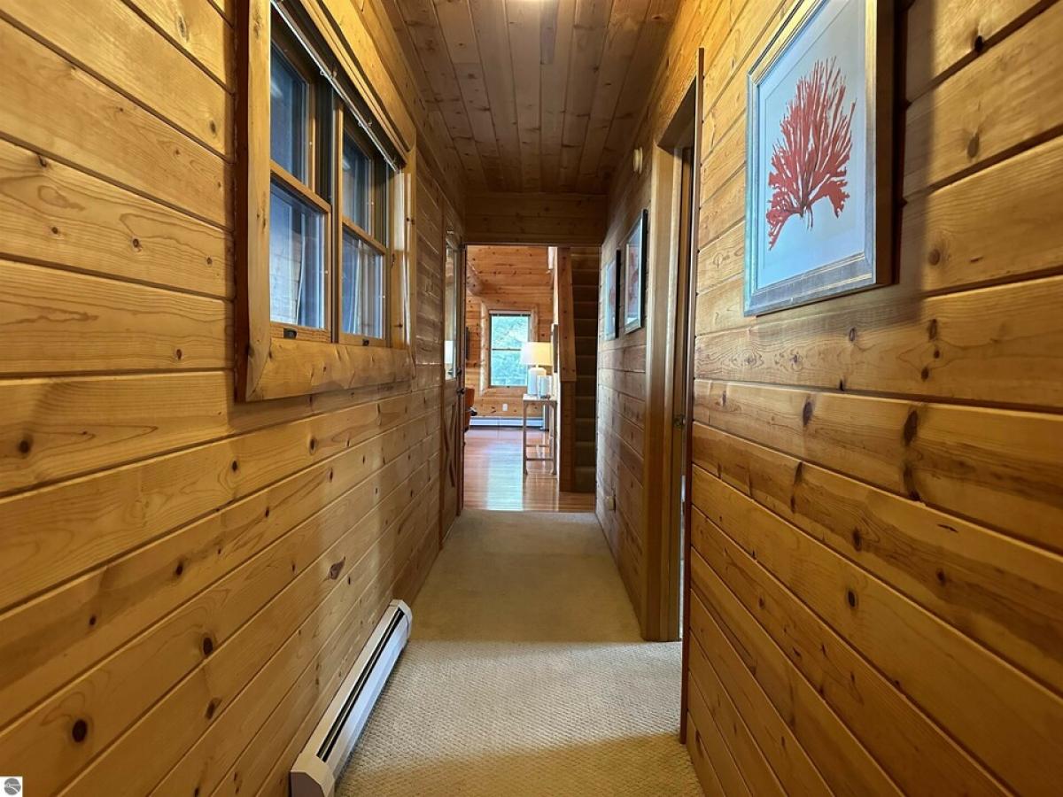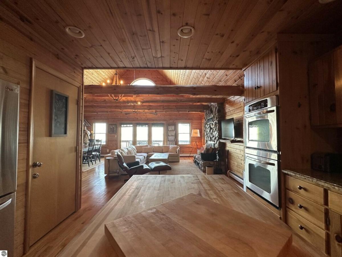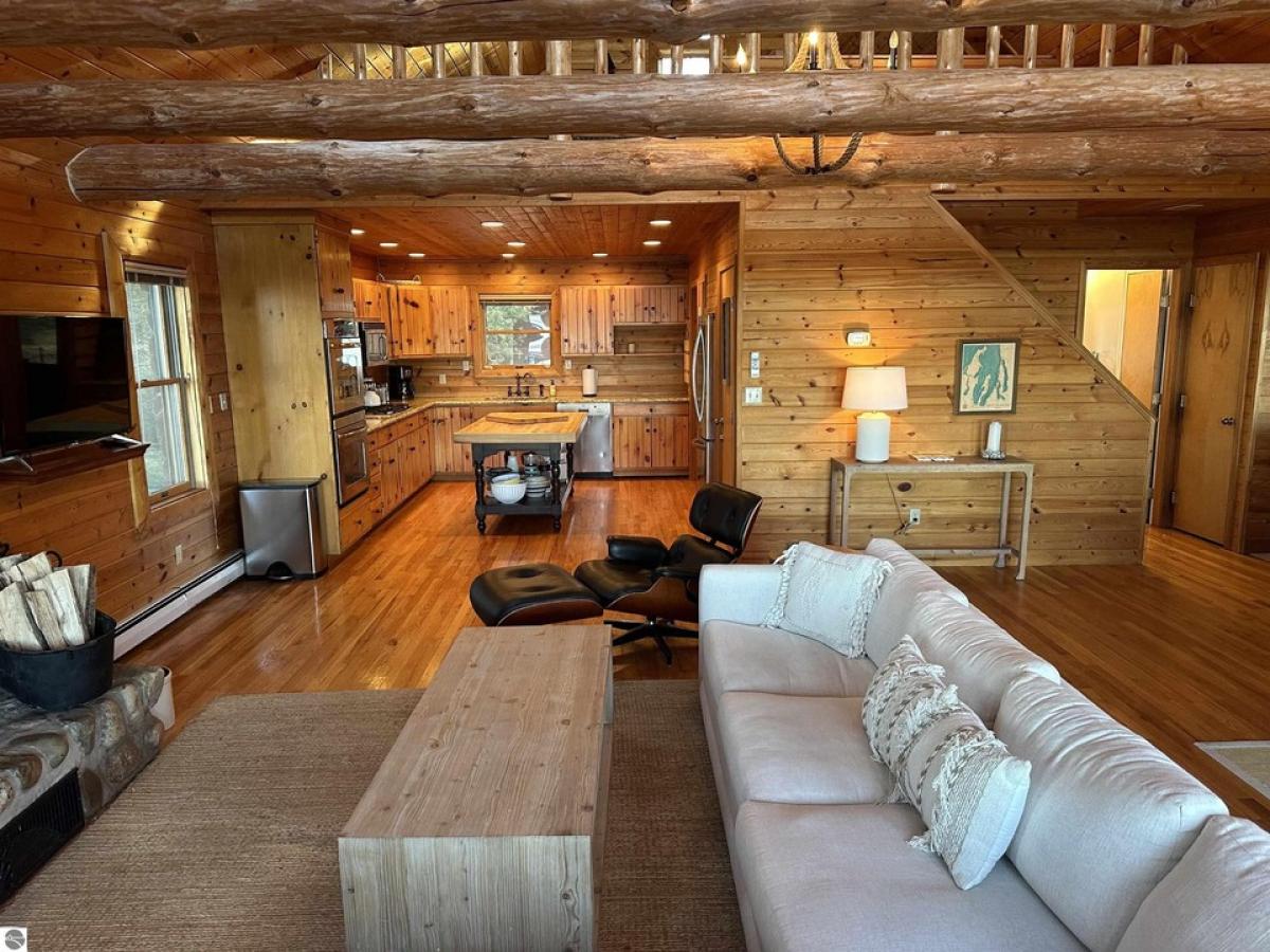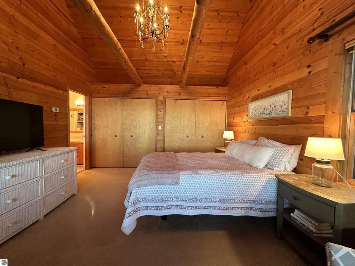 100’ Gorgeous Sandy GT Bay Frontage is the idyllic setting for this charming log home w/NEW ROOF natural stone fireplace, waterside screened porch, island kitchen w/granite and stainless appliances, hardwood floors, loft plus 4BR, 3BA, completely finished lower level walkout w/kitchenette! Large detached heated garage w/ bonus room above offers many possibilities!