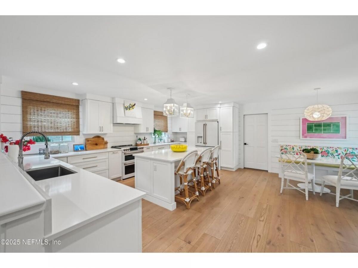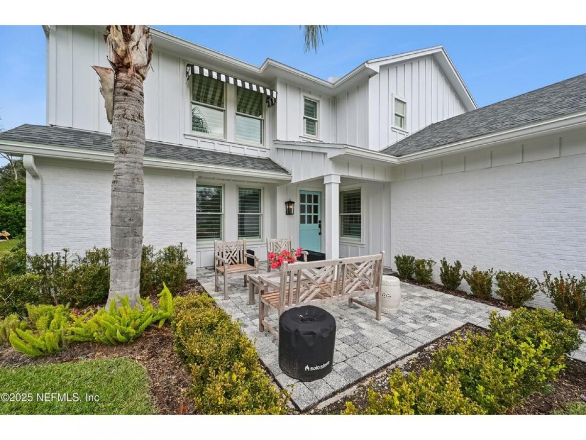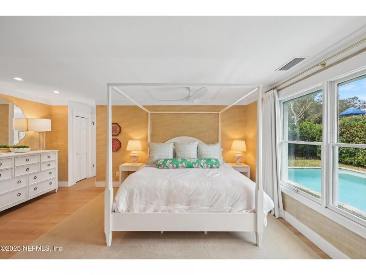 Located east of A1A. Stunning Palm Beach Regency-style bungalow pool home located in a quiet neighborhood in the heart of Ponte Vedra Beach fully remodeled. Originally built in 1984, extensive remodel completed in November 2022. Second story was added, high-functioning living space designed and a state-of-the-art kitchen positioned. Professionally designed and decorated. Bold black-and-white striped awning in front, a Chippendale stair rail inside and a light but vibrant blue front door. Use of bold designer elements through out. House features French Oak Engineer flooring, shiplap, designer wall paper and custom built ins. Home is centrally located and close to the beach.