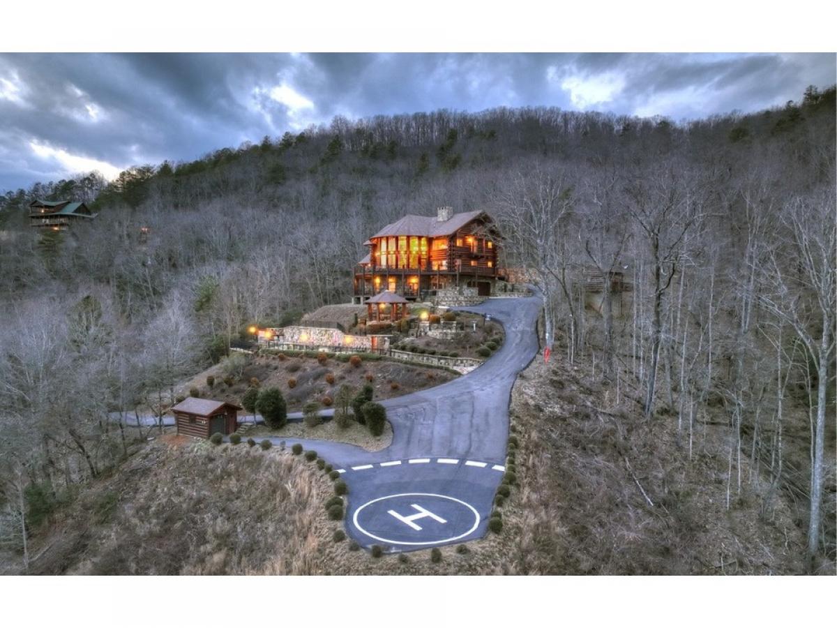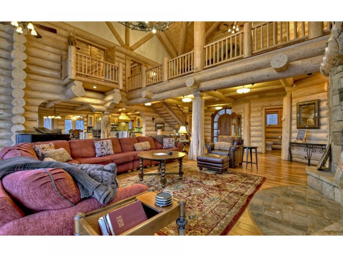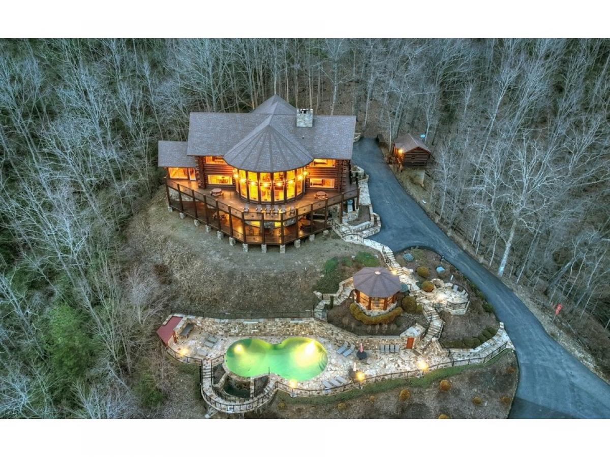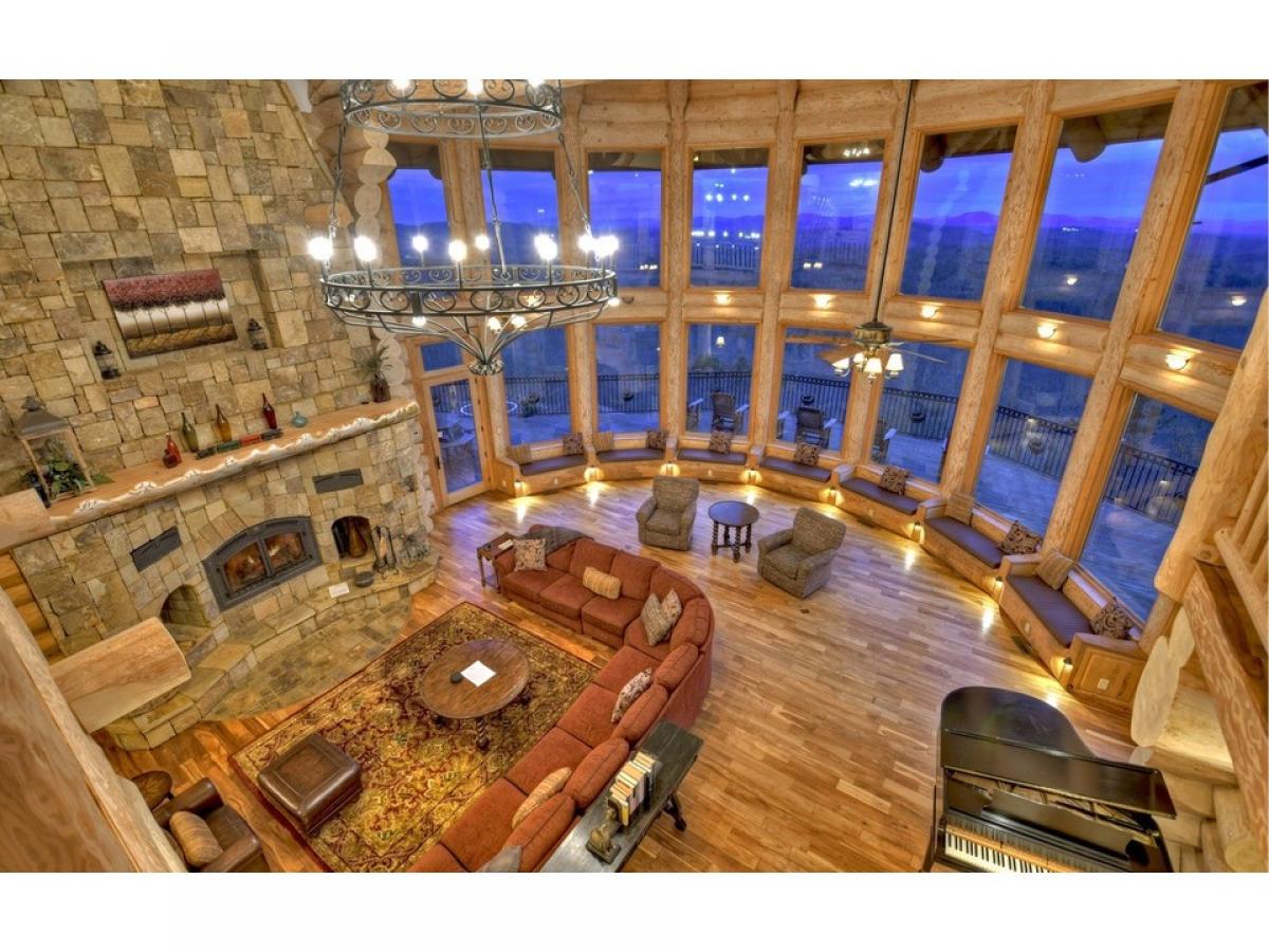 MAKE A STATEMENT IN THIS STUNNER.. British Columbian Cedar Log home is a masterpiece featuring every possible amenity.. Nearly Every Room stuns with a view of the world through these walls of glass, 5bdrm suites, 4.5baths, home theatre, rec room w/ full kitchen & wet bar, fitness room, elevator shaft, executive office w/ gorgeous built-ins, large loft, intricate carvings throughout, massive stone fireplaces,baths feature detailed tile work, carved glass & fireplaces above jacuzzi tubs, 2 car garage, helicopter pad, sky high massive timber portico, in-ground grande hot tub & vanishing edge pool overlooking 180 degree 100 mile unobstructed mtn views!!! This Mountain Top Manor offers the life of the rich & famous-great for full time estate, mountain getaway, or corporate retreat & more..very private all paved access, and large tract offers ultimate privacy at top of mountain...Excellent rental history and fabulously furnished...showcase home!
