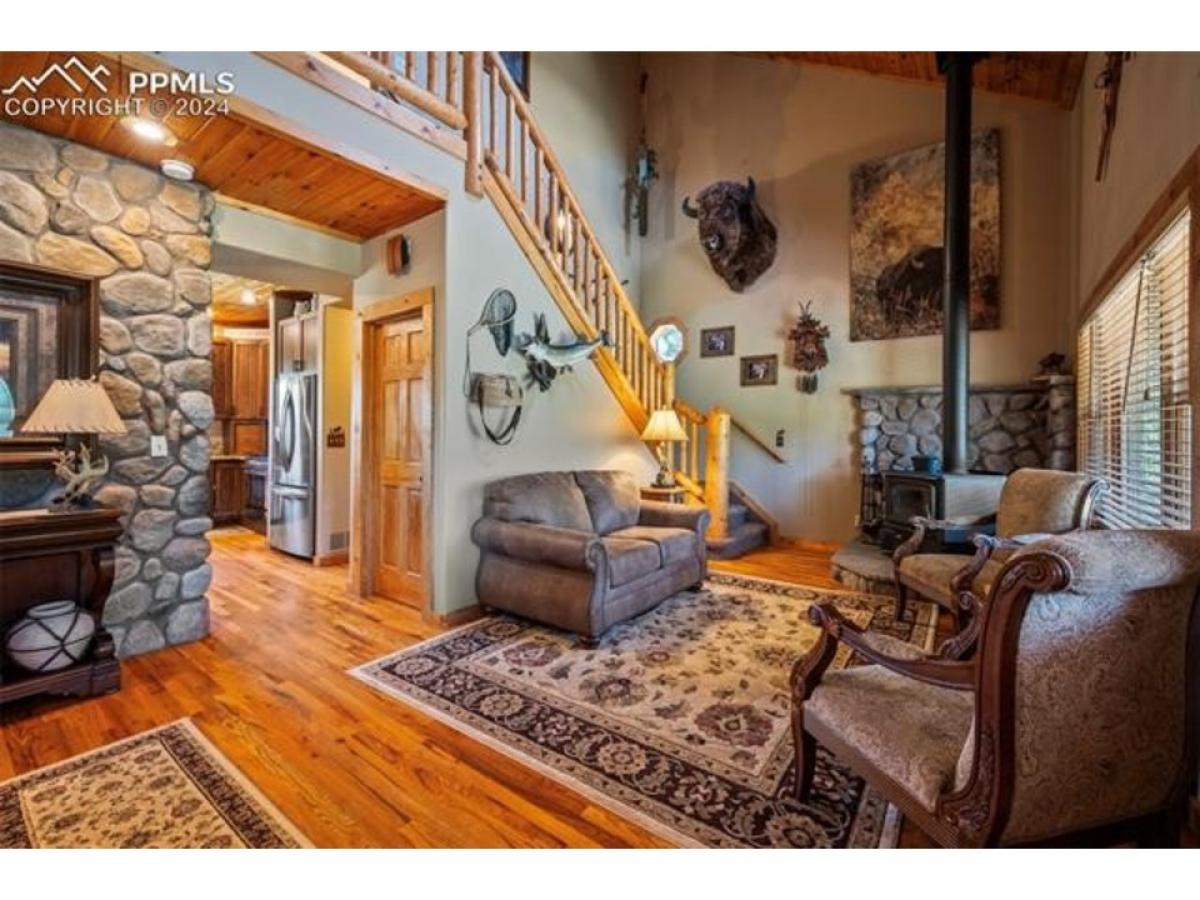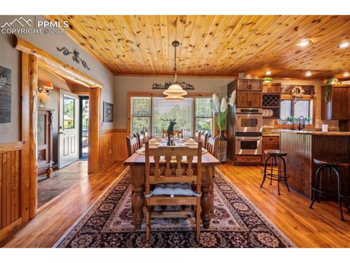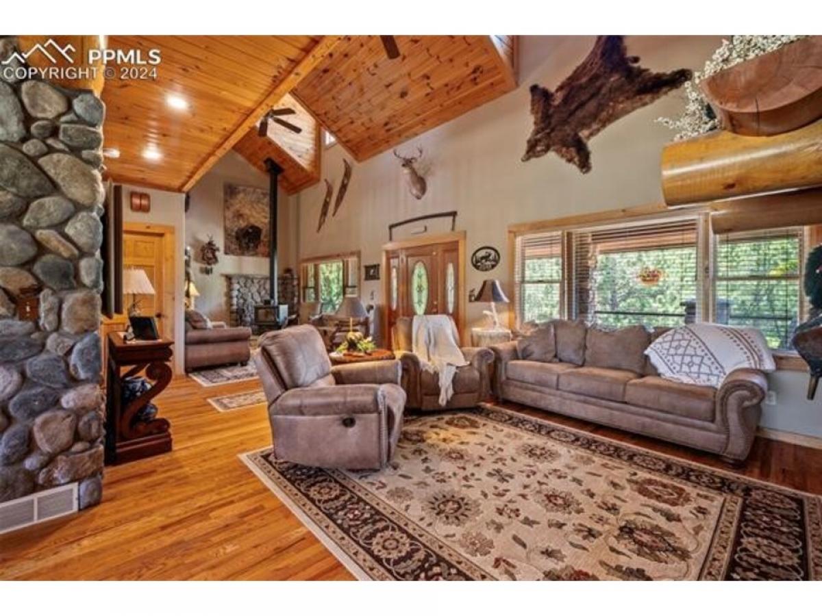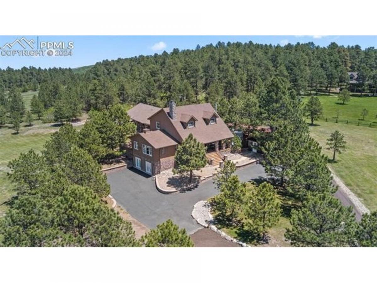 A Unicorn Alert! This property has two full houses on five acres with views connected by over 2,000 sq ft of deck in the back. As soon as you drive in on the long driveway, past the trees, you see the main house with its expansive, covered deck. The main house is built for entertaining with its wood burning fireplace, cozy living room, large dining room, and an island with seating in the kitchen. The kitchen has three gas ovens and a six burner stove top plus microwave. The primary bedroom on the main level includes a large bathroom with a soaking tub and a double vanity. There are two bedrooms upstairs connected by a Jack n' Jill full bath. There are two bedrooms downstairs plus a family room and game area. There is also a full bathroom. The basement is a walk-out through the second bedroom. The second residence is approx. 1800 square feet. Ranch style, one level, with two primary suites. The kitchen, dining, and living area are open with high ceilings. There is a hidden room in the second bedroom. The large laundry area leads to a stunning back deck with unbelievable sunsets. The elk and deer are frequent visitors, and there is an eagle family that lives on the hill in the back. The party barn is approx. 2,000 square feet of an all season place to relax and entertain. Great place for gatherings, meetings, and parties. There is a commercial kitchen with a refrigerator, freezer, smoker, ice maker, gas range, and sink. The bar is big enough to serve food as well as pour drinks from the hidden liquor cabinet. The fire pit is very enjoyable to sit around on a chilly evening . The furniture is for sale in all three buildings plus the big tractor in the garage. Garage does have room for four cars and/or a big truck. It's deep enough if you need workshop space, and there is a half bath with a sink. Neighborhood families can opt into D38. Four miles from Monument. Five minutes from the I25 to the west or HWY 83 to the east.