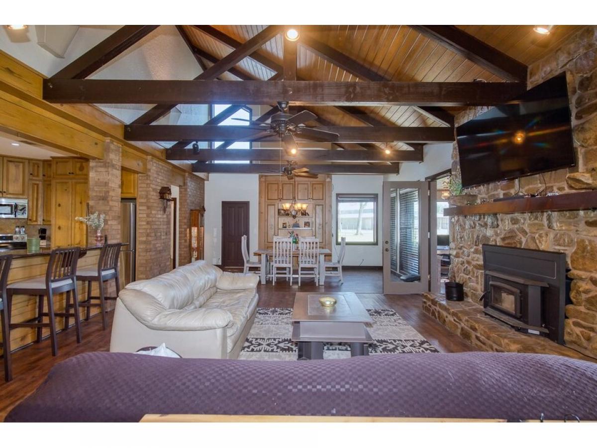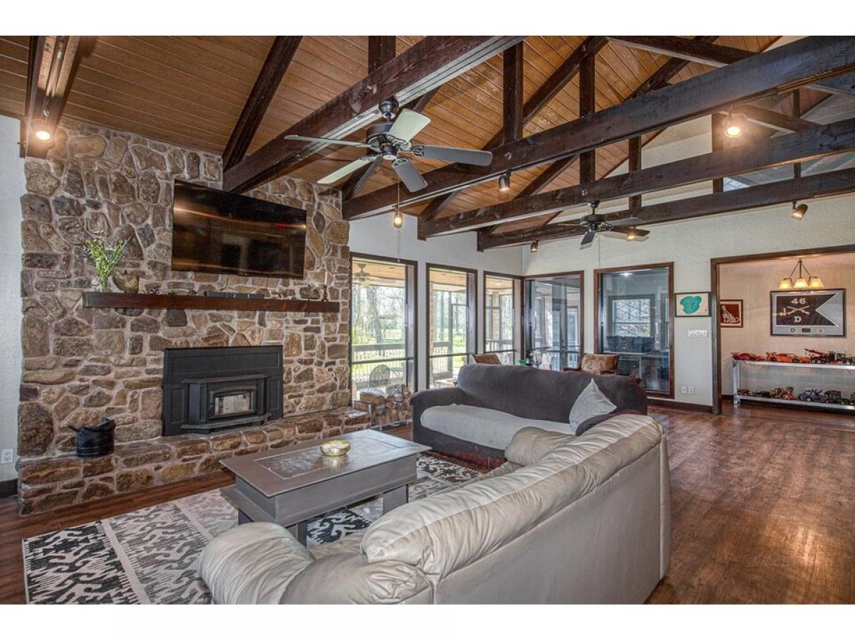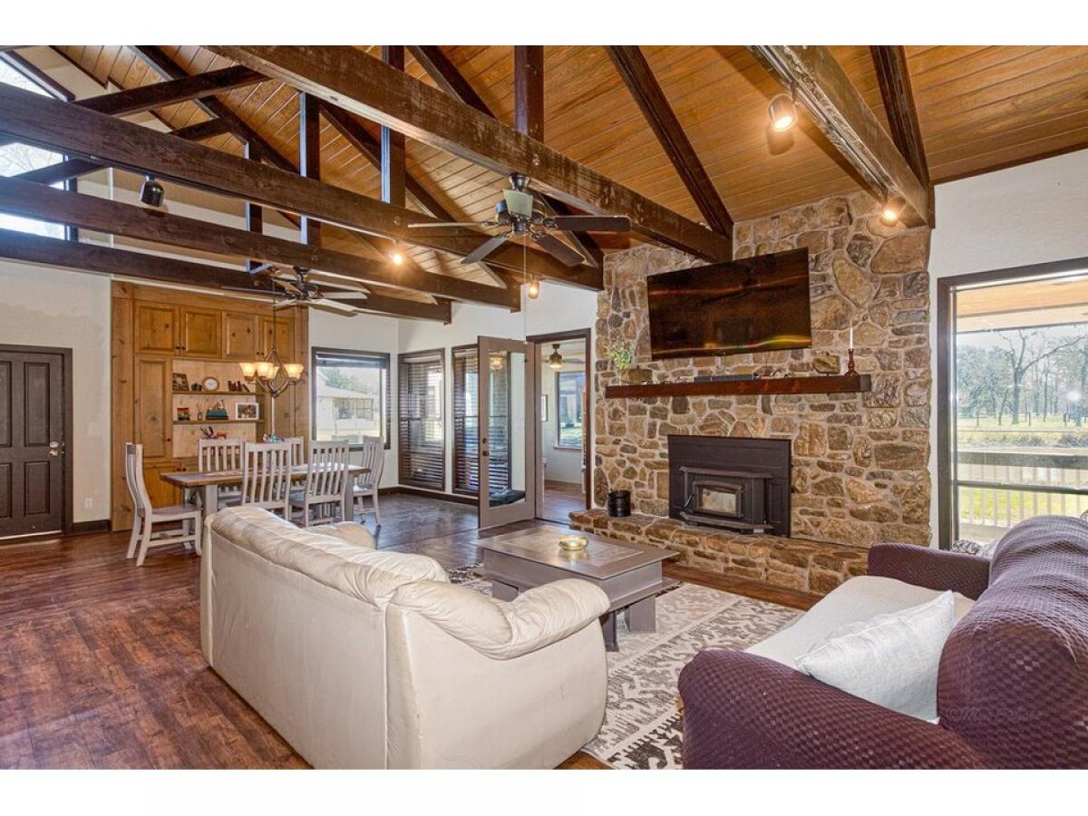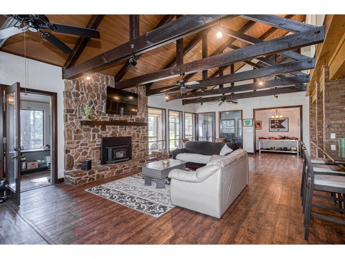 Stunning estate home on nearly 6 acres, offering the perfect blend of country living and modern luxury. This sprawling one-story residence features a spacious family room with a vaulted, wood-beamed ceiling and a striking stone hearth. The open epicurean kitchen boasts granite countertops, stainless steel appliances, and recessed lighting. There are two dining areas, one off the kitchen and the other in the family room, offering plenty of space to host family and friends. Additional highlights include a mud room, a versatile sunroom or craft room, a game room, and four generously sized bedrooms. Outside, enjoy multiple patio areas, a covered back porch, serene pond views, and a stable area. A large workshop provides ample space for projects and storage. Expansive acreage offers endless possibilities for outdoor enjoyment.
