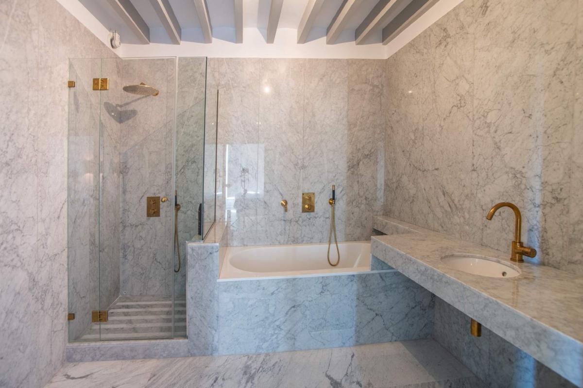 Einer der exklusivsten Palaste in Palmas Altstadt, direkt neben der Plaza de Cort mit dem Rathaus gegenuber und Luxushotels wie dem Hotel Cort und dem Hotel Mama. Das Gebaude besteht aus drei Wohnungen und einer grossen Dachterrasse mit fantastischem Blick uber Palma. Die Dachterrasse kann geteilt werden, so dass jede Wohnung einen privaten Teil bekommt. Hier wohnen Sie zentral und dennoch in ruhiger Lage. in der Nahe des Strandes, der Strandpromenade, der Restaurants und der beruhmten Einkaufsstrasse Paseo de Born. insgesamt uber 650 qm, aufgeteilt auf 6 Etagen in einem der hochsten Gebaude Palmas. Apartment Exclusivio: Schones Duplex-Apartment anno 1899 mit antiken Details. Grosse Kuche und Essbereich. Treppe hinunter zum Weinkeller und Waschkuche. Auf dieser Etage befinden sich zwei Schlafzimmer und ein Bad mit Dusche. Treppe zur oberen Etage mit drei weiteren Schlafzimmern, zwei davon mit eigenem Bad. Wohnung Tres: Stilvolle und helle Wohnung mit Kuche und Essbereich. Zwei Schlafzimmer mit eigenem Bad. Ein zusatzliches Zimmer mit eigenem Bad mit Dusche. Drei franzosische Balkone. Wohnung Cielo: Stilvolles und helles Appartement mit Kuche und Essbereich. Zwei Schlafzimmer mit eigenem Bad. Separates Bad mit Dusche. Studio-Apartment mit Kuche und Bad. Zugang zur Dachterrasse. Es gibt Plane, einen Aufzug im Gebaude zu installieren.