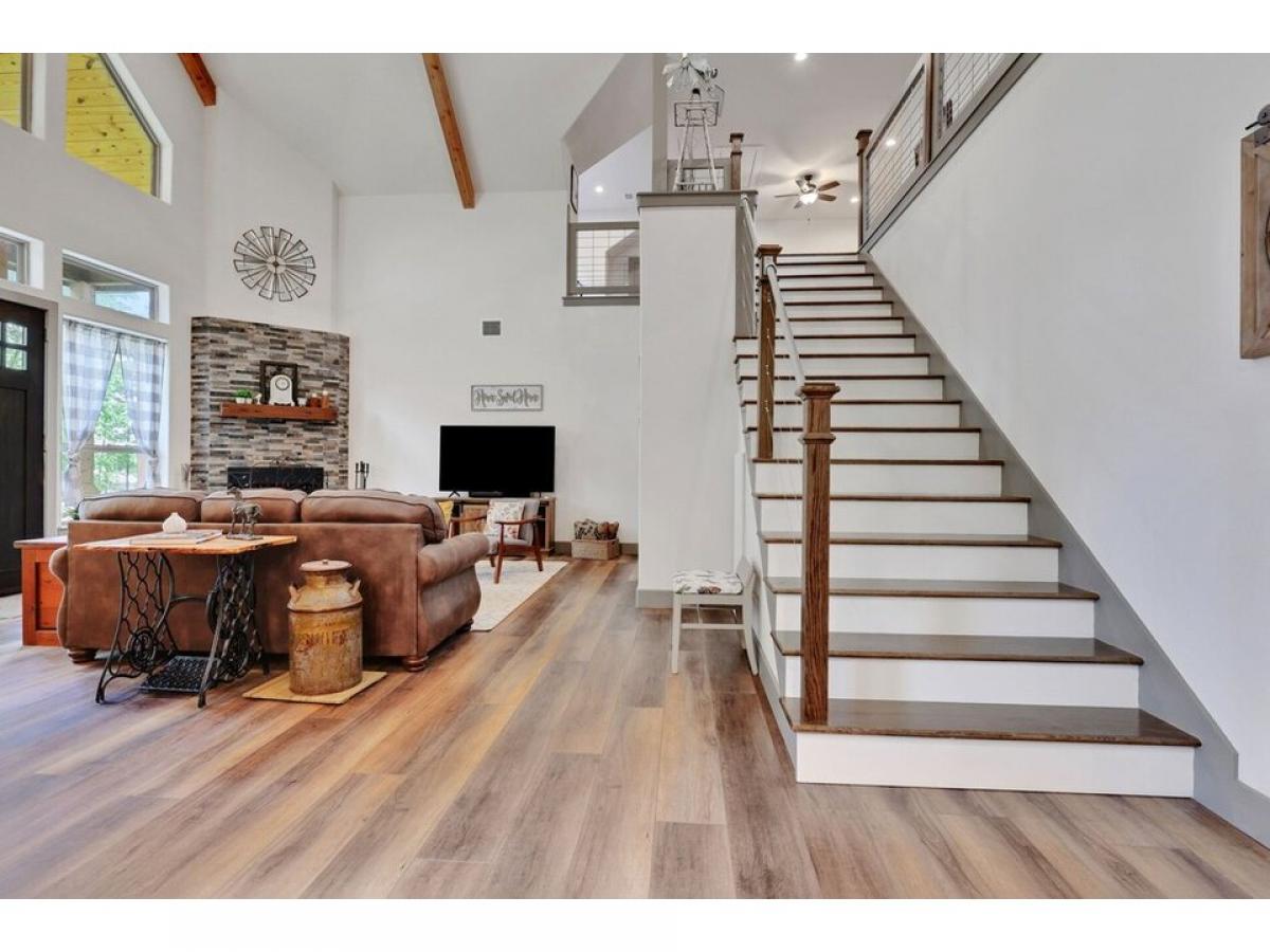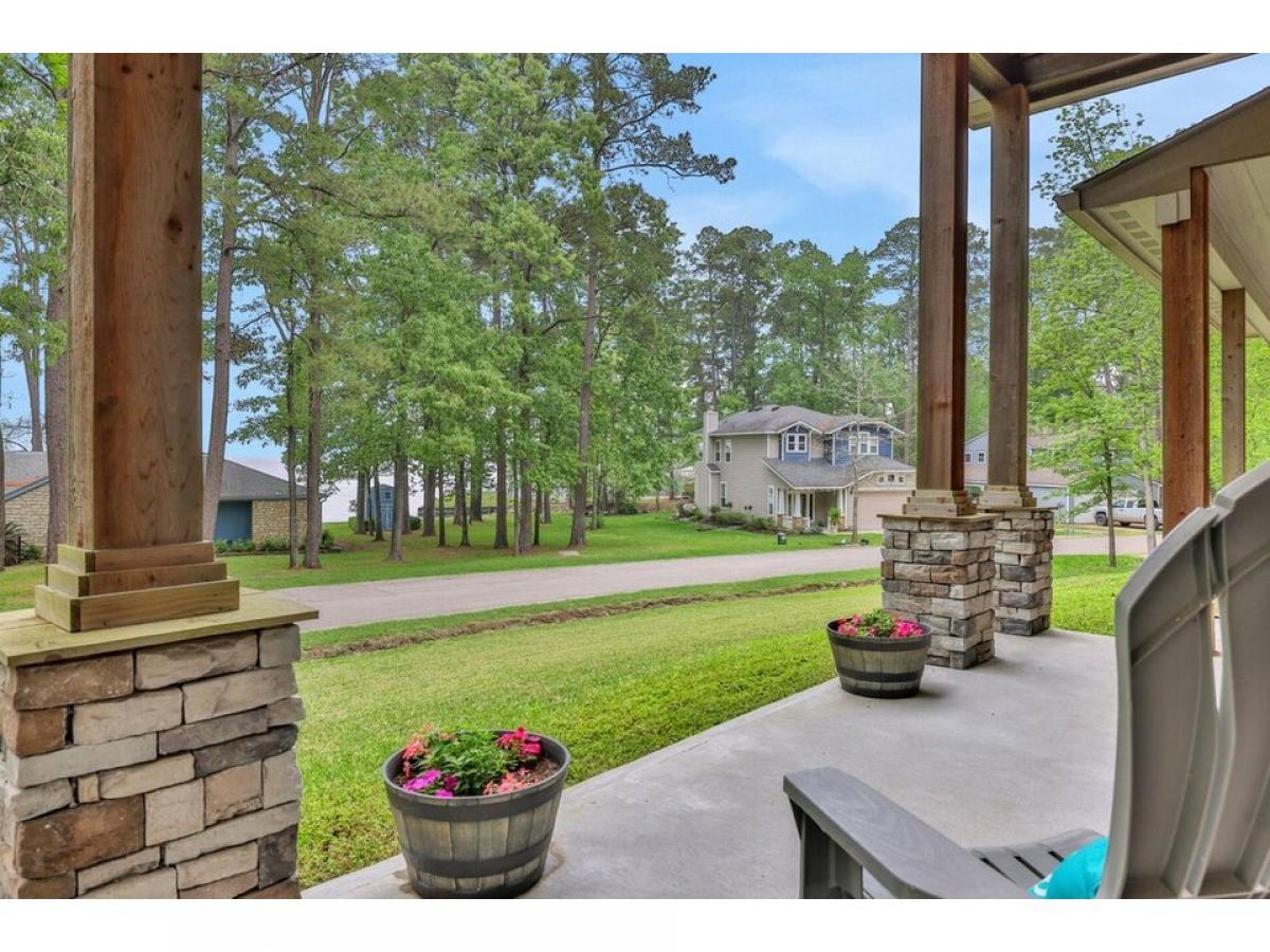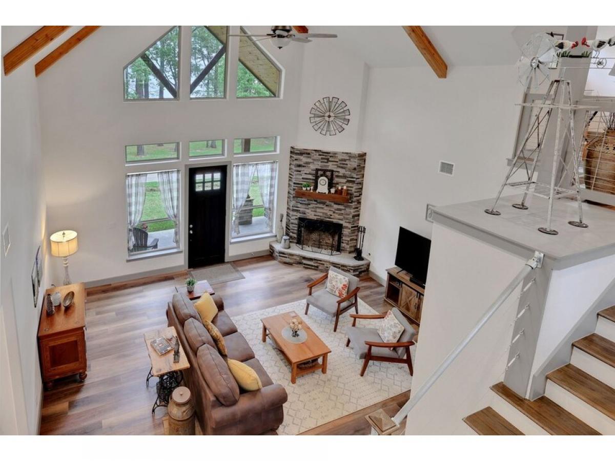 Experience the beauty of lakeside living in this water view home! Relax on the expansive front porch, which wraps around one side, offering beautiful lake views and the soothing sounds of the lake. Step inside to a bright and airy living space featuring two-story cathedral ceilings with cedar wood beams. The island kitchen is perfect for entertaining, boasting quartz countertops and ample cabinet space. The home offers lake views from almost every room! Built with quality and efficiency in mind, this home sits on an engineered slab and includes foam insulation, a tankless hot water heater, LVP waterproof flooring, zoned AC, a saltwater filtration system, and energy-efficient low E double-pane windows. The spacious primary suite is located on the first floor. Upstairs there is a spacious second family room, guest bedroom, full bath and sun room which could be used as a third bedroom. The detached three-car garage provides plenty of storage for vehicles, lake toys, and more.