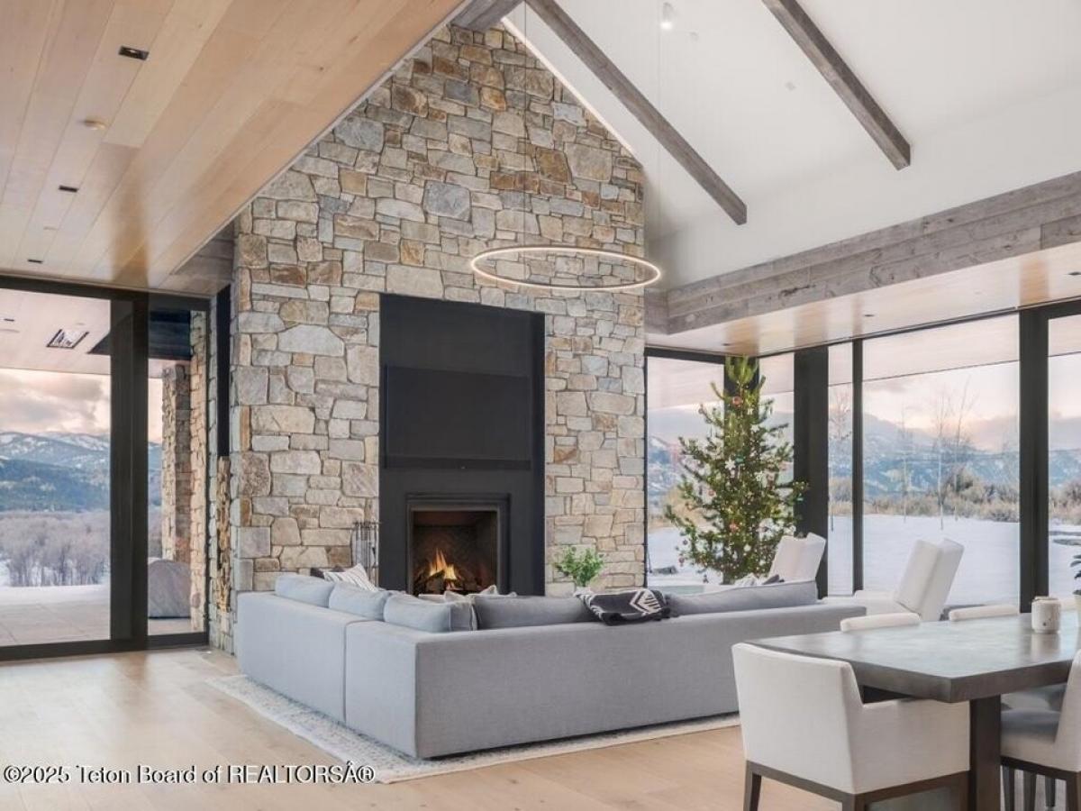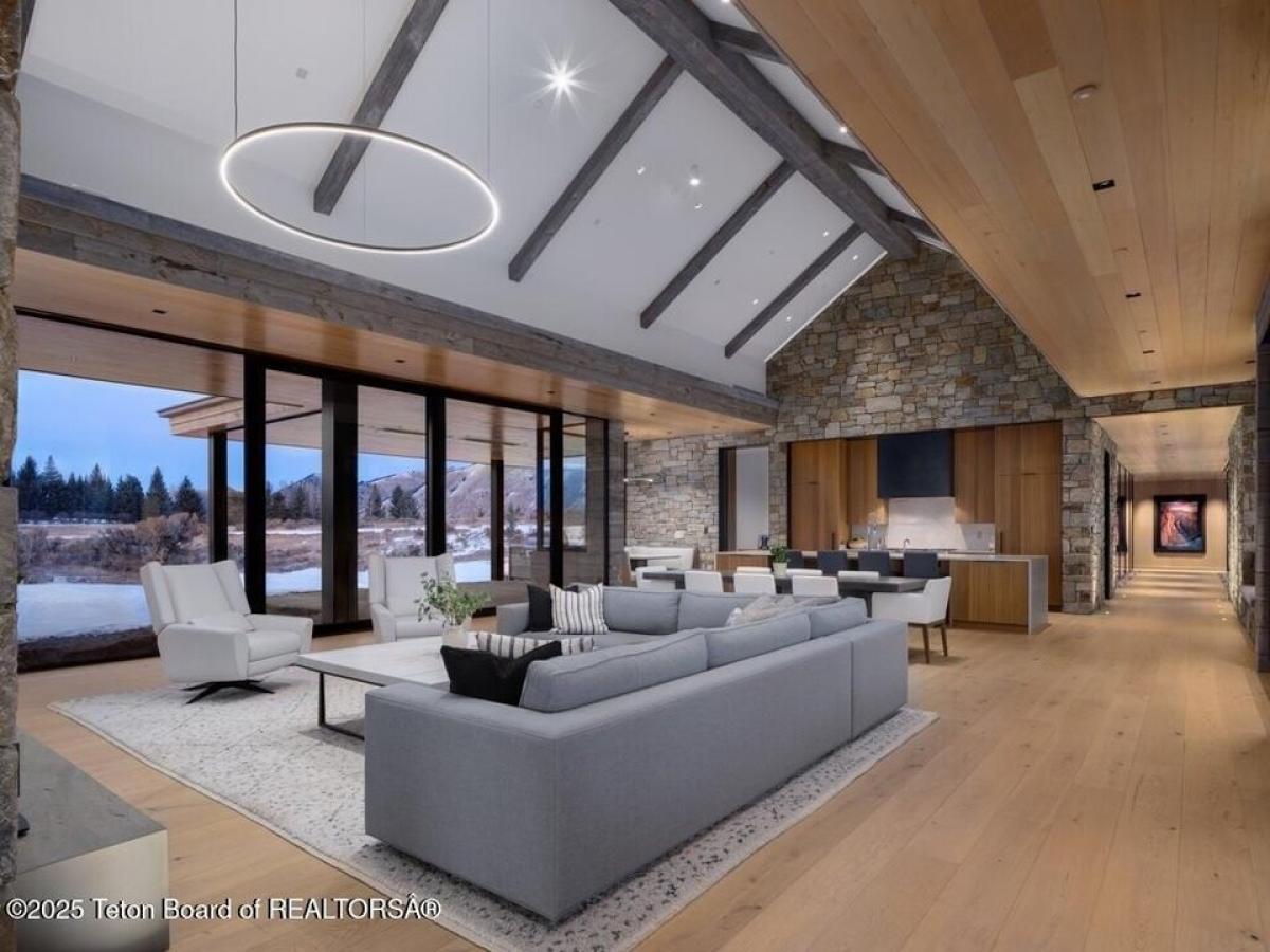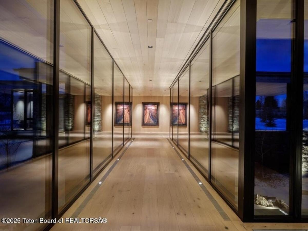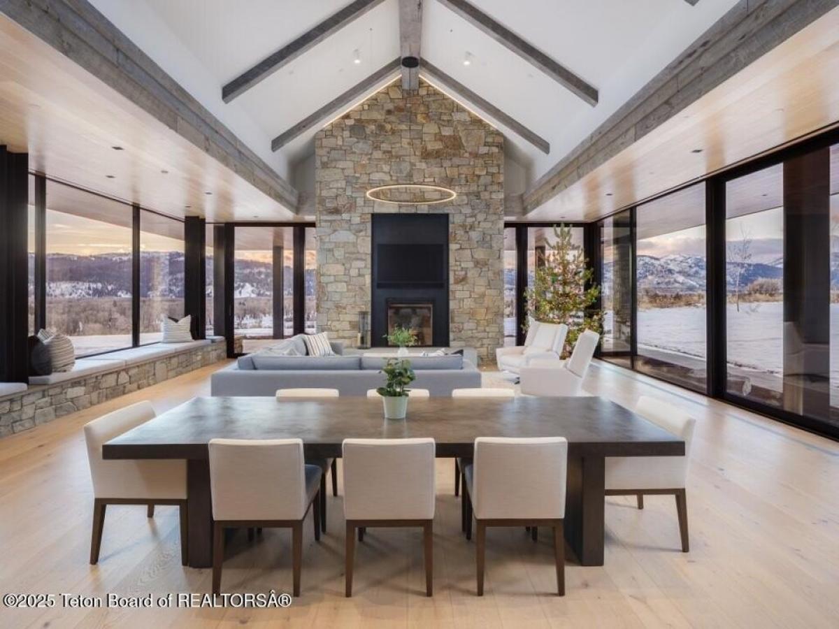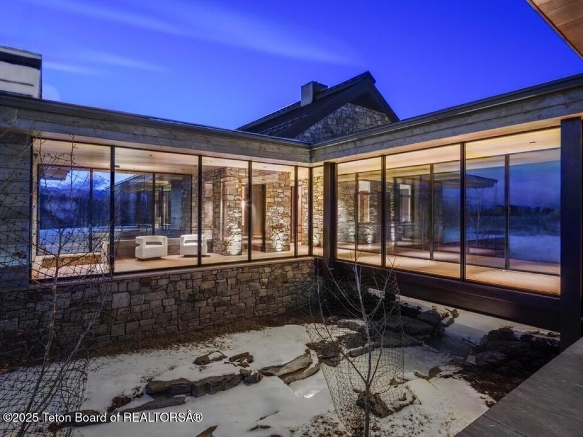 Reid Smith Architects designed this newly-completed contemporary wood and rock home on 7.68 acres in the Matheson Hill subdivision just south of 3 Creek Ranch.On a plateau with 200 degree views to the west, the property enjoys unobstructed mountain views from Munger to a peek-a-boo view of the Grand Teton. The home is comprised of 4 bedrooms with en-suite bathrooms, 2 offices, a full spa with steam and dry saunas, stainless steel competition swimming pool and hot tub, and workout facility. Every detail was considered: 11 foot triple-paned Zola windows and lift-and-slide glass doors, 17 foot vaulted ceilings, 4 fireplaces, 1,900 sqft 4-bay garage, integral shades both inside and out, marble bathrooms, bunk room, media room, and a 1 suite plus bunk 1000 sqft guest house with carport. A quiet water feature flows underneath the bridge to the main home. The systems are of the highest quality standard, featuring geothermal radiant floor heating with forced air backup (air conditioning, moisture control), Lochinvar boiler amp; distribution system, Nortec Resdelux direct injection HVACs, Zehnder HRV system entirely separate from HVAC system, 3 separate wells - domestic water, geothermal discharge, landscape irrigation, and individual HRV for garage not tied to rest of home. Solar and battery storage include 4 Tesla Powerwalls as electric backup for home and 25kw solar panel system on both main and guest house tied to the Tesla system. Enjoy the highest quality Home Automation System with Crestron controls for AV, shades, locks, garage doors, security, temperature control and water feature, in addition to a dedicated media room and basement rec room each featuring 98quot; TV and speaker system.